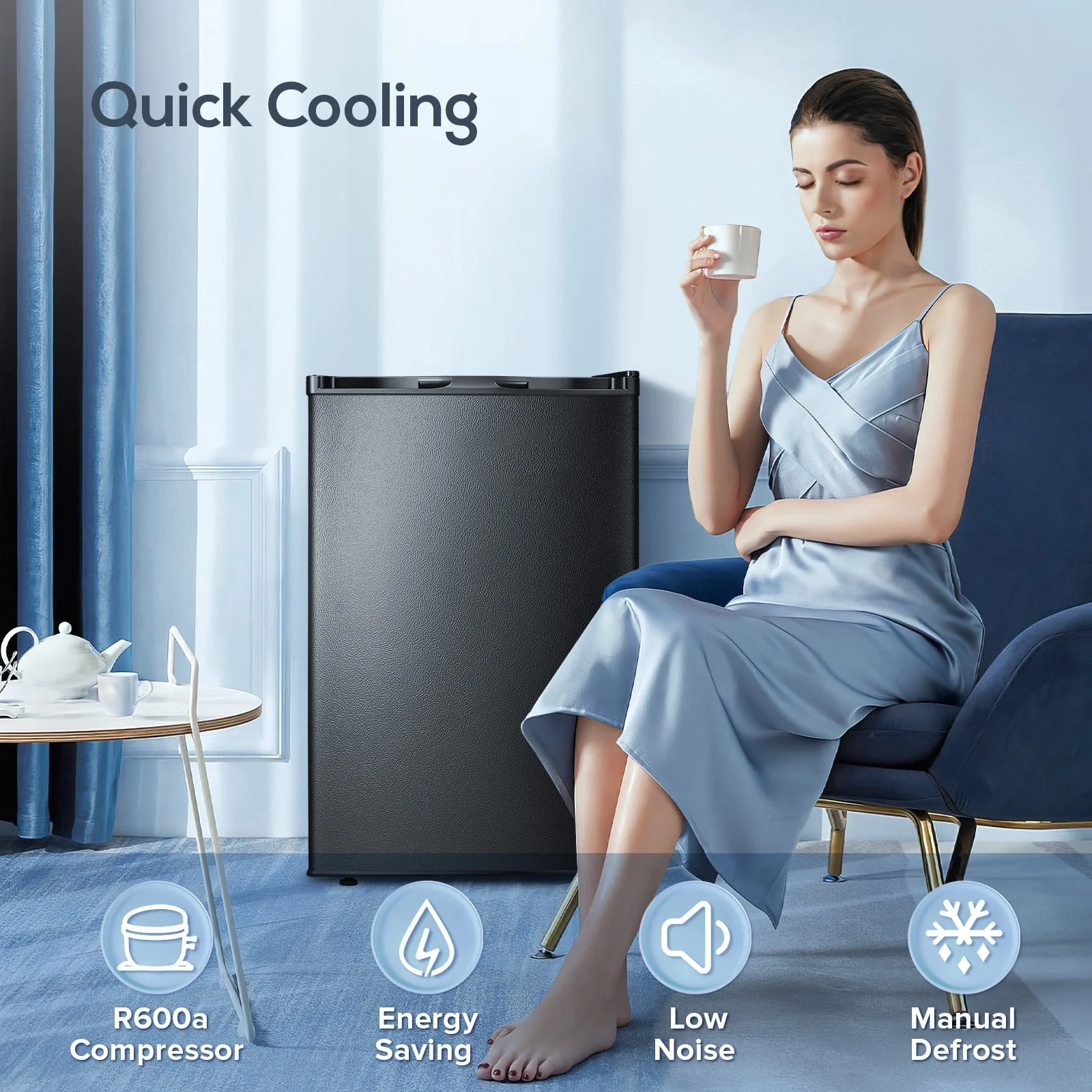 - R600a compressor delivers rapid cooling at merely 0.66kWh/day (70%+ energy saving vs conventional models). Ultra-low 38dB operation - quieter than library whispers - ensures undisturbed sleep in studio apartments.