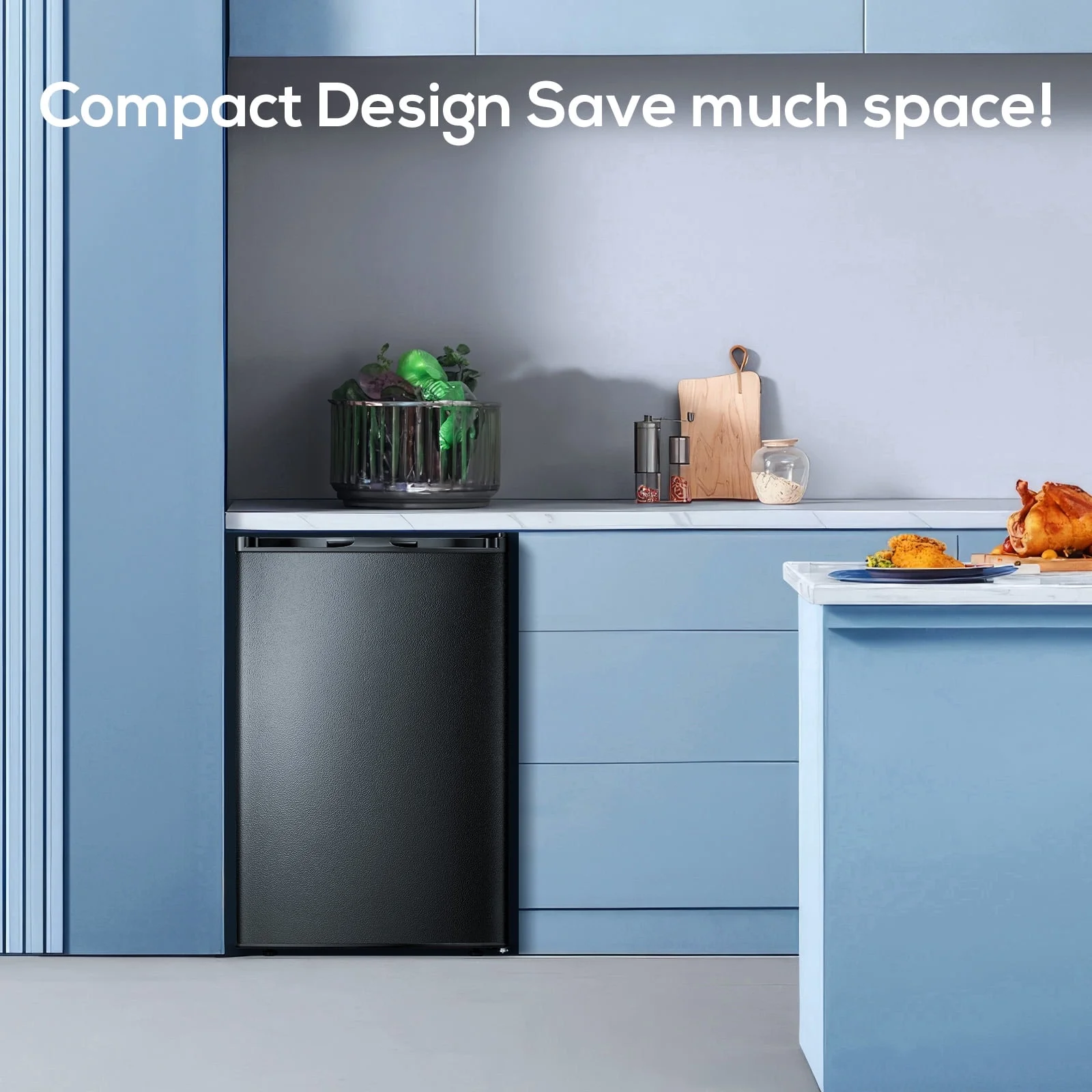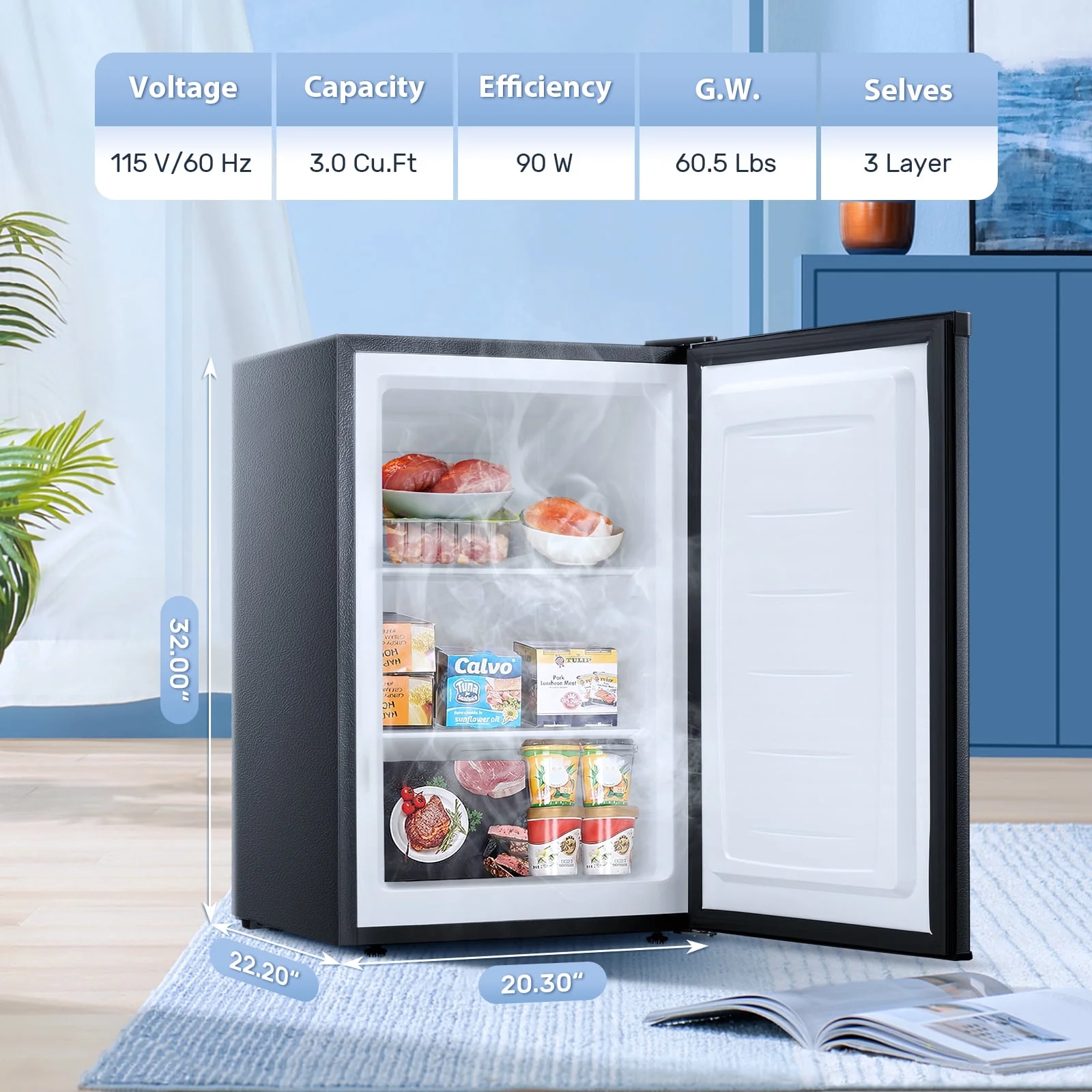 - Measuring 22.04"W x 32.20"D x 33.66"H with 7.0 cu. ft. capacity, this compact freezer fits effortlessly in kitchens, dorms, offices or tight spaces. Its space-efficient rectangular shape maximizes storage while occupying minimal floor area.