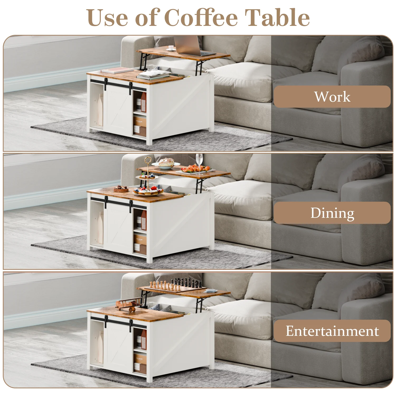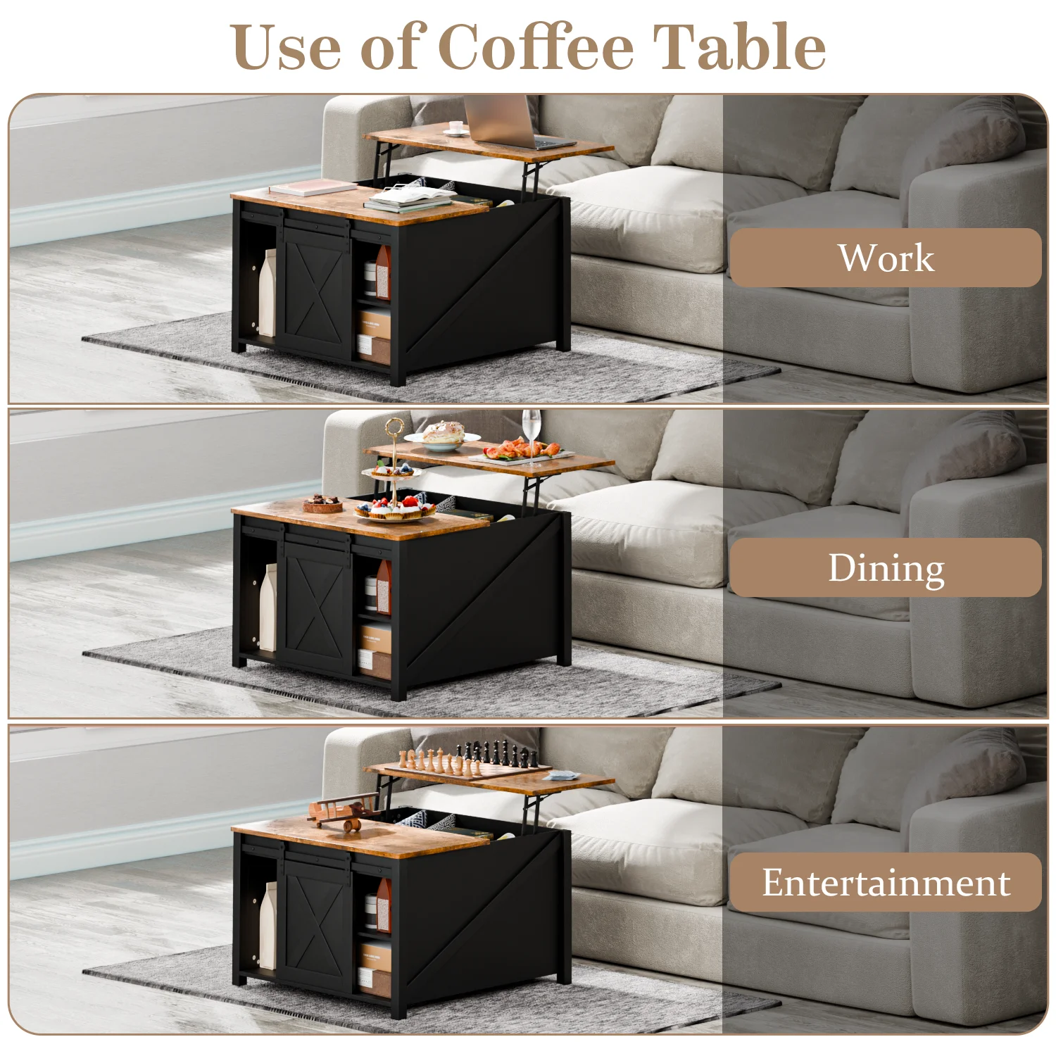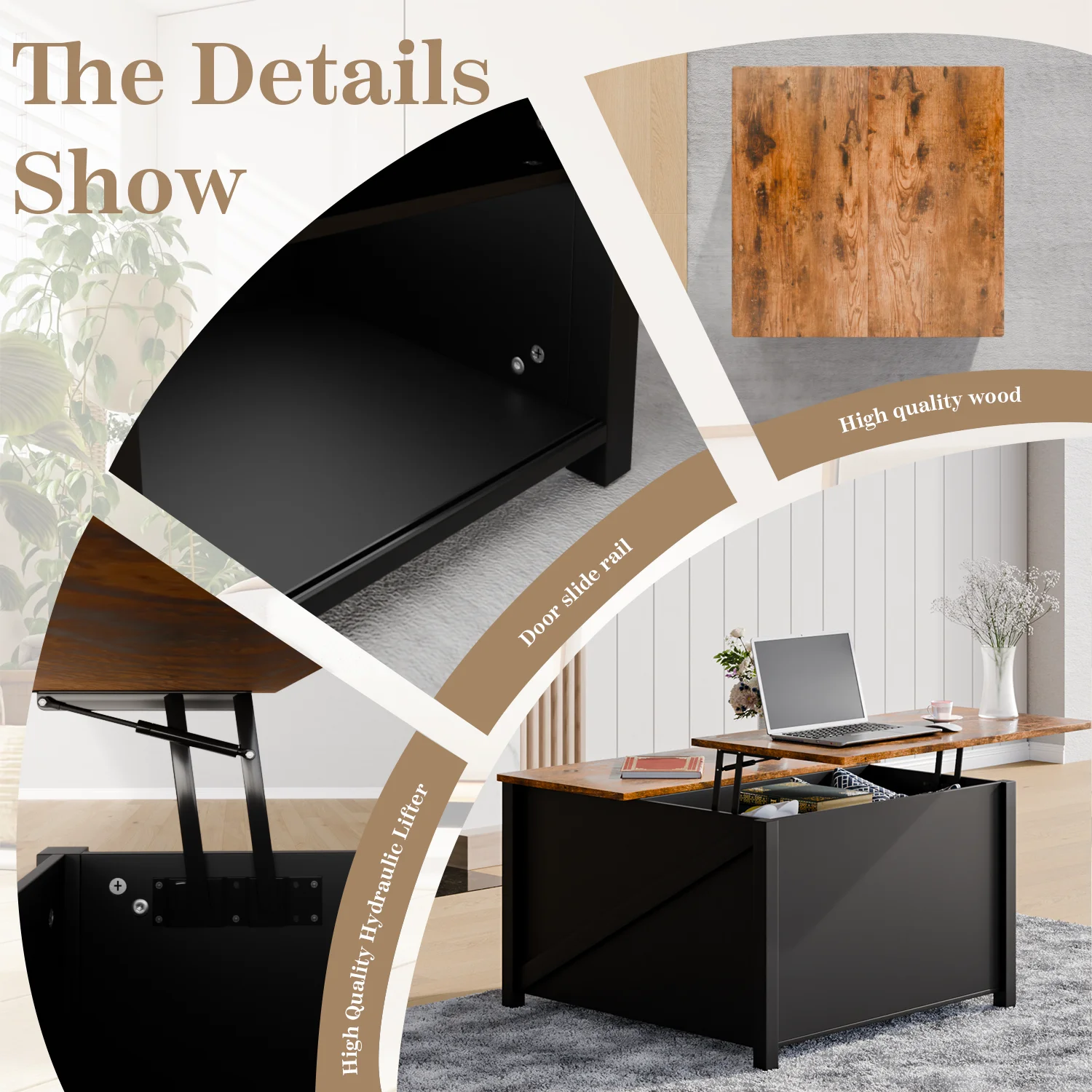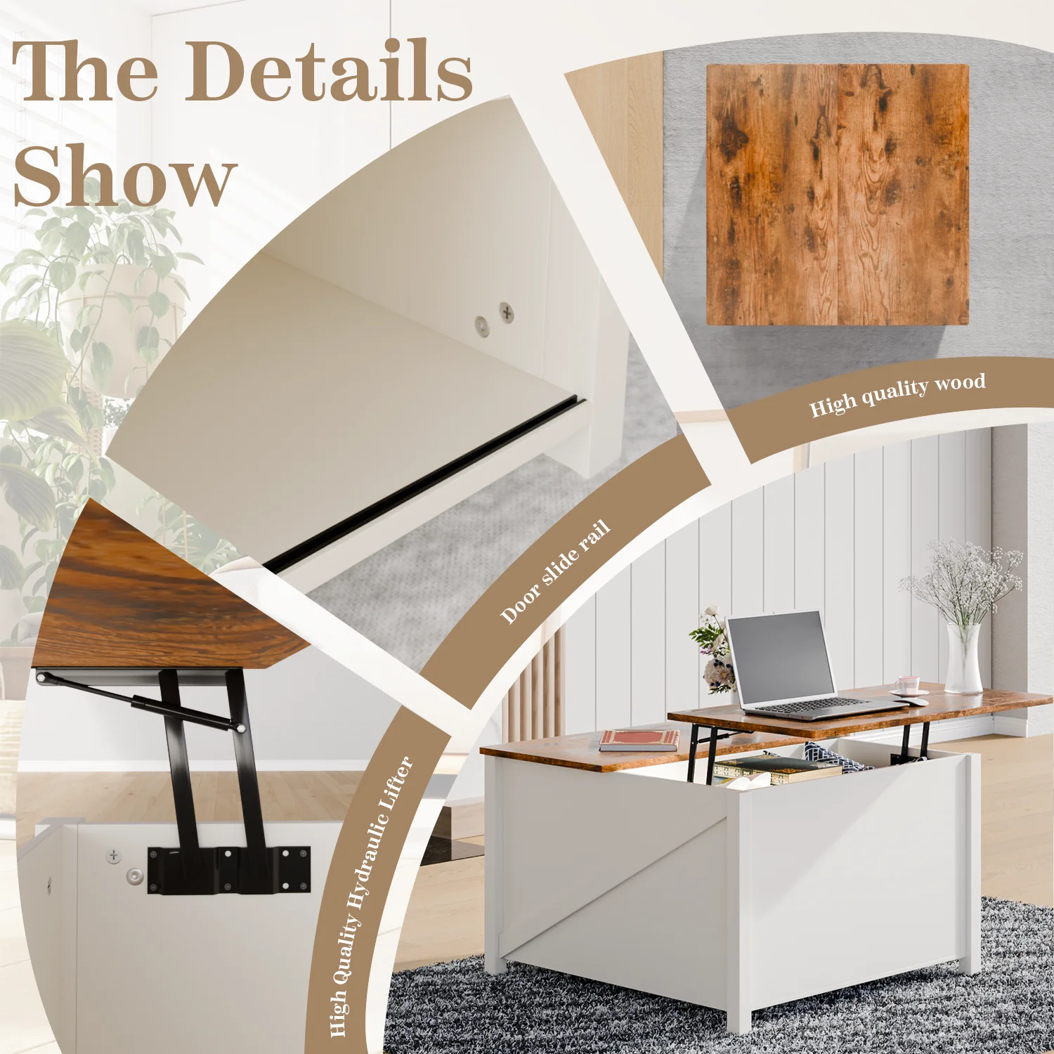 - ? ��Liftable Top Design��This coffee table features a high-quality lifting mechanism for smooth and safe lifting and lowering. The coffee table lift top can be lifted from 19.6 inches to 28.3 inches, allowing the table top to be raised or lowered effortlessly and noiselessly.Half of the table top can be lifted up and moved forward to create two multi-functional workspaces, allowing you and your family to use the table separately without interruption.The coffee table is designed with a high quality lifting mechanism that provides a smooth and safe lifting mechanism.