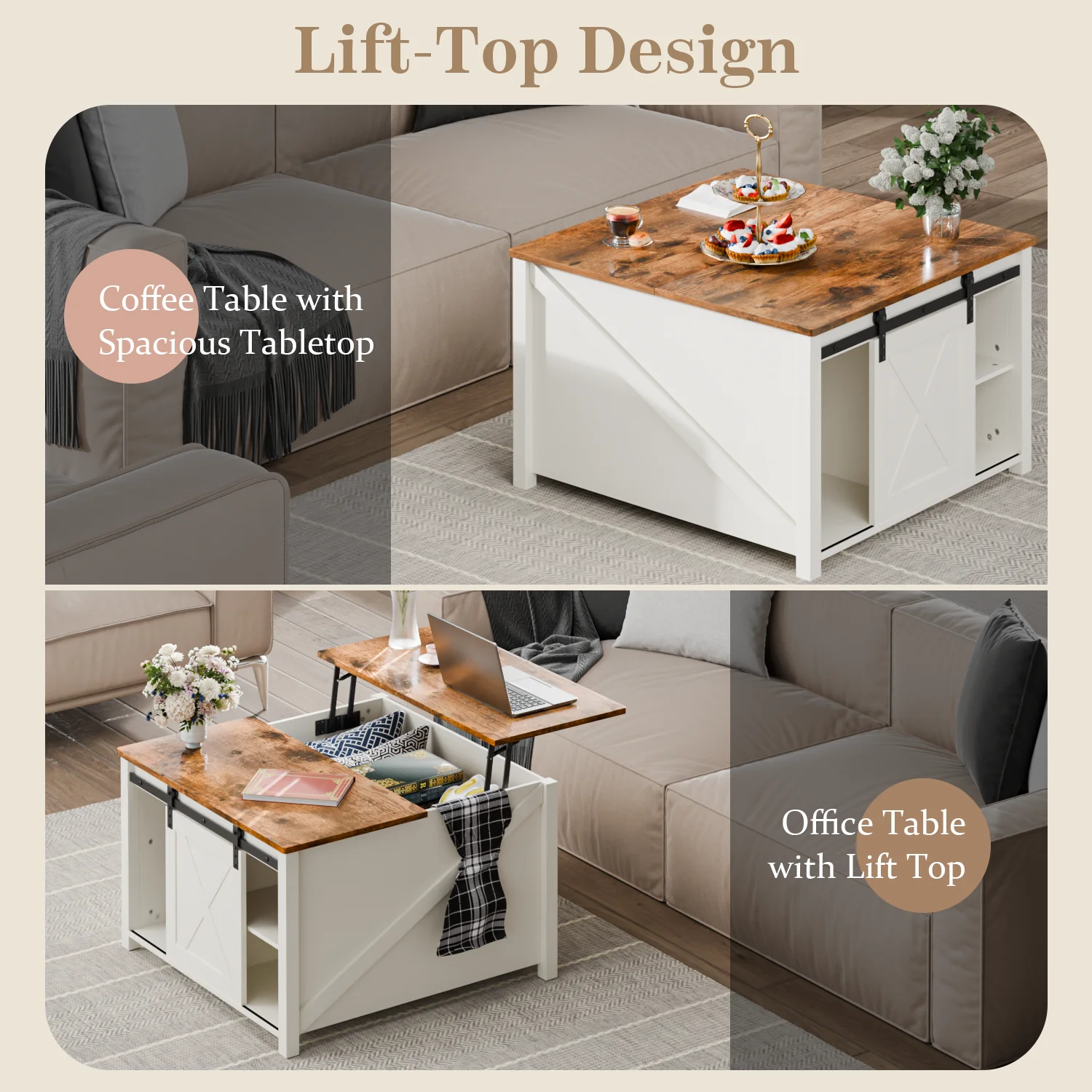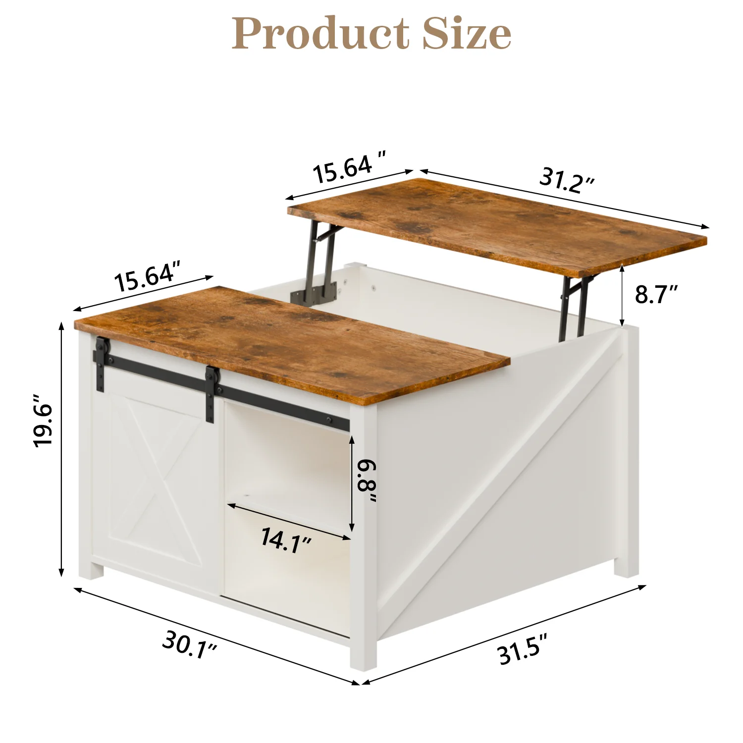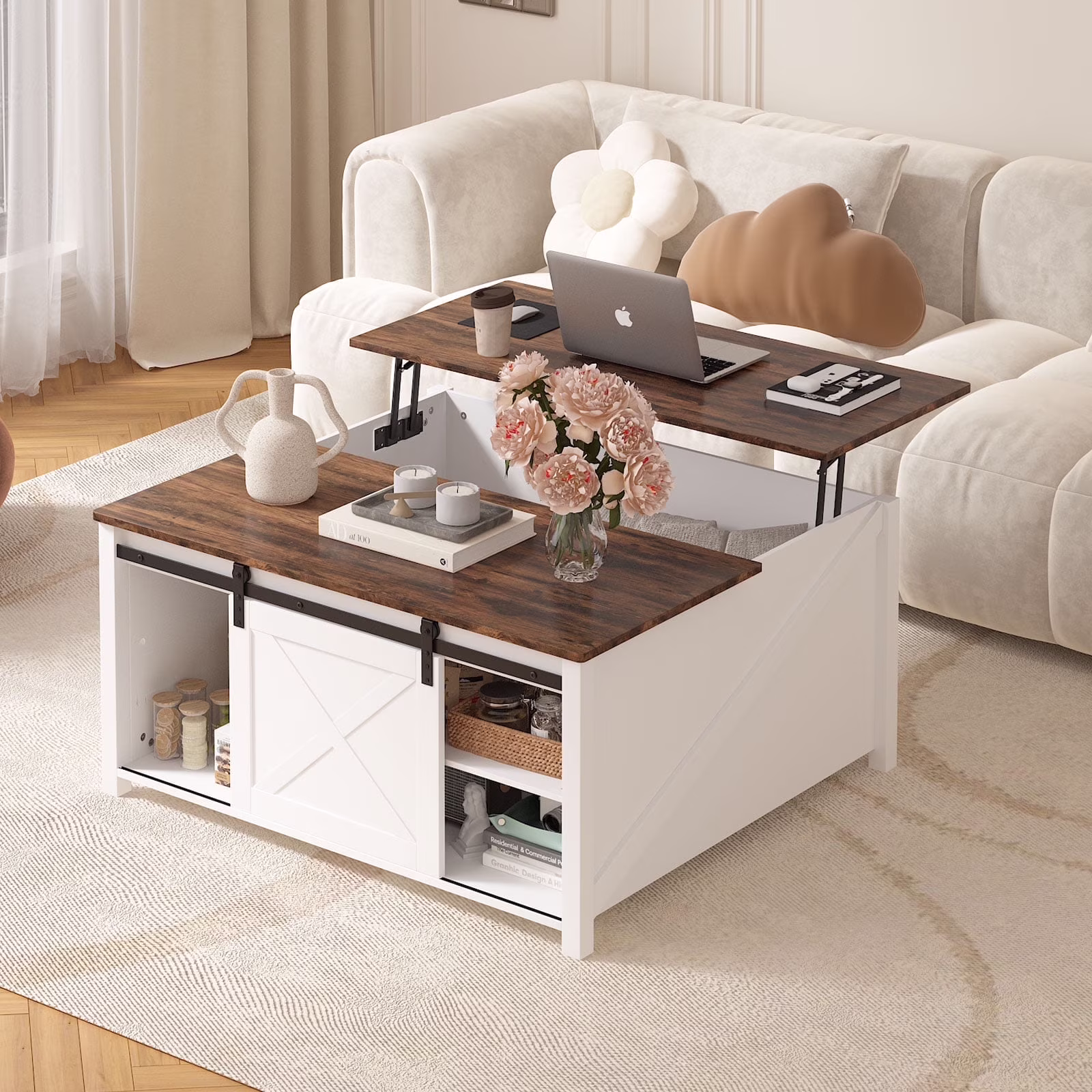 - ? ��Liftable Top Design��This coffee table features a high-quality lifting mechanism for smooth and safe lifting and lowering. The coffee table lift top can be lifted from 19.6 inches to 28.3 inches, allowing the table top to be raised or lowered effortlessly and noiselessly.Half of the table top can be lifted up and moved forward to create two multi-functional workspaces, allowing you and your family to use the table separately without interruption.The coffee table is designed with a high quality lifting mechanism that provides a smooth and safe lifting mechanism.