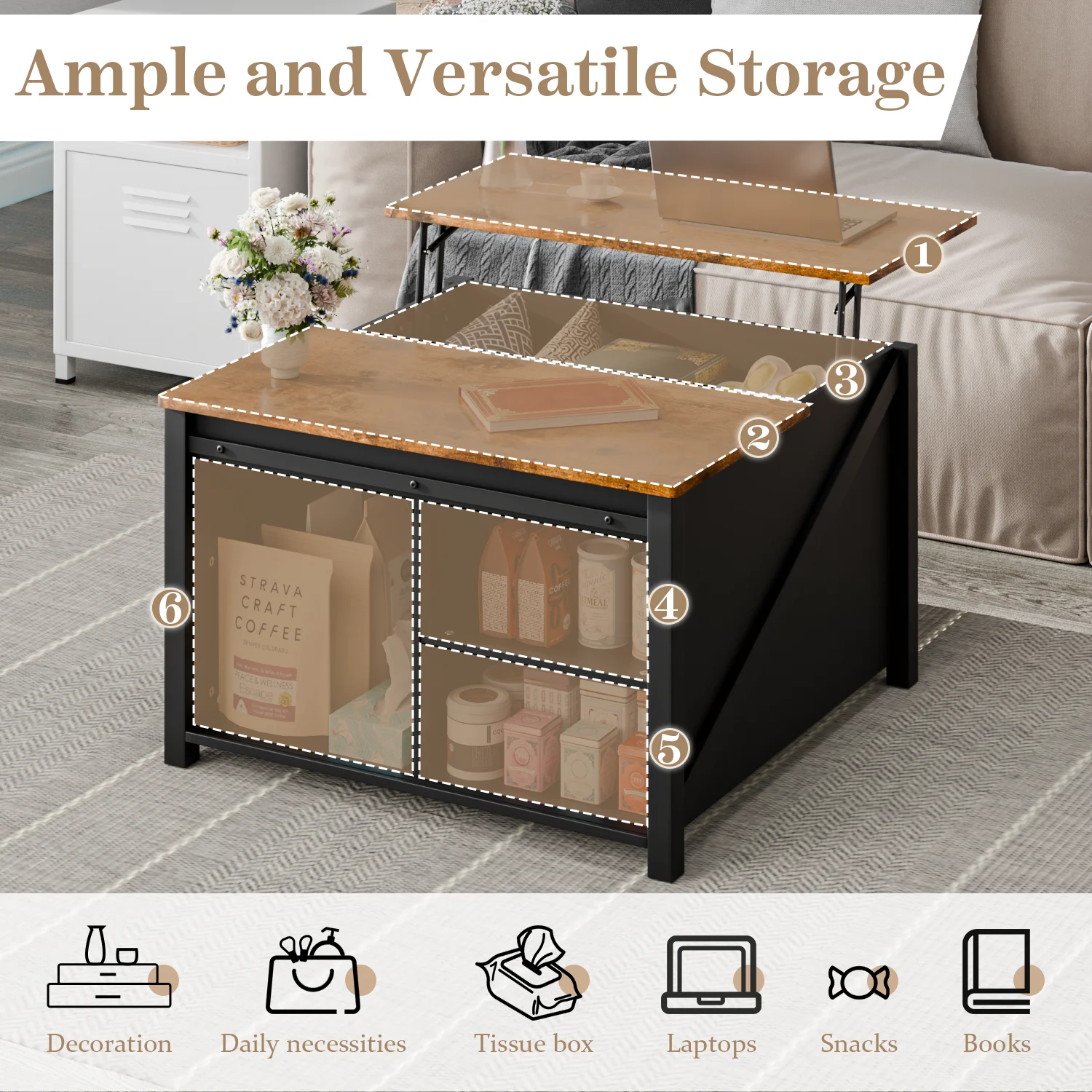 - ?��Spacious Hidden Storage Space�� This coffee table features a hidden oversized secret compartment under the liftable top panel, large enough to store laptops, blankets, magazines, pillows, books, toys and other large items to avoid clutter. The coffee table also has 3 different sized open compartment storage cabinets for storing frequently used items of different sizes and is fitted with removable door panels to keep them away from dust, making your living room more spacious, neat and clean.