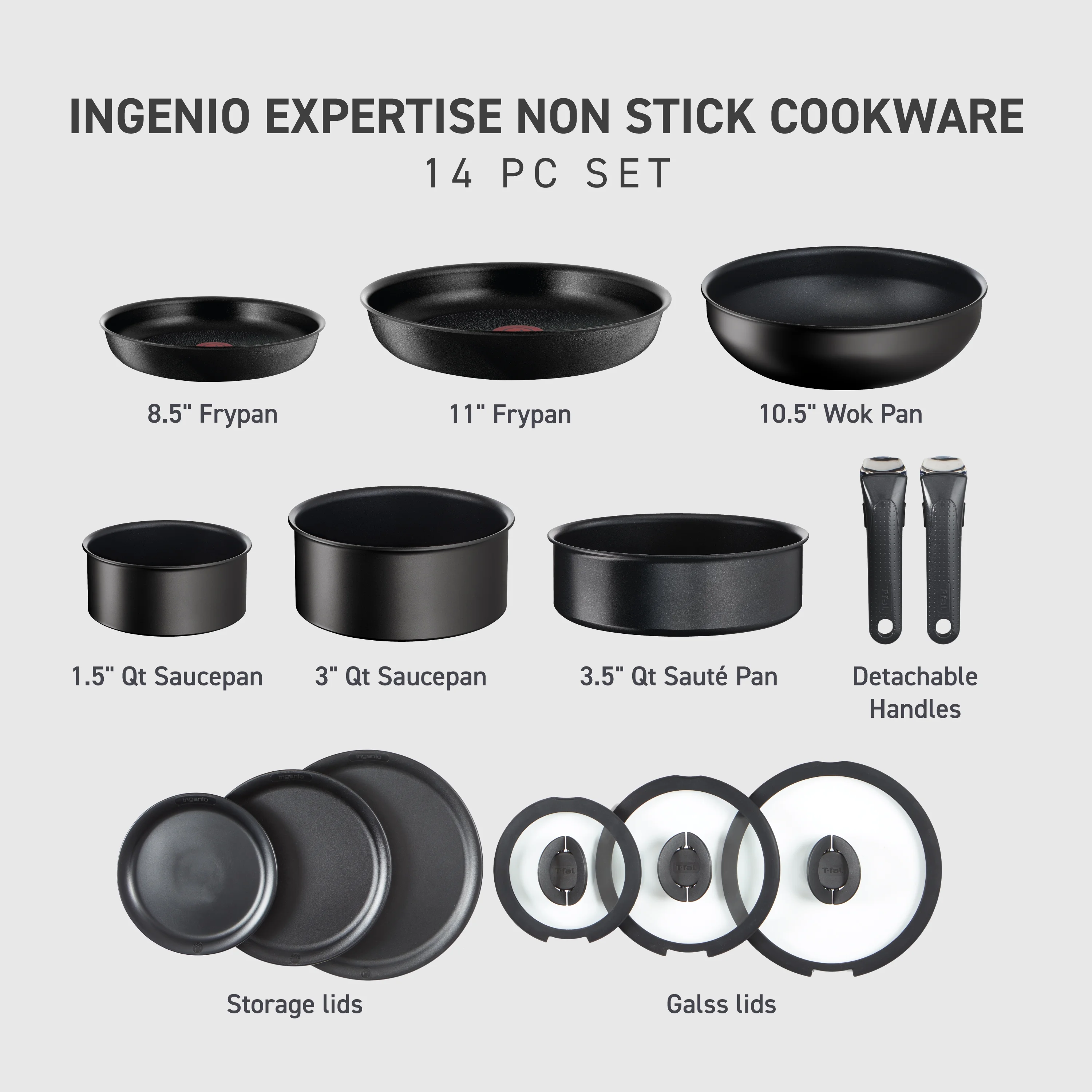 - All You Need, Stacked Up Neatly: The set includes 8.5 and 11-inch Frypans, 2qt covered Saucepan, 3qt covered Saucepan, 3.5qt covered Sautepan, 10.25 inch Wok Pan, 2 detachable handles, and 3 storage lids. Stack height without handles and lids is 5 inches.