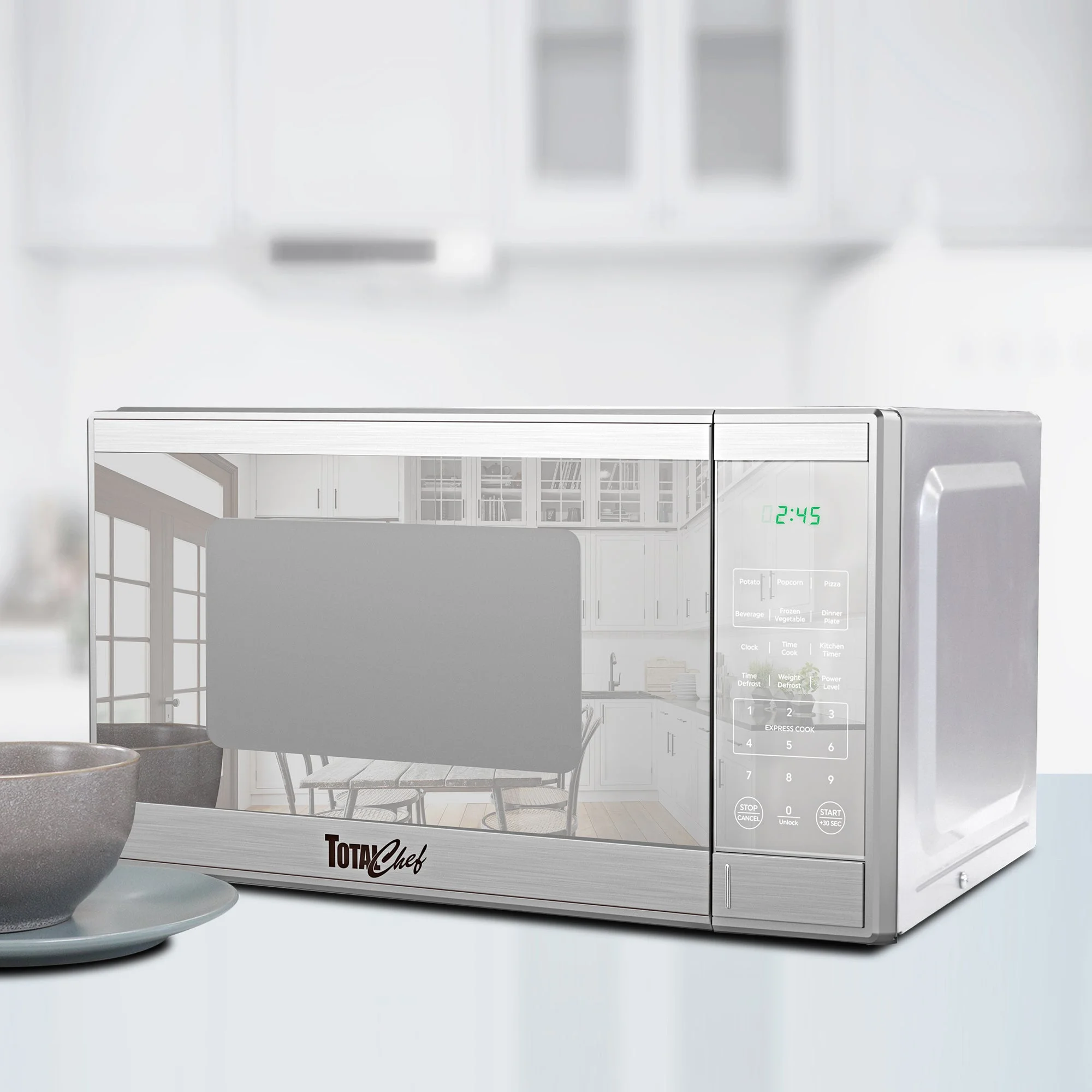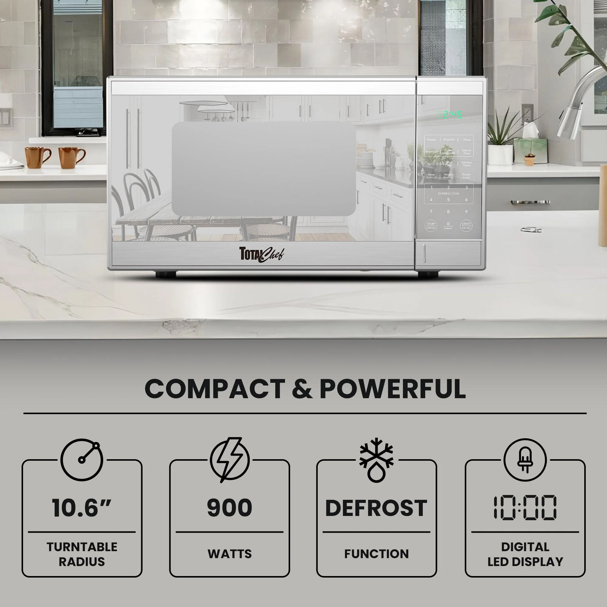 With its durable stainless steel exterior, sleek mirrored finish, and pre-set cooking functions including popcorn, potato, pizza, frozen vegetable, beverage, and reheat, this 0.9 cu ft microwave is ideal for apartment kitchens, office lunch rooms, cottages, or dorms. The compact and powerful 900W unit also features digital touch controls, clear LED display, kitchen timer, and digital clock, plus defrost and express cook options for added convenience.