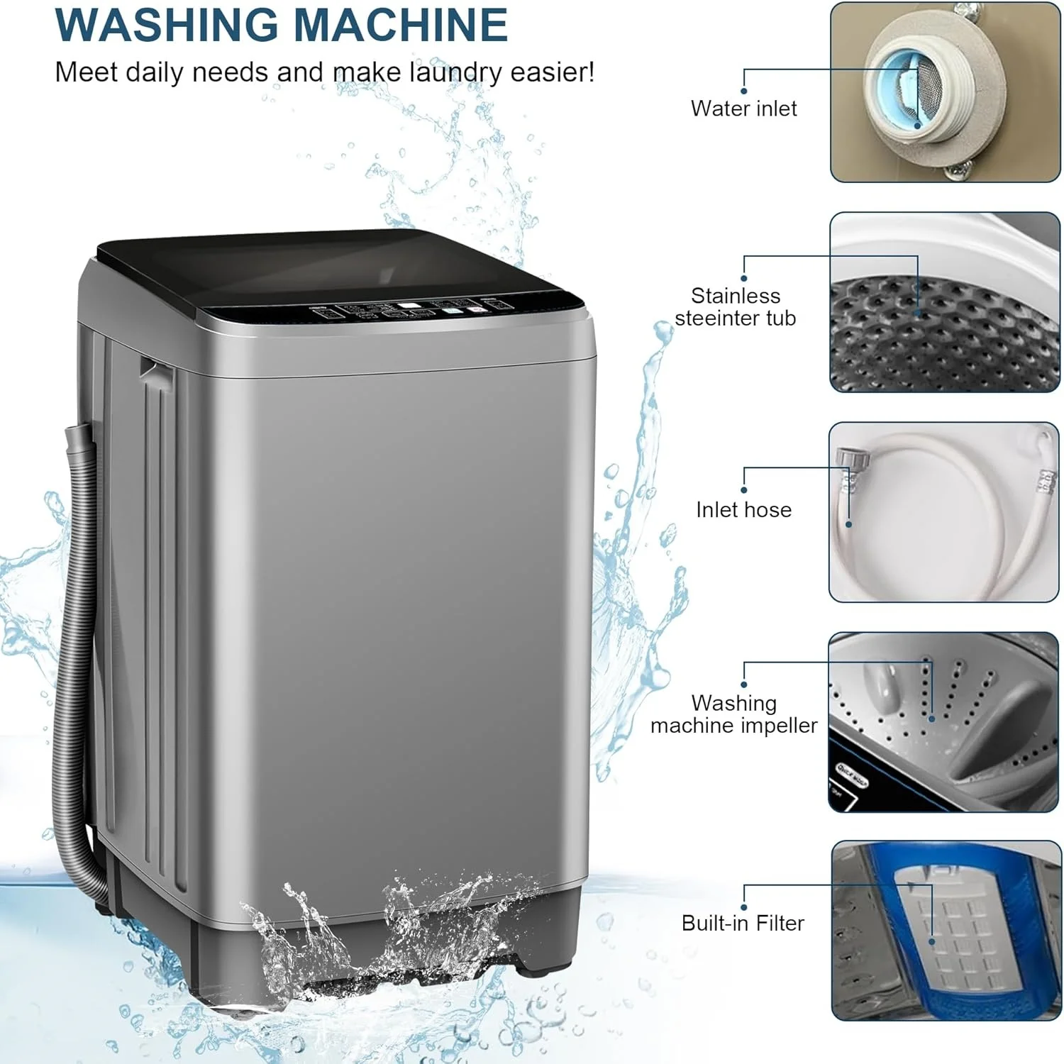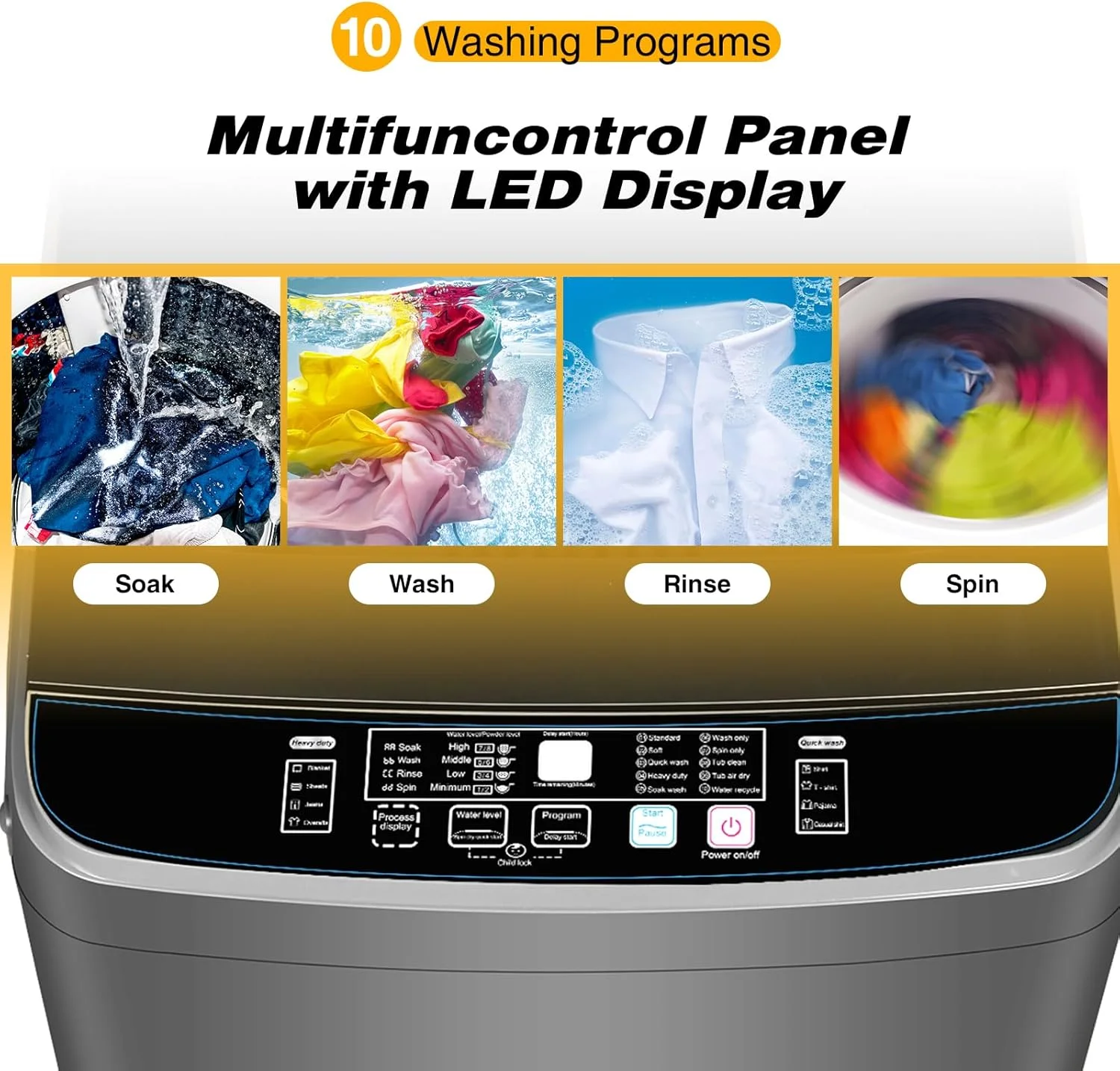 - ??��Simple Operation��This portable washing machine is a fully automatic washing system with a simple built-in control panel. You can easily find the appropriate washing function for your clothes without spending a lot of your time. Meanwhile, the grey washing machine is equipped with an advanced drain pump, which quickly and efficiently removes water after each wash. The tub self-cleaning function makes your laundry environment healthier. It's easy to store and requires little assembly.