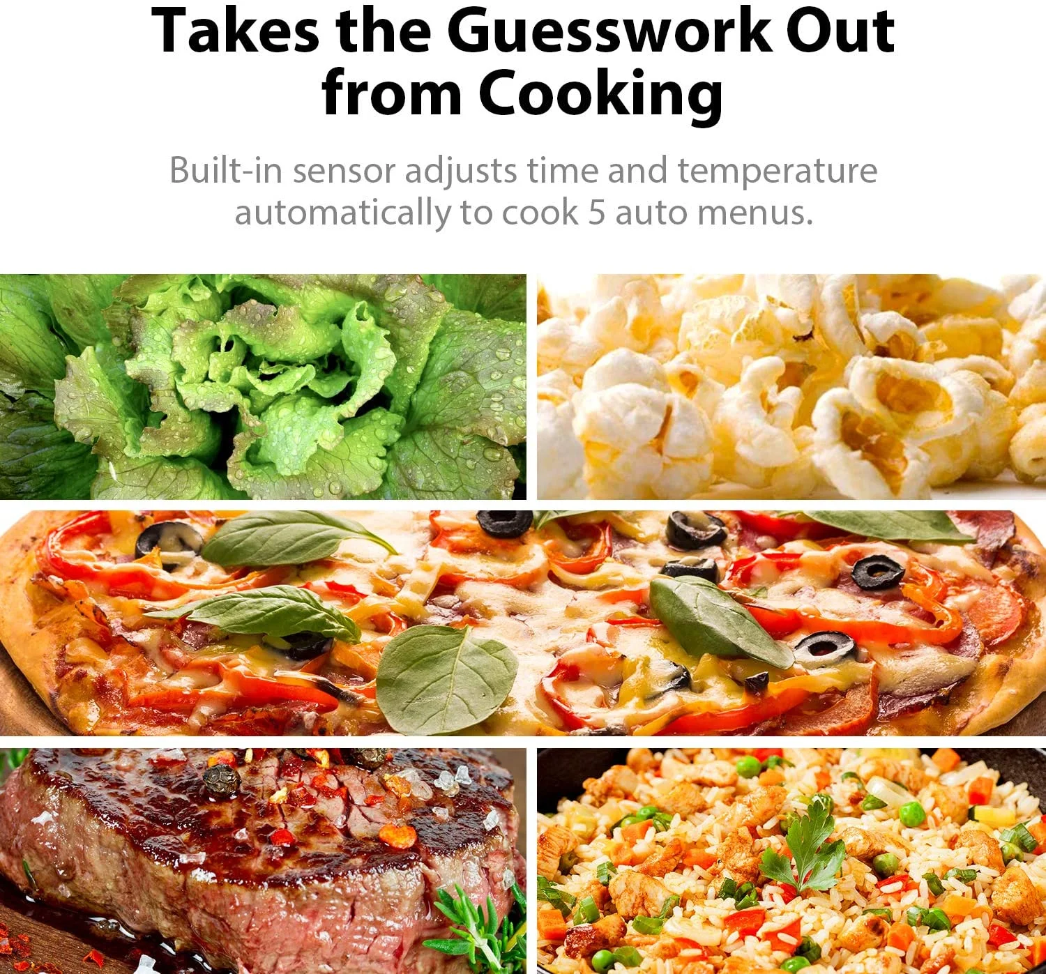 - 6 Smart Sensor Auto Menus: Pre-programmed sensor menus for optimum heating of popular foods like pizza, potato, vegetables and more. Smart sensor automatically adjusts power to ensure optimal temperature and texture of food