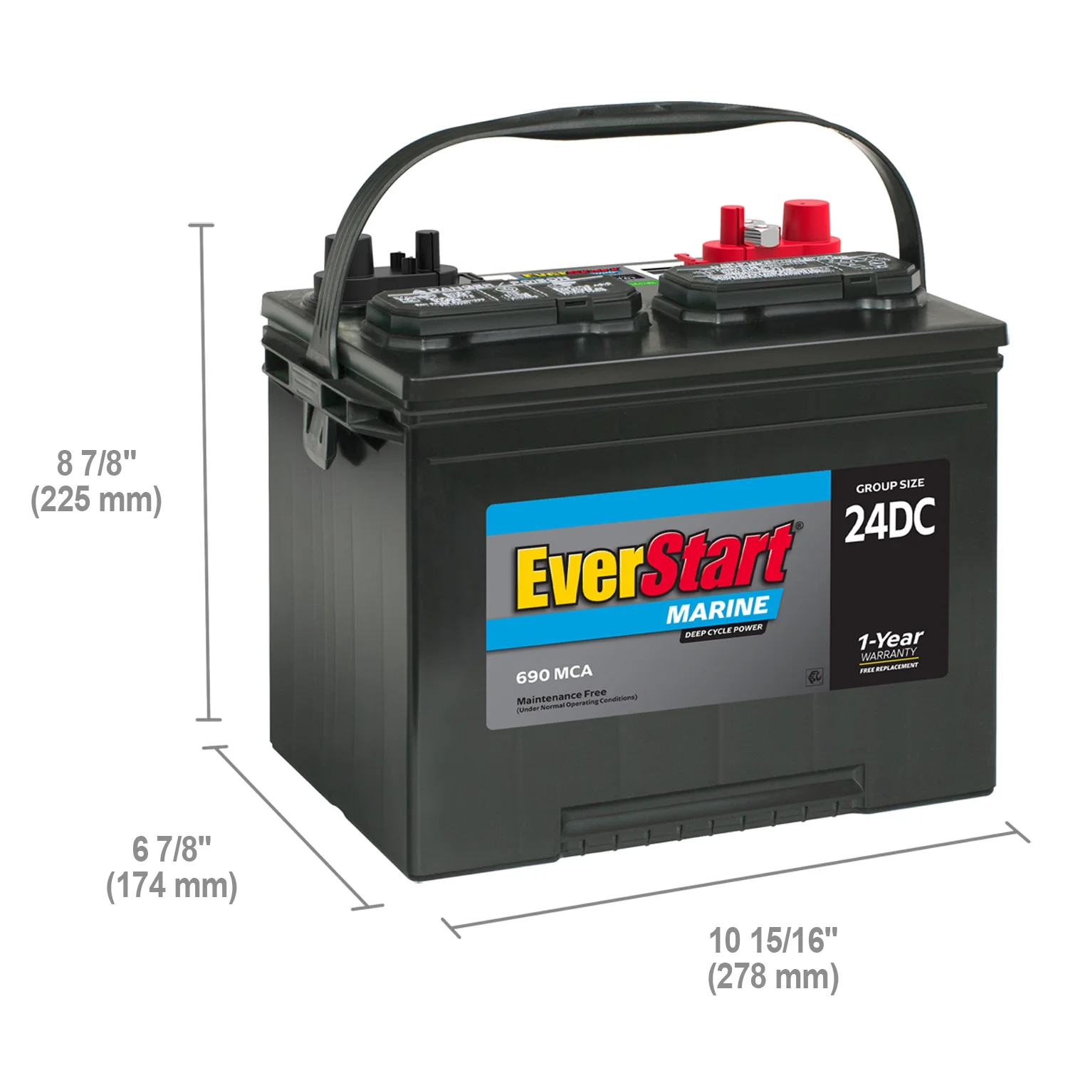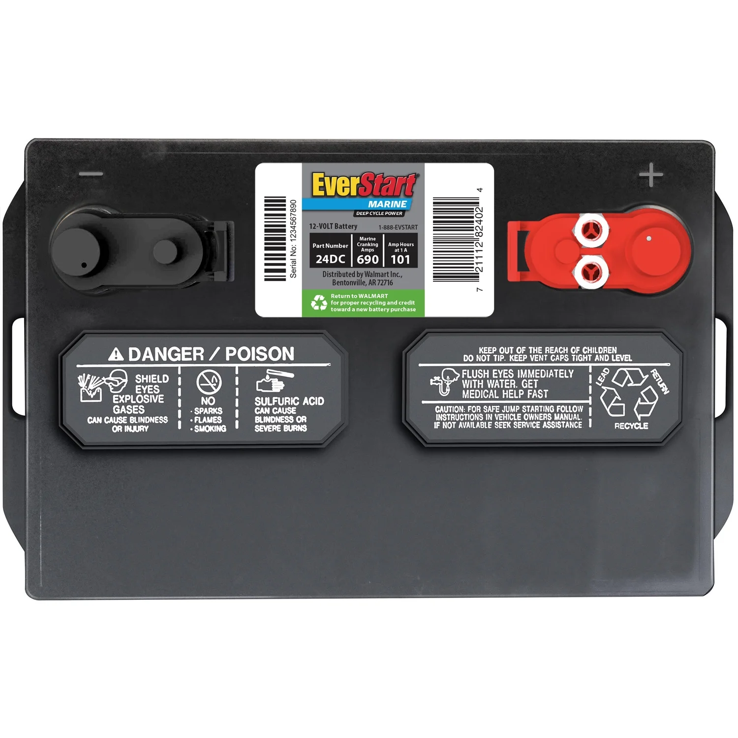 Stay on the go with this EverStart Lead Acid Marine/RV Deep Cycle Battery, Group Size 24DC. It's designed for use with a boat or an RV and is rated at 690 MCA and 101 amp hour. This EverStart battery features improved cycling capacity extending the amount of time it will last. This means it will allow a boat to stay out on the water for a longer time. Price shown does not include the Core Battery charge (varies by state). To avoid this core charge, bring your old battery in exchange at time of purchase. If you do not have your old battery at time of purchase, simply bring it later along with your receipt and your core refund will be issued.