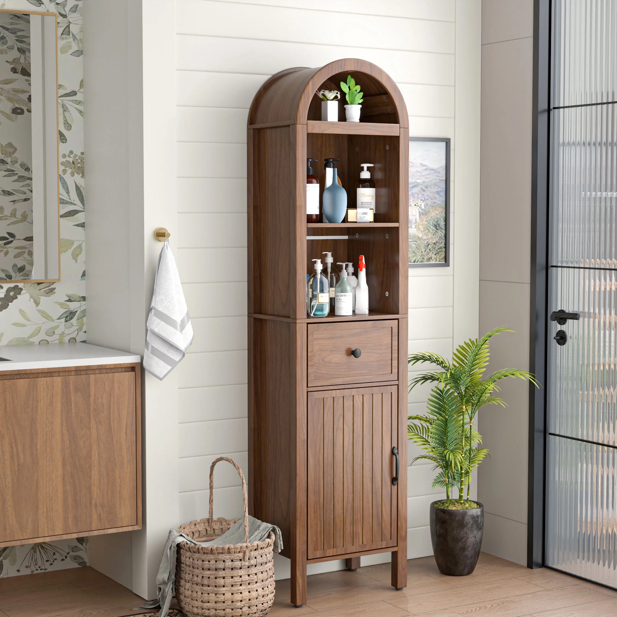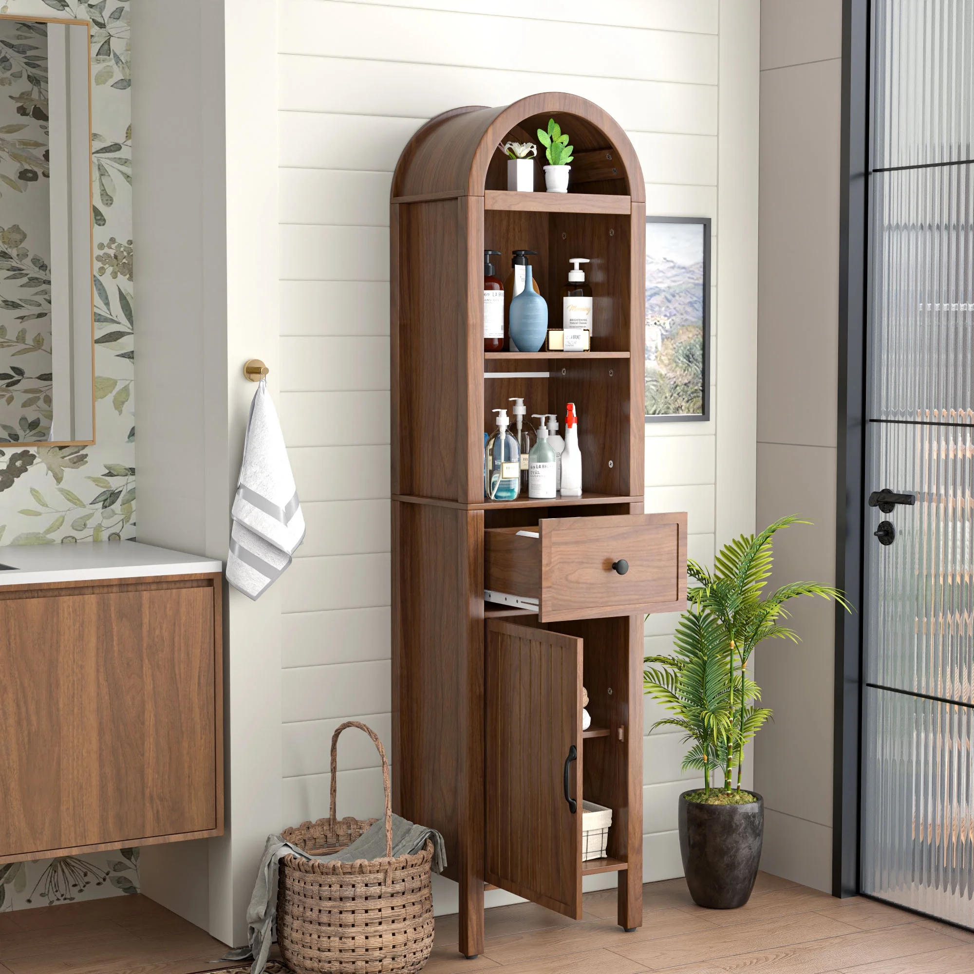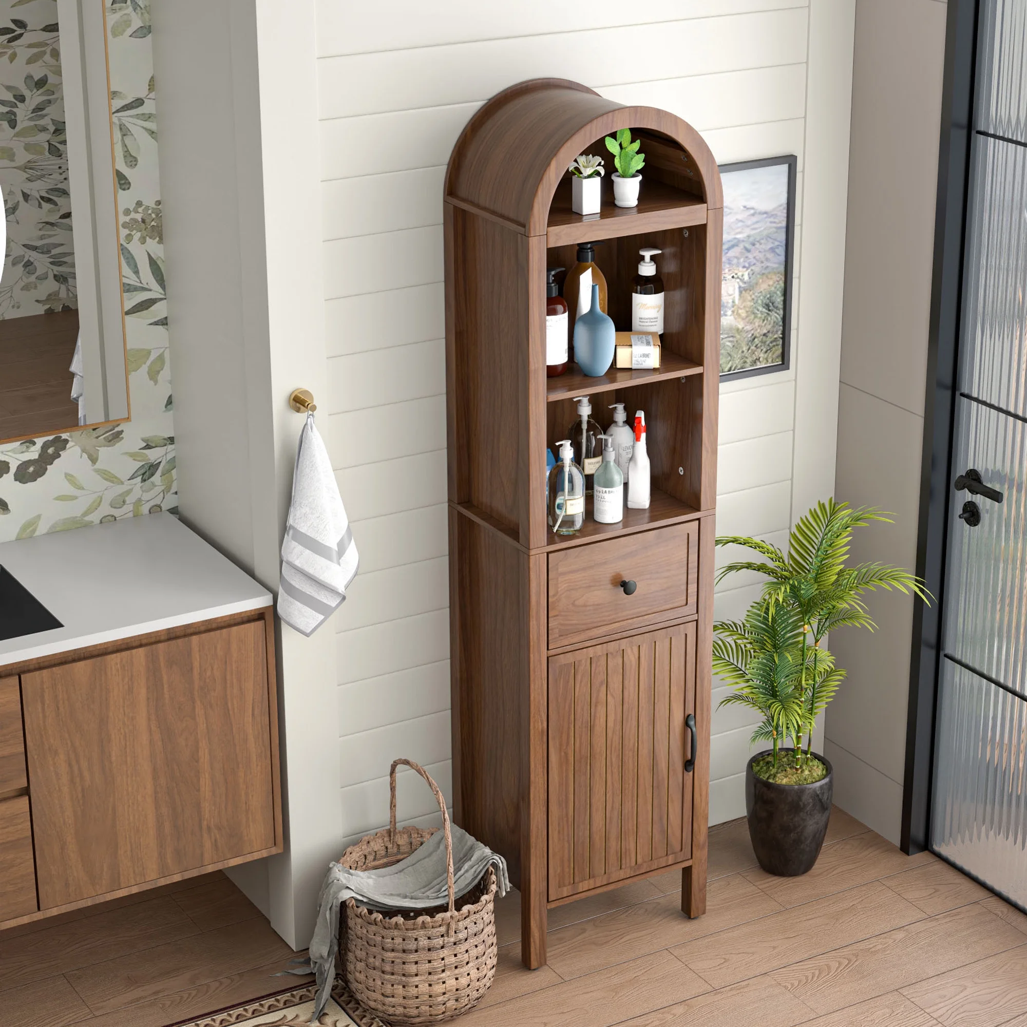 - This freestanding bathroom storage cabinet features a unique grooved panel and arched design, showing mid-century modern charm, which complements farmhouse, country and modern furniture styles and enhances the beauty of your space.