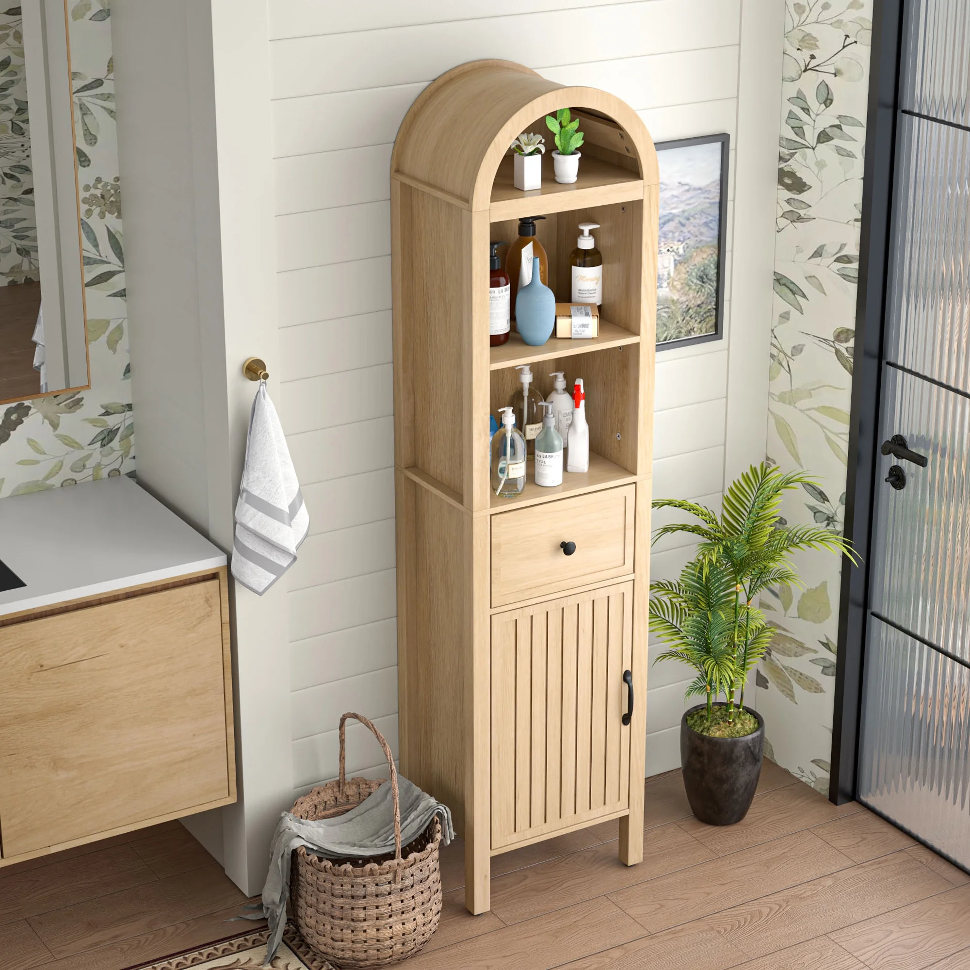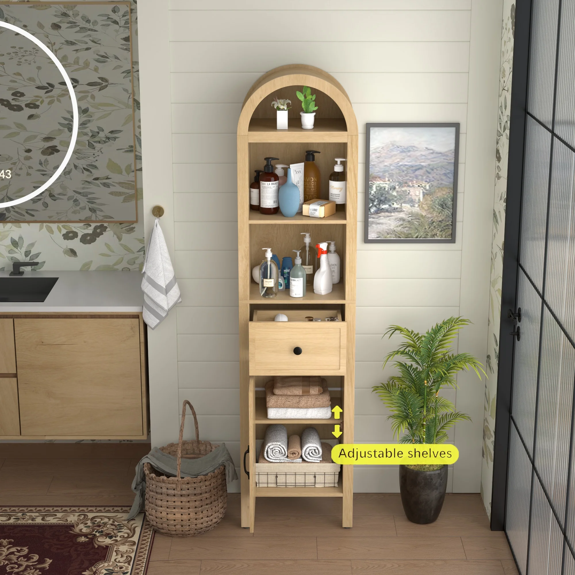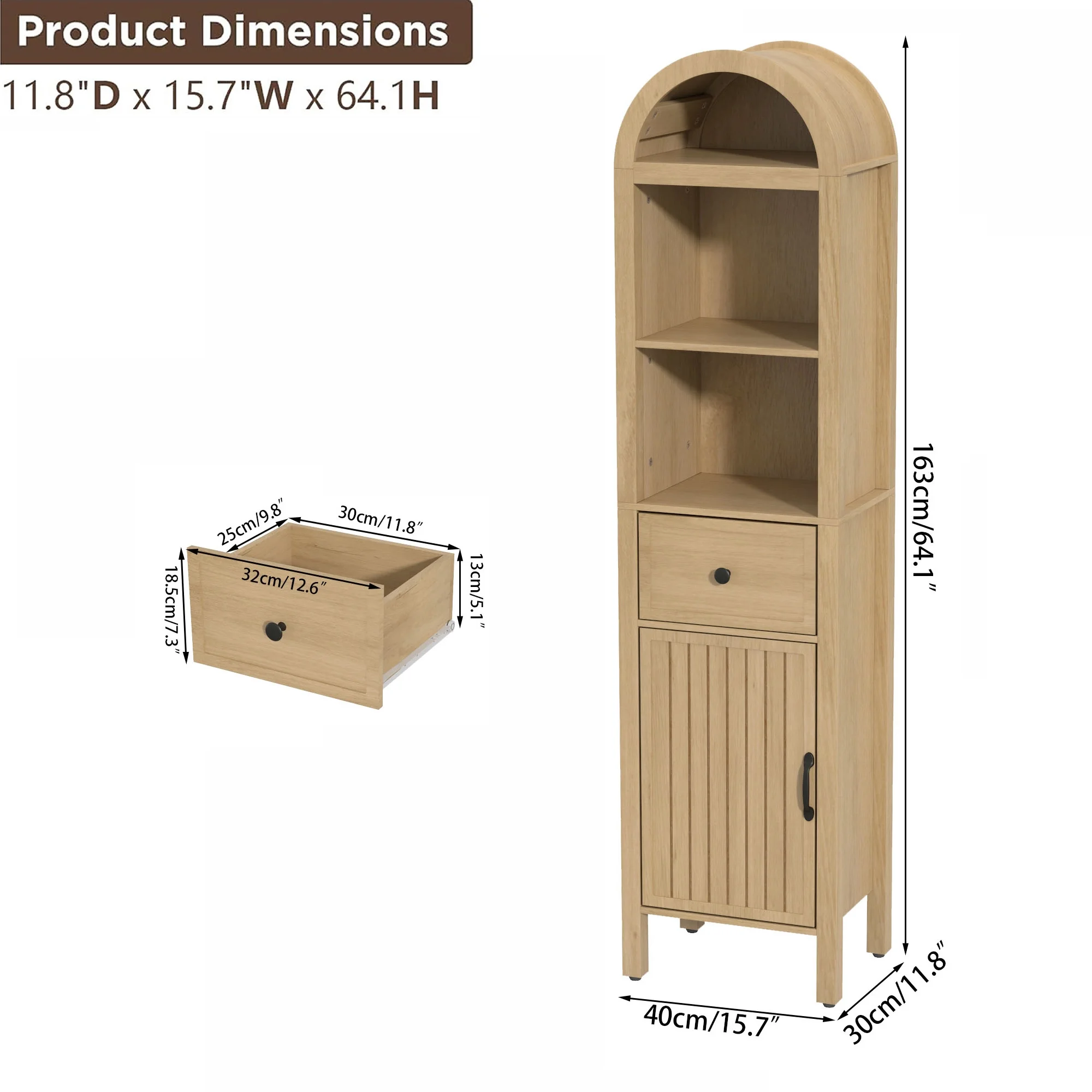 Elevate your storage solutions with our tall bathroom cabinets, featuring recessed doors and drawers in a rustic oak finish. Standing 64 inches tall, this narrow linen tower combines modern design with functionality, making it an ideal solution for bathrooms, kitchens, living rooms, and small spaces. The tall bathroom cabinet with drawers and shelves provides ample storage space, making it easy to organize toiletries and towels in the bathroom, and condiments and tableware in the kitchen. It also enhances your decor with a timeless appeal that blends seamlessly into any interior style. Whether you want to organize or display, this freestanding cabinet will meet all your storage needs and be a bright addition to your home decor.