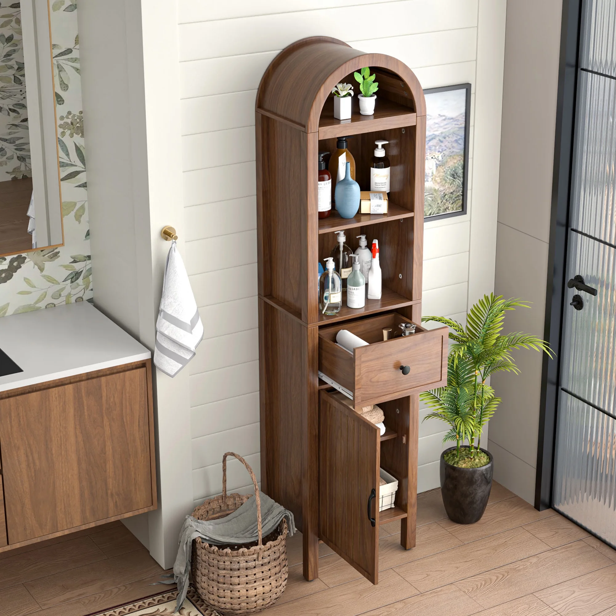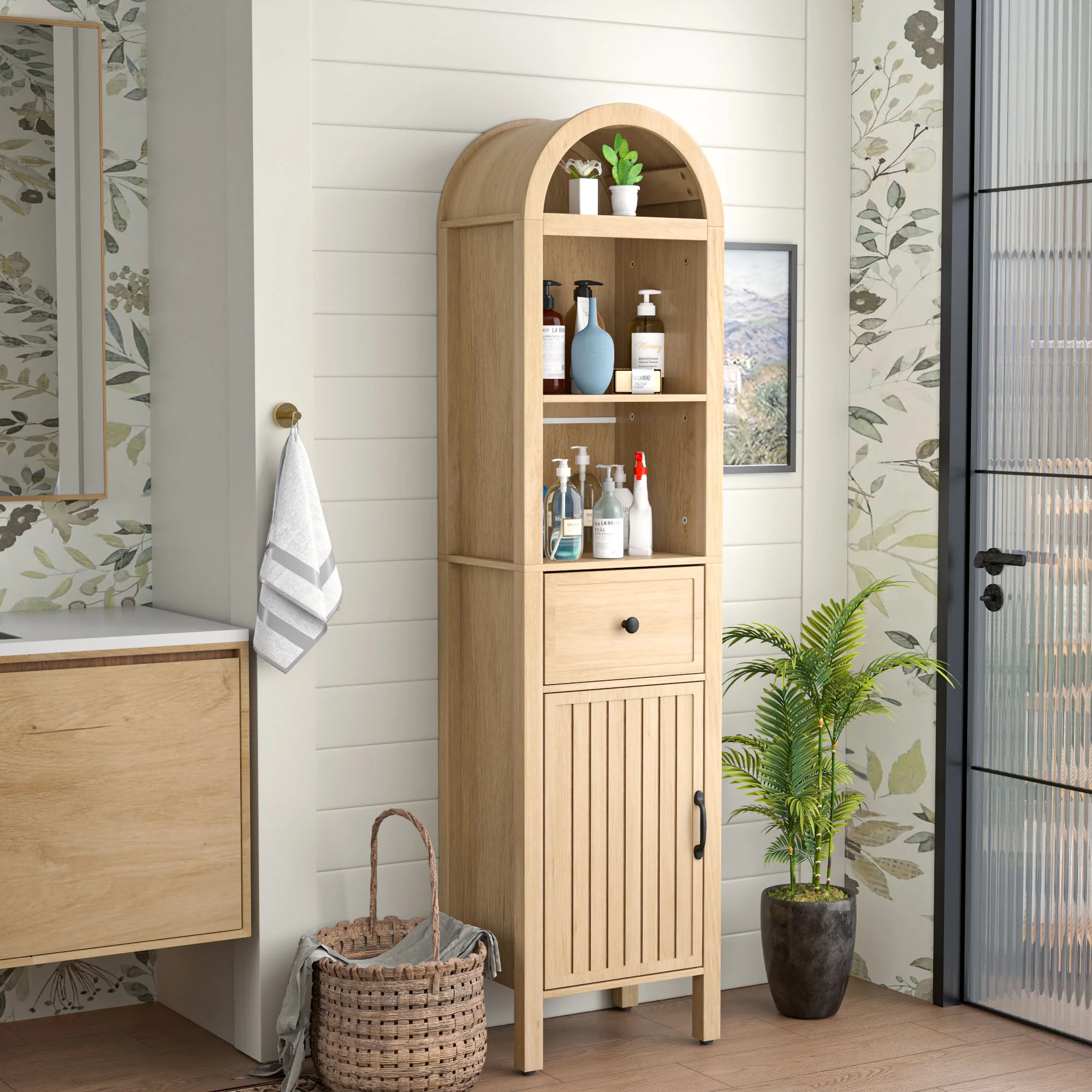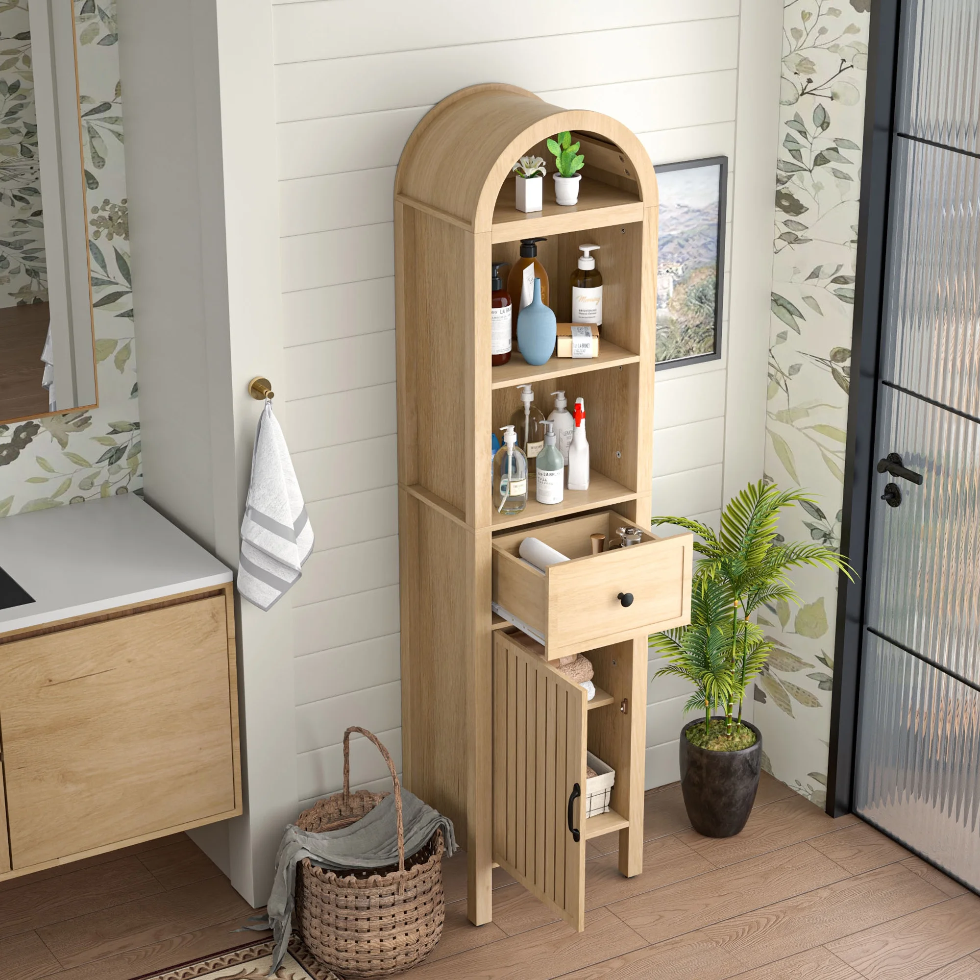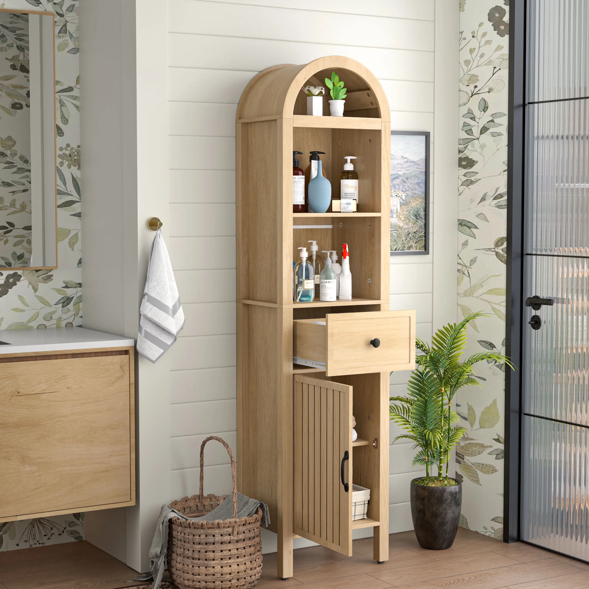 Elevate your storage solutions with our tall bathroom cabinets, featuring recessed doors and drawers in a rustic oak finish. Standing 64 inches tall, this narrow linen tower combines modern design with functionality, making it an ideal solution for bathrooms, kitchens, living rooms, and small spaces. The tall bathroom cabinet with drawers and shelves provides ample storage space, making it easy to organize toiletries and towels in the bathroom, and condiments and tableware in the kitchen. It also enhances your decor with a timeless appeal that blends seamlessly into any interior style. Whether you want to organize or display, this freestanding cabinet will meet all your storage needs and be a bright addition to your home decor.