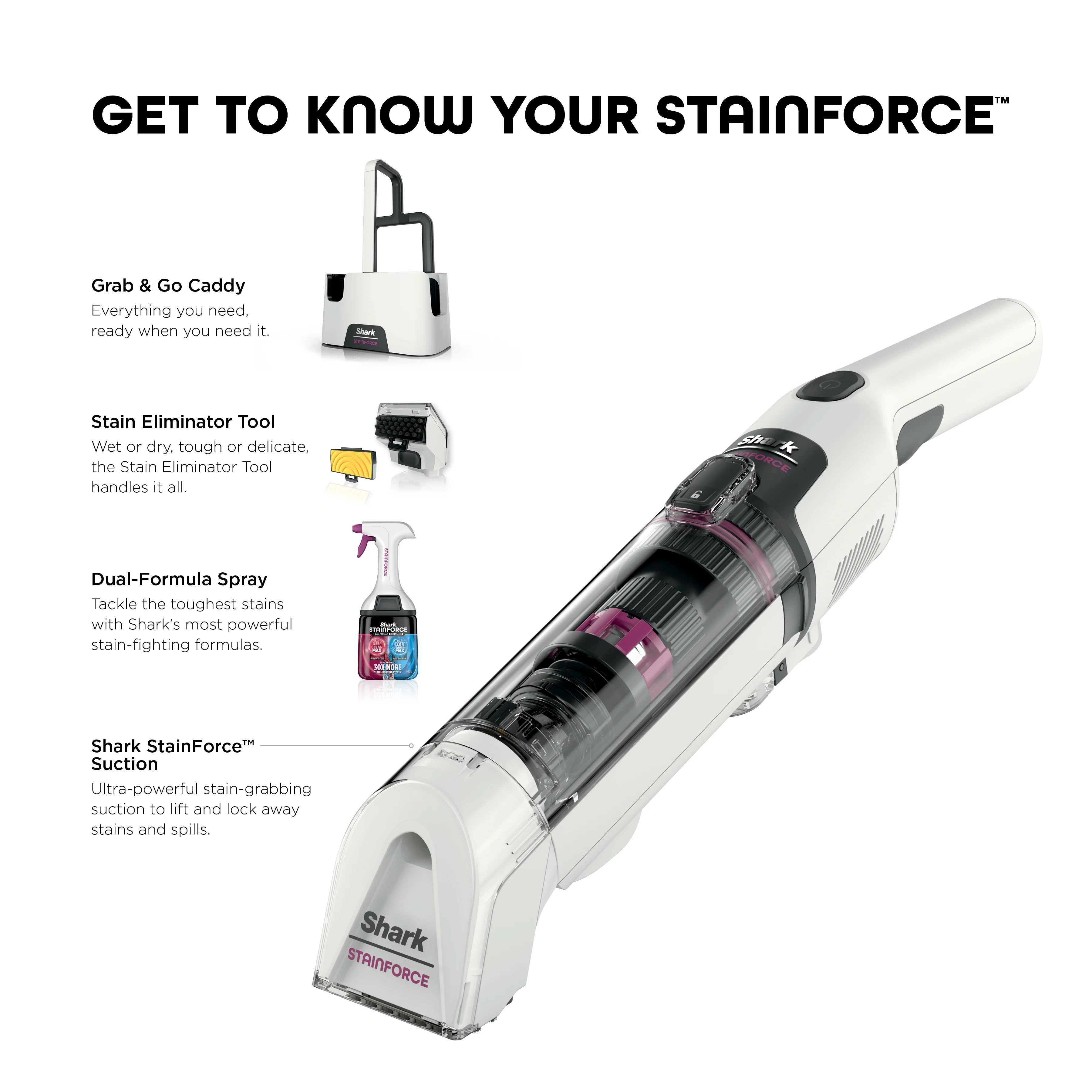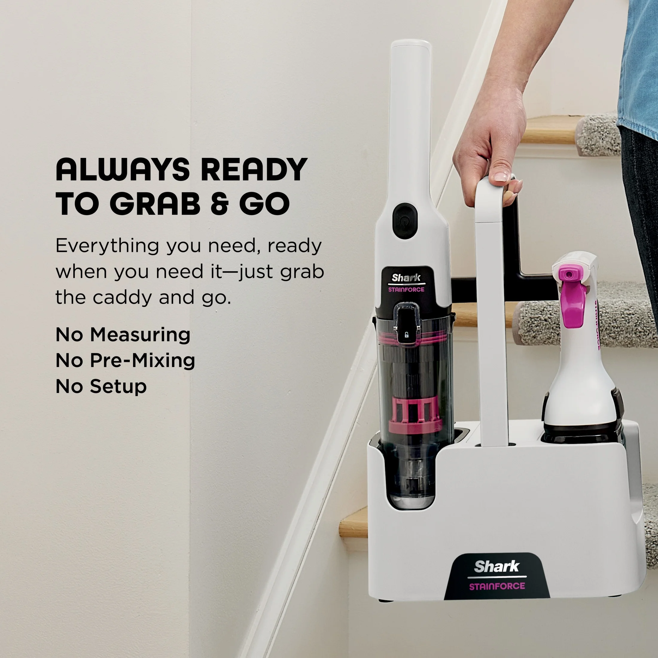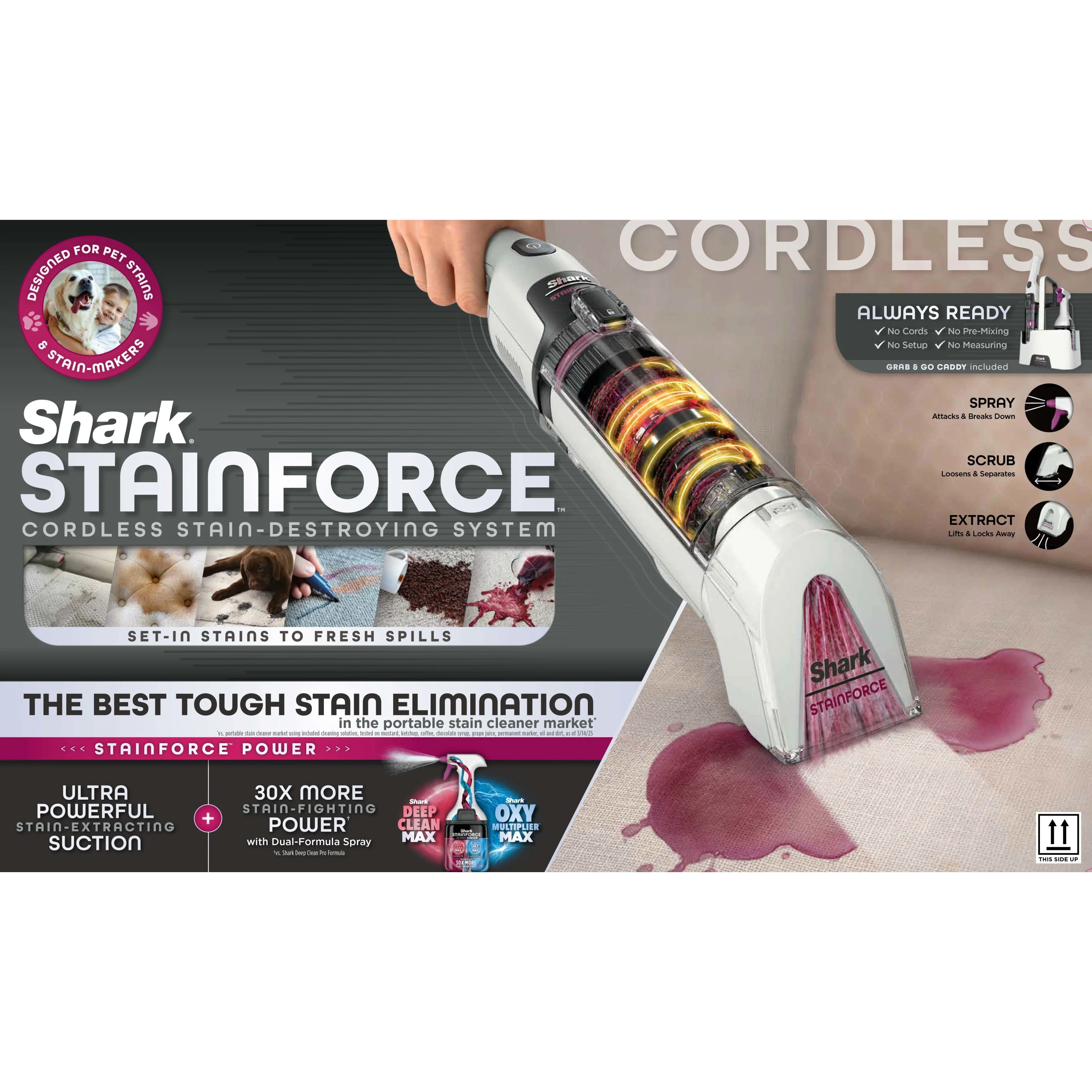Shark Stainforce Cordless Portable Spot, Stain, & Odor Remover System for Carpets, Area Rugs, Upholstery, Stairs, Cars, with Storage Caddy, and Full - Size Cleaning Solution, White, HX100
