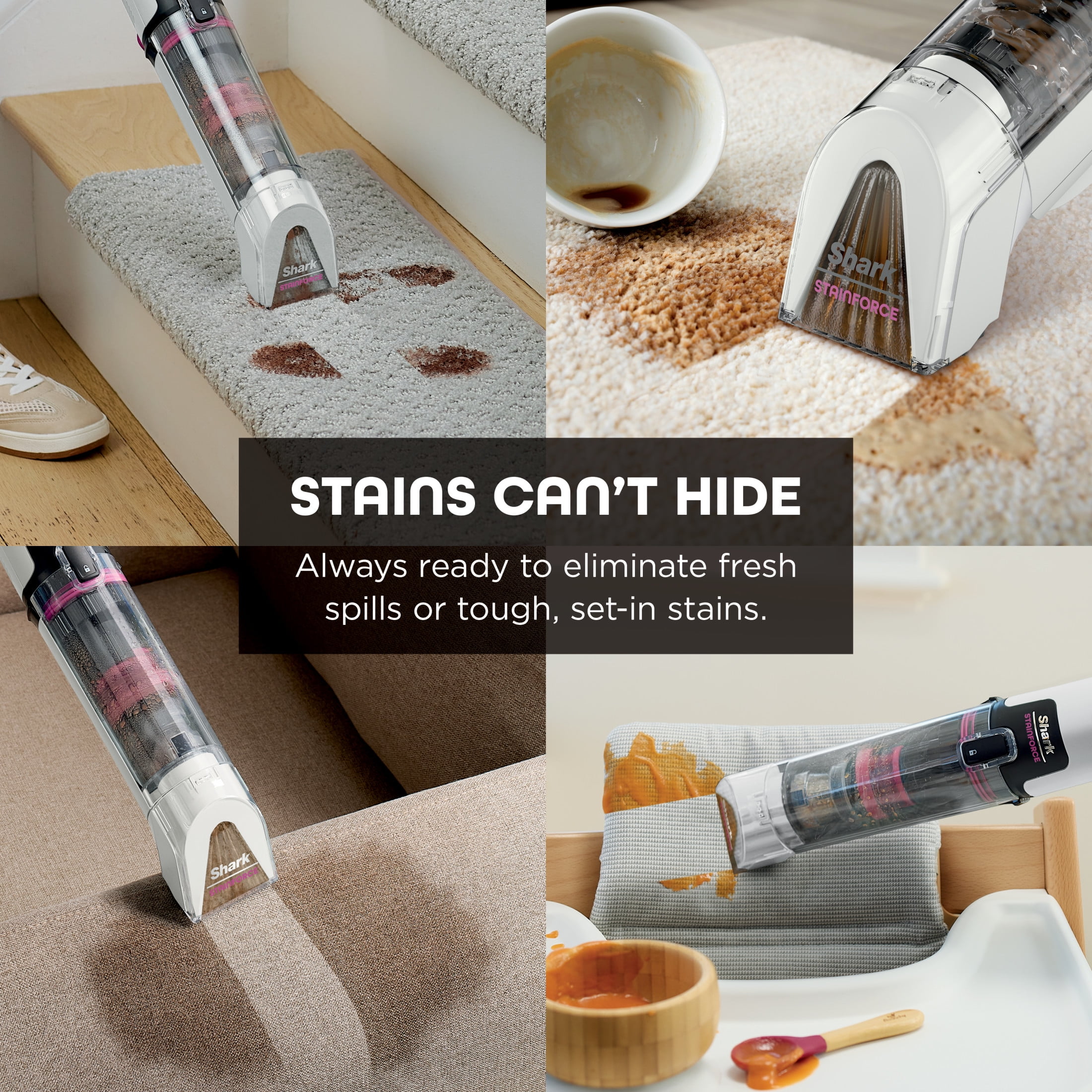 - +vs portable stain cleaner market using included cleaning solution tested on mustard, ketchup, coffee, chocolate syrup, grape juice, permanent marker, oil and dirt. *vs Shark Deep Clean Pro Formula.