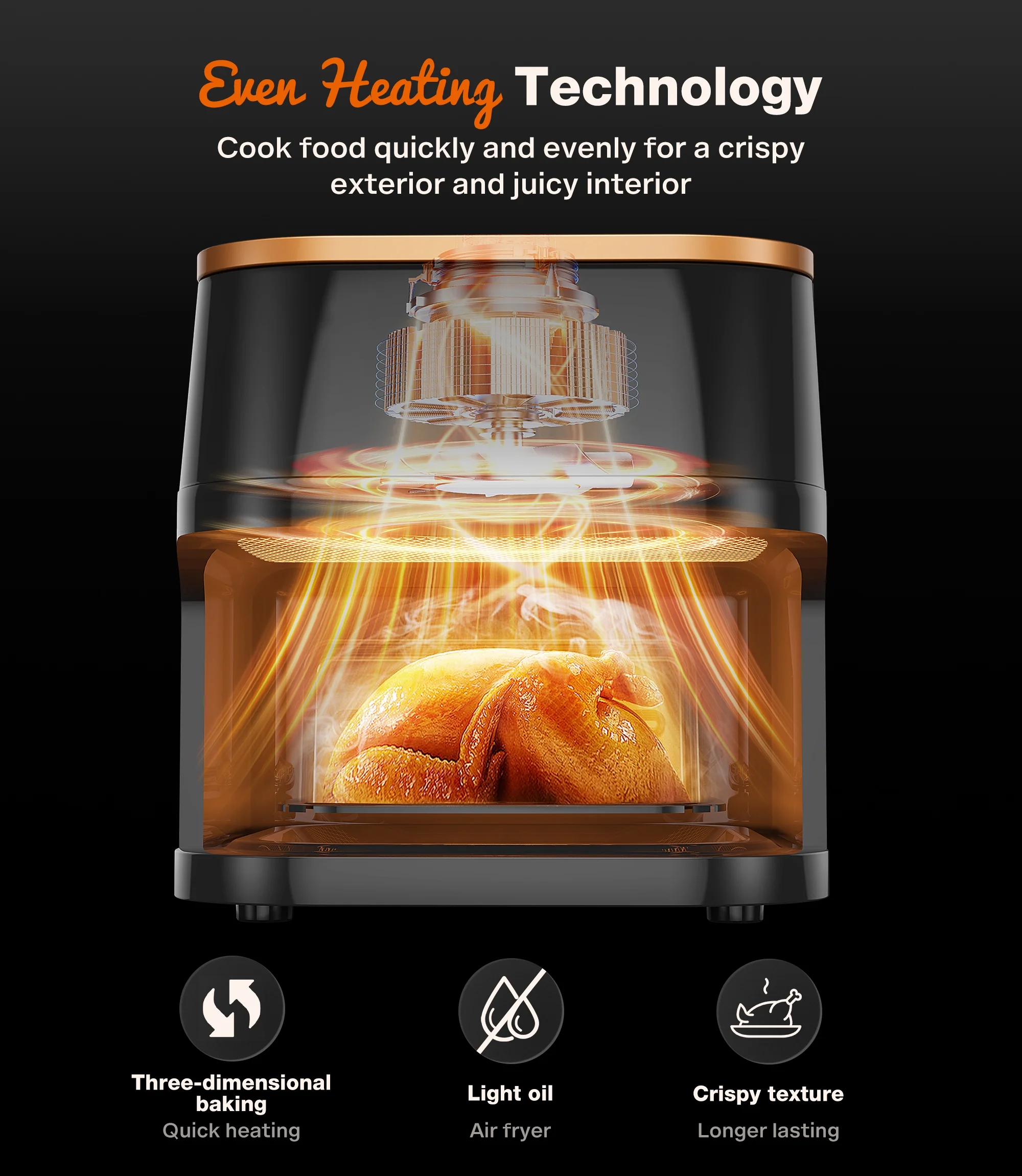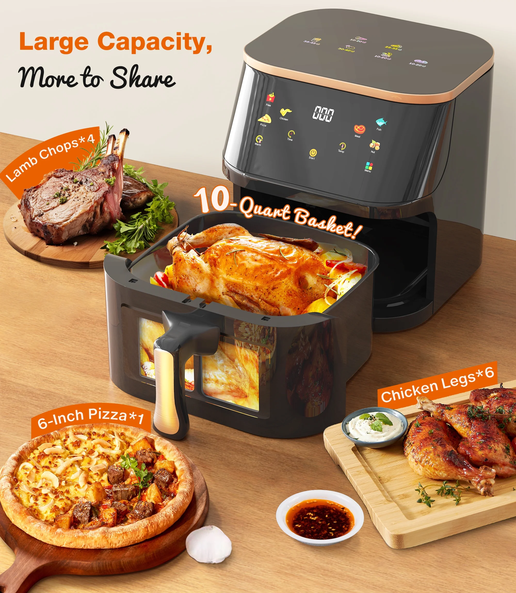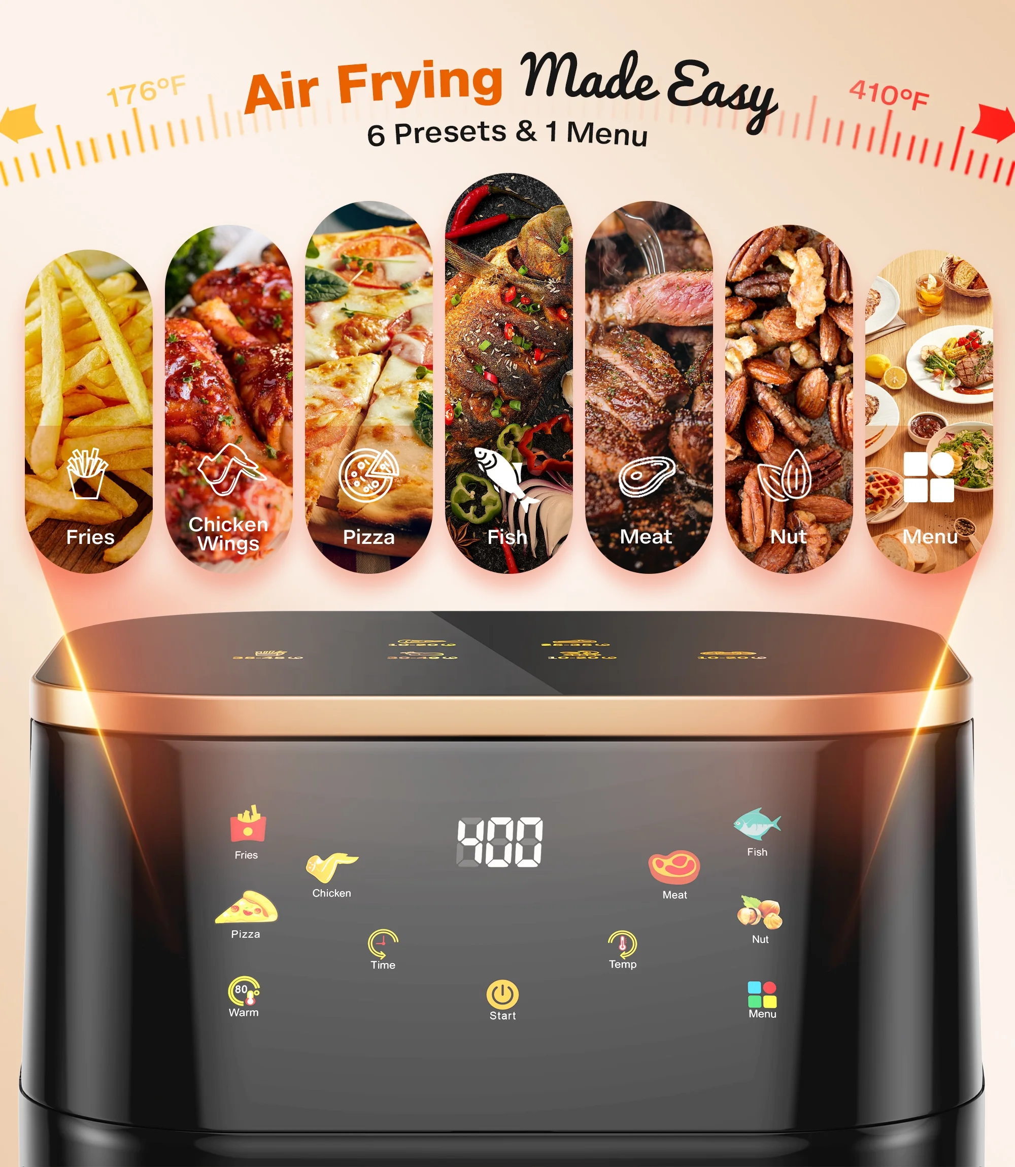 - Versatile Cooking to Meet All Your Needs��Not only can it fry, but it also grills, bakes, roasts, and reheats. Equipped with a digital touchscreen,and designed for cooking novices or those new to air fryer with 6 professional presets Fries, Chicken, Pizza, Meat, Fish, Nut.