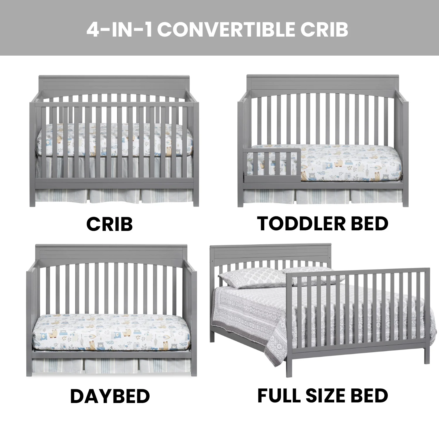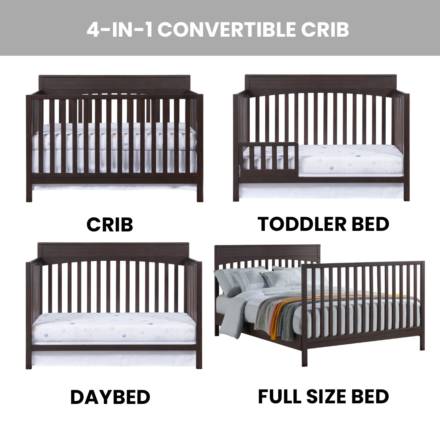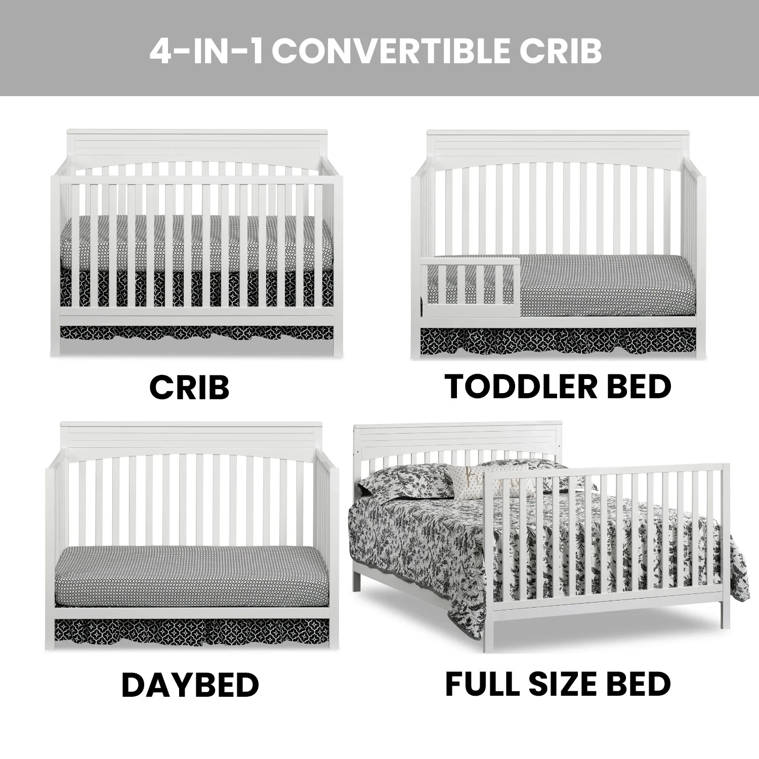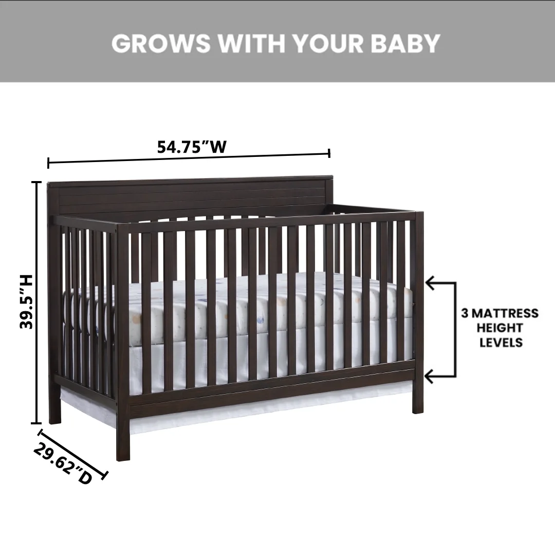 - THOUGHTFULLY DESIGNED: Designed to fit a standard-sized crib mattress, this Oxford Baby 4-in-1 Crib offers a convenient convertible design that will grow as your child grows by converting from a crib to toddler bed, daybed, and full-size bed with 3-levels of mattress height adjustments for your growing child