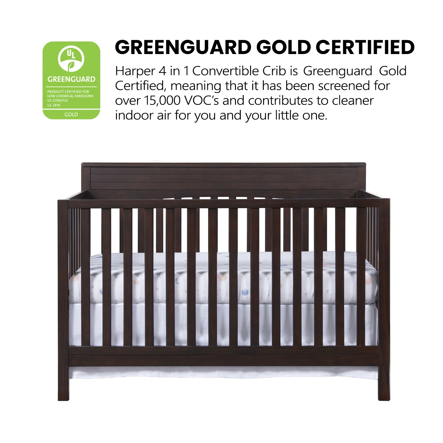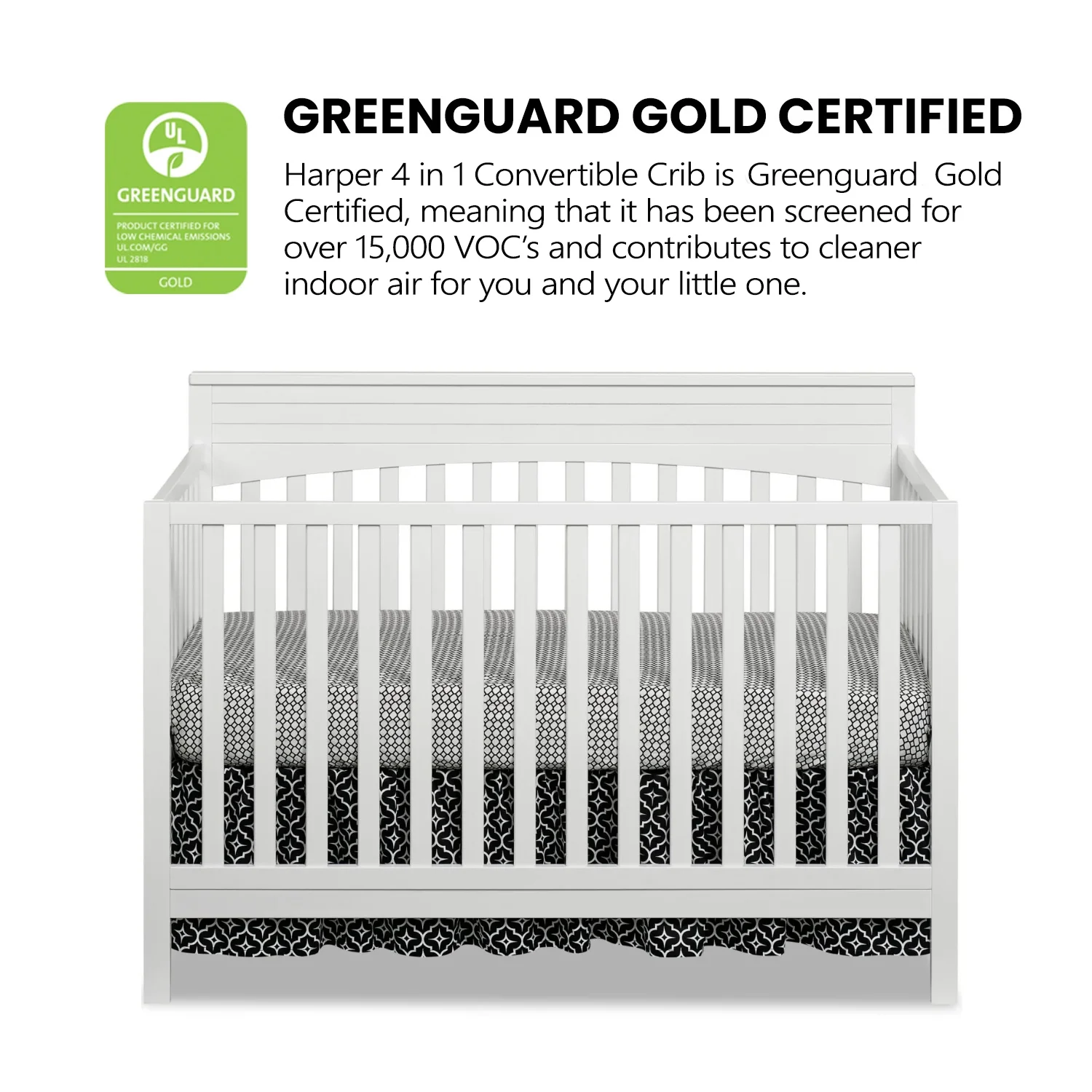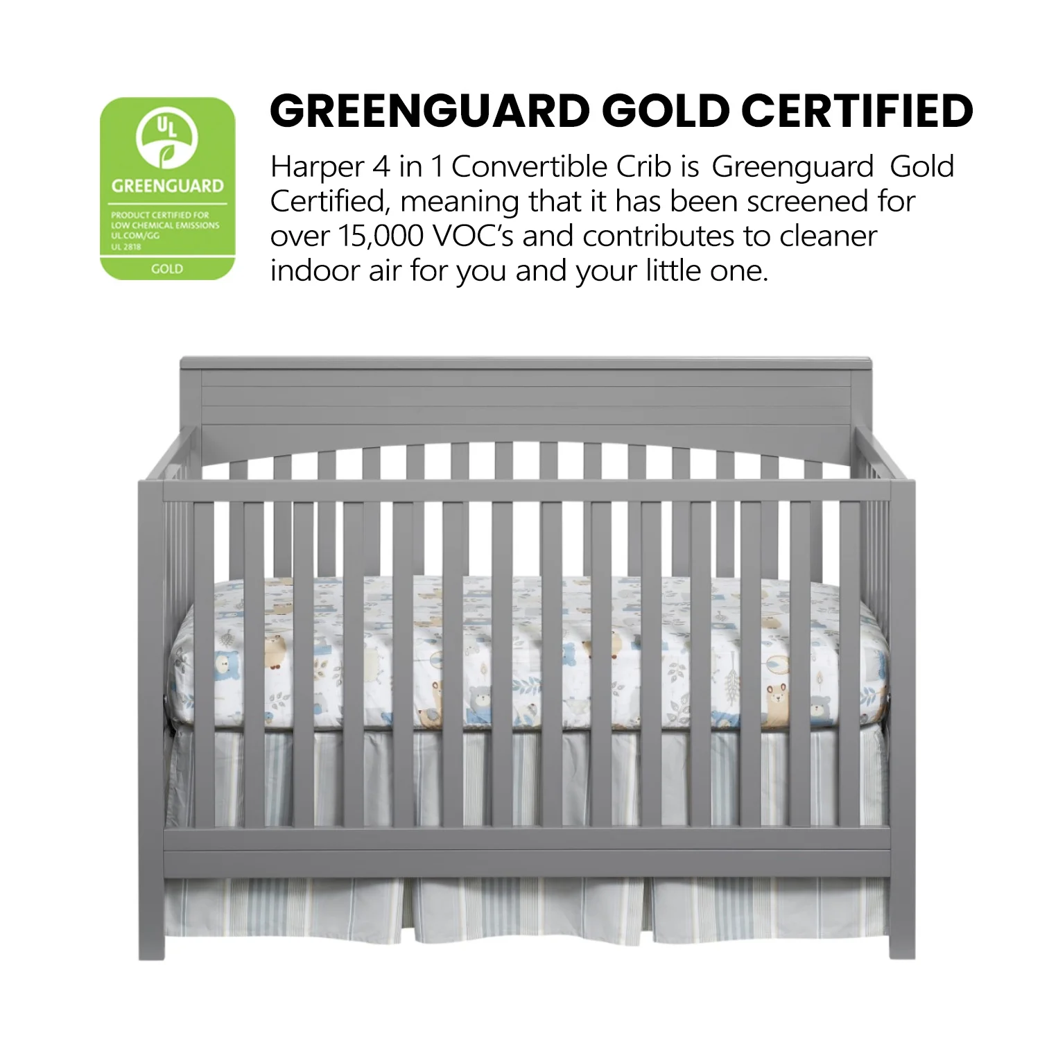 - GREENGUARD GOLD CERTIFIED: The Oxford Baby Harper 4-in-1 Convertible Crib has achieved GREENGUARD GOLD Certification; GREENGUARD GOLD Certified products have undergone rigorous testing for over 10,000 chemical emissions, ensuring that this product is certified for low chemical emissions into indoor air during product usage