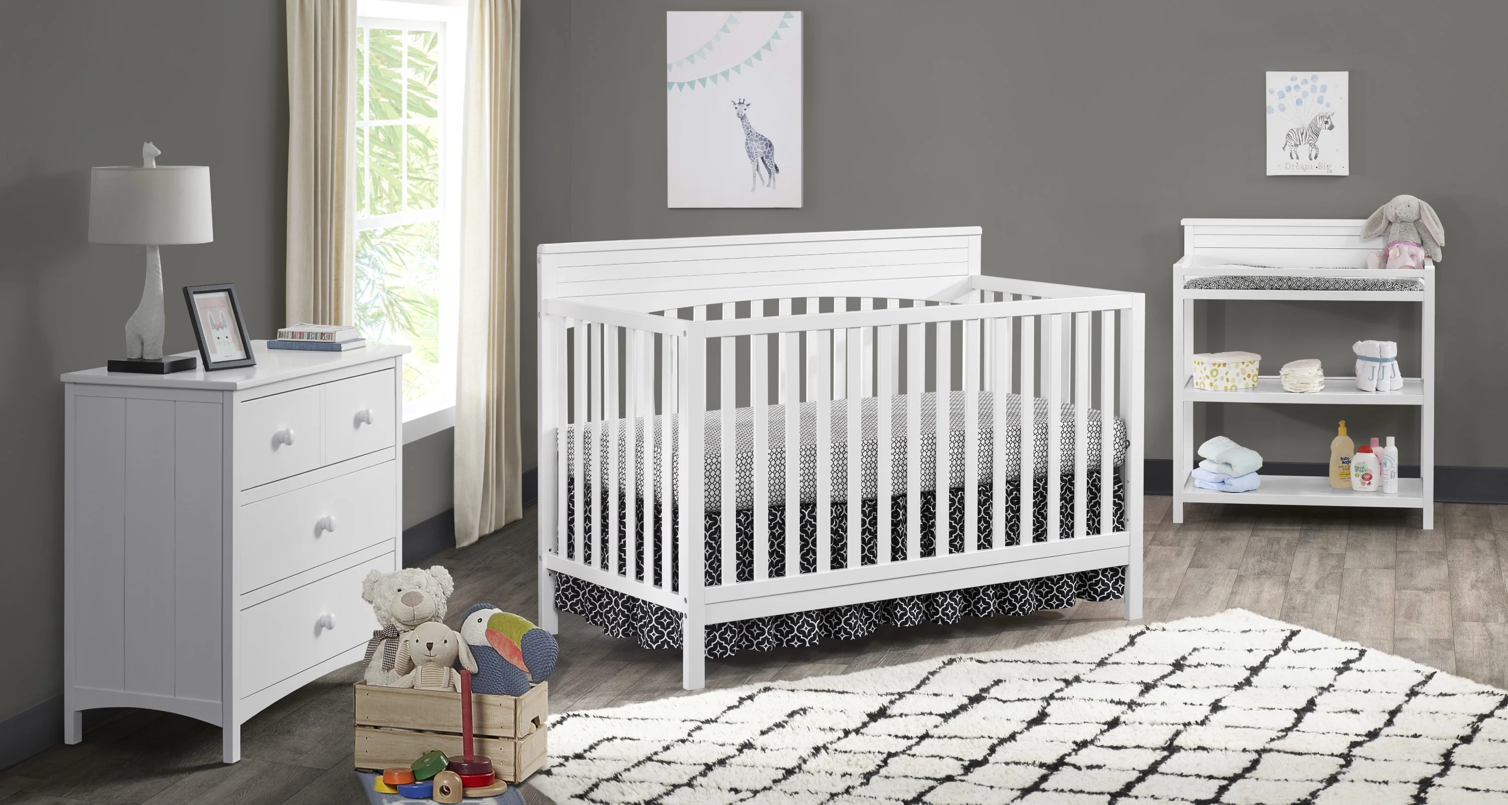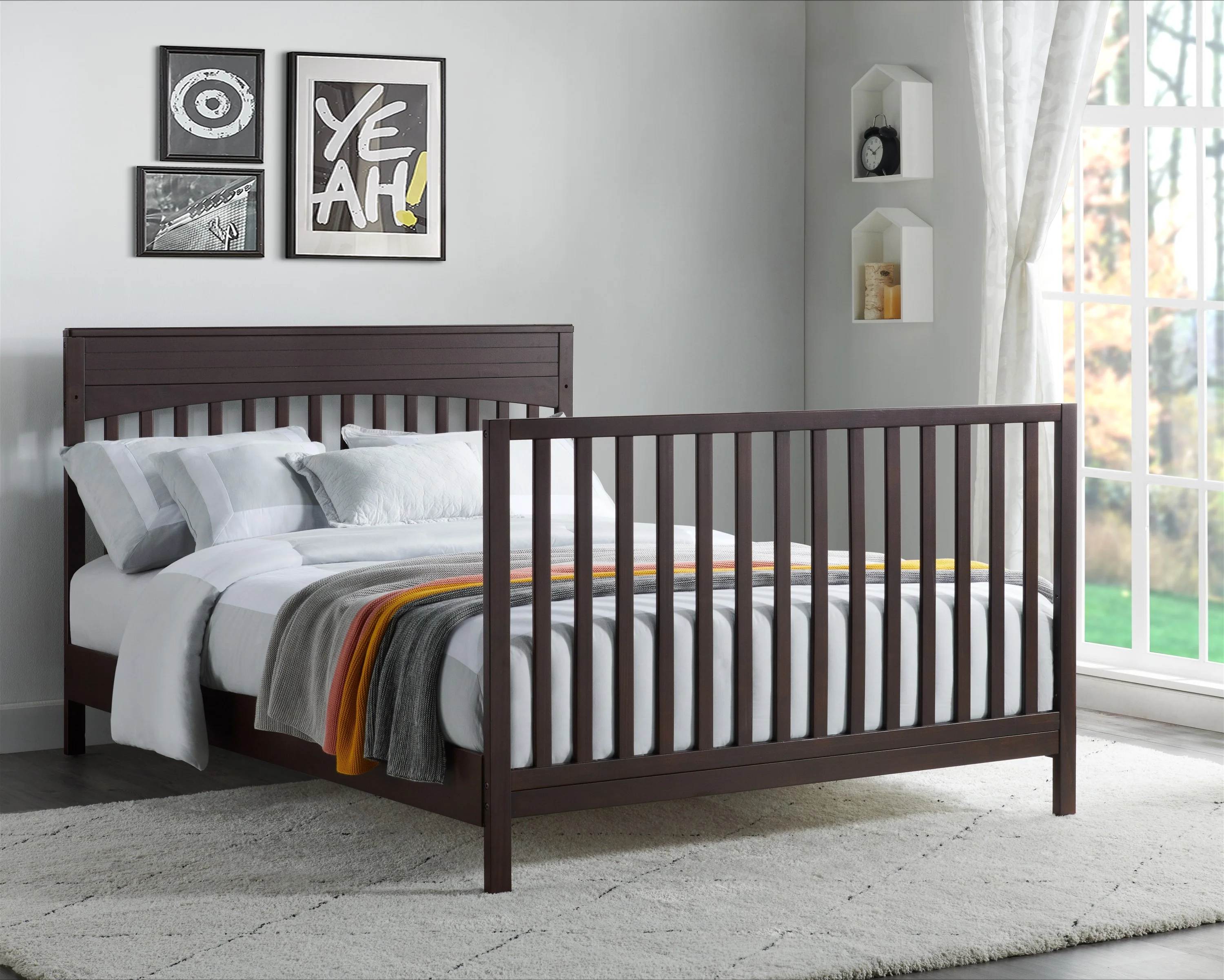 The Harper Collection speaks tradition and style while maintaining the highest quality and safety standards in the industry. The furniture is constructed from the finest solid woods and veneers which help capture its beautiful design. The Harper Crib is sturdy and easily converts the Crib to a Toddler Bed, to a Daybed, and then to a Full-Size Bed. Toddler Guard Rail and the full-size bed Conversion Kit are sold separately. Designed with your baby's safety in mind, the crib meets all safety guidelines. The mattress is not included.