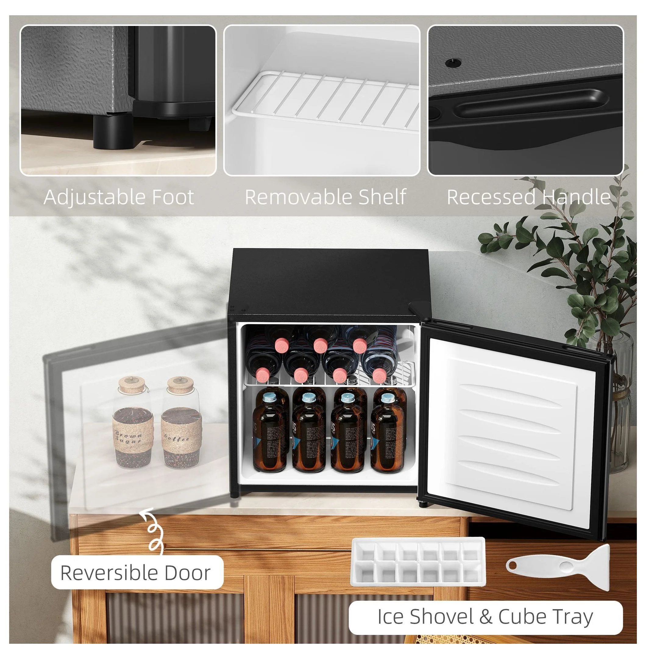 - ��Flexible & Convenient Features��: The reversible door allows for adaptable placement in any room layout; the removable shelf provides versatility for storing items of different sizes; includes an ice cube tray and shovel for added convenience.