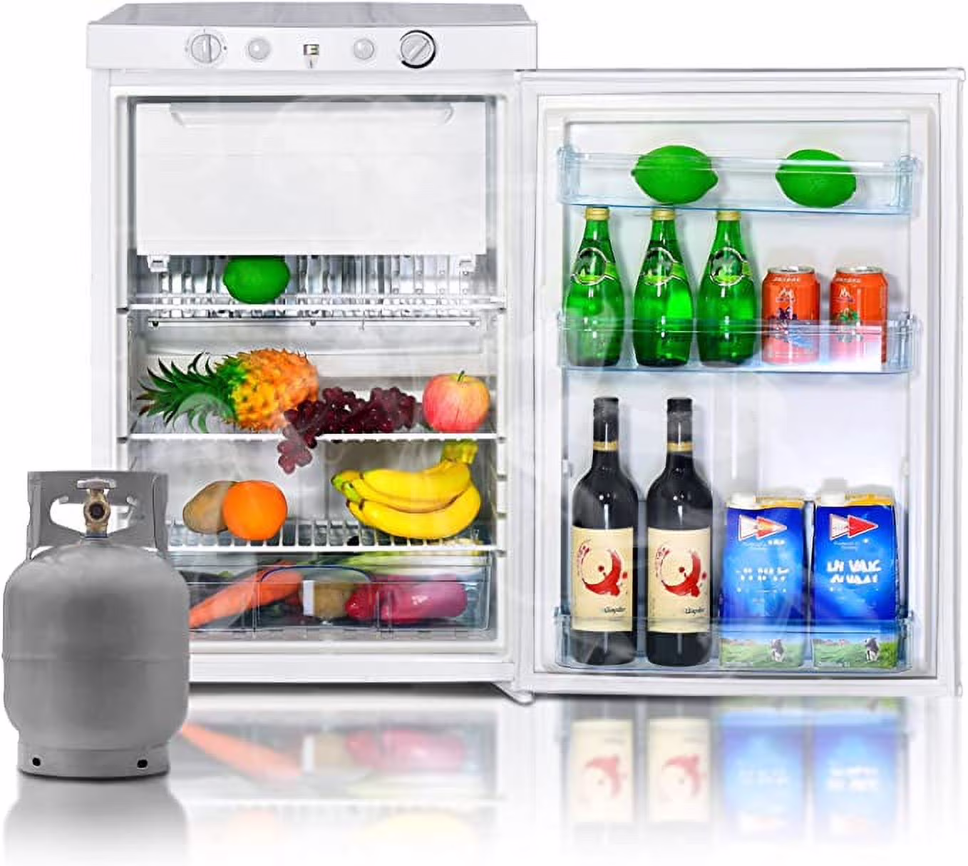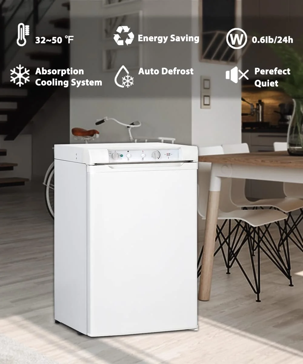 ��3 Way Powered��110V, 12V, and propane input. Approximate gas consumption: 0.28 kg/day. A propane refrigerator is perfect for off-grid places. Thanks to gas refrigeration, you can be unshackled from powered camping sites to enjoy the automotive, off-grid places, camping, and fishing. Need to know: Black/White Random Delivery