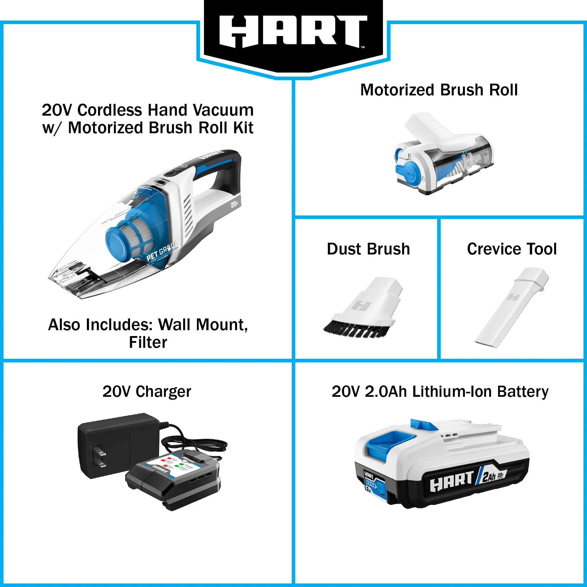 - Includes: Cordless Hand Vacuum, Motorized Brush Roll, Crevice Tool, Dust Brush, Wall Mount, Filter, 2.0Ah Lithium-Ion Battery and Charger