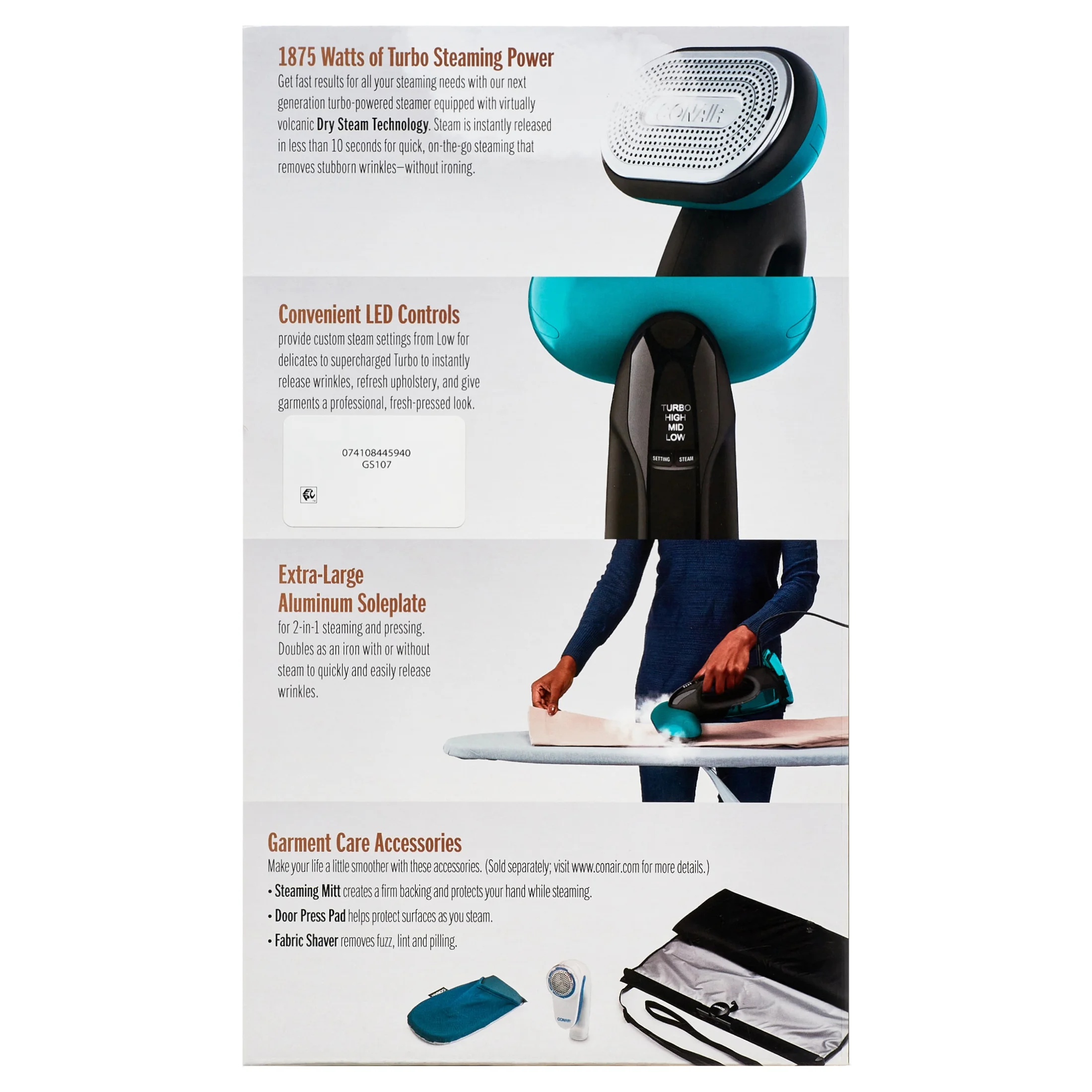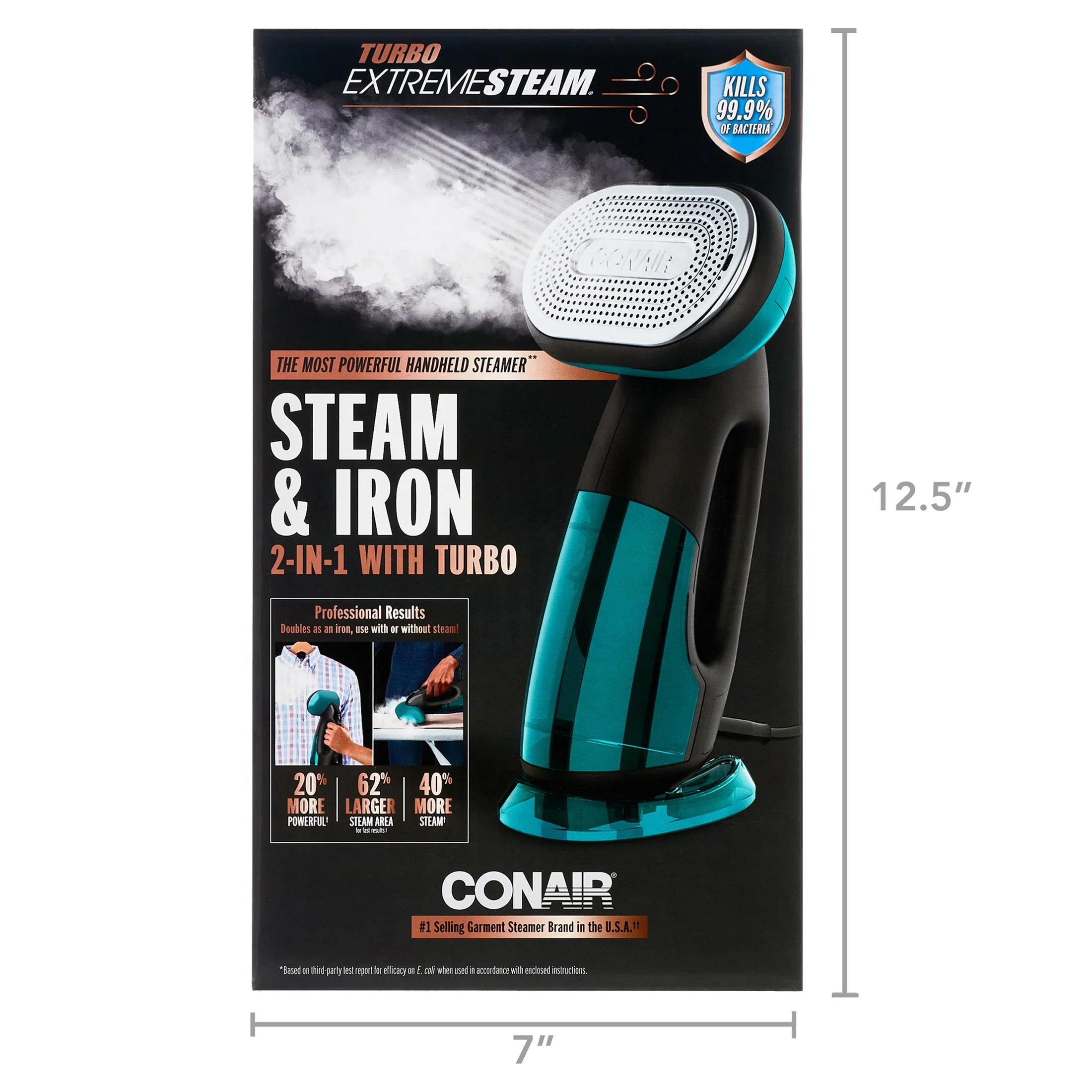 Get fast results for all your steaming and ironing needs with the next-generation turbo-powered steamer and keep your clothes looking perfectly pressed and smelling fresh. The most powerful handheld steamer** engineered with 1875 watts of power, the Turbo ExtremeSteam? Steam & Iron 2-in-1 with Turbo by Conair? is a high-heat, handheld garment steamer that doubles as an iron, heats up almost instantly in under 10 seconds, and produces 40% more steam?. With a 62% larger steam area and 20% more power?, smoothing is faster and kills 99.9% of bacteria*. De-wrinkle and freshen clothing, curtains, linens, and more with 4 steam settings, including a turbo boost of steam, customized for a variety of fabrics. Go from Low for delicates to Turbo for heavy sweaters and jackets. With the ability to quickly press and refresh fabric and the versatility to convert to a dry iron, you can achieve flawlessly smooth, fresh-from-the-dry-cleaner results in no time! As the most powerful 2-in-1 handheld steamer,** the Turbo ExtremeSteam? puts the power of professional fabric steaming in the palm of your hand. Use it to iron vertically or horizontally by applying the hot soleplate directly to fabrics, with or without steam, and remove wrinkles more easily than with a standard iron and with faster, more professional results. With Dry Steam Technology, steam is heated and released through the extra-large soleplate within seconds of startup, so you can quickly smooth out your wrinkled clothes. Always look your best in clothes kept freshly pressed by the Turbo ExtremeSteam? Steam & Iron 2-in-1 with Turbo by Conair?. *Based on third party test report for efficacy on E. Coli when used in accordance with enclosed instructions. **Based on unit wattage of 1875 as of October 2020. ?Compared to other similar Conair? handheld steamers.