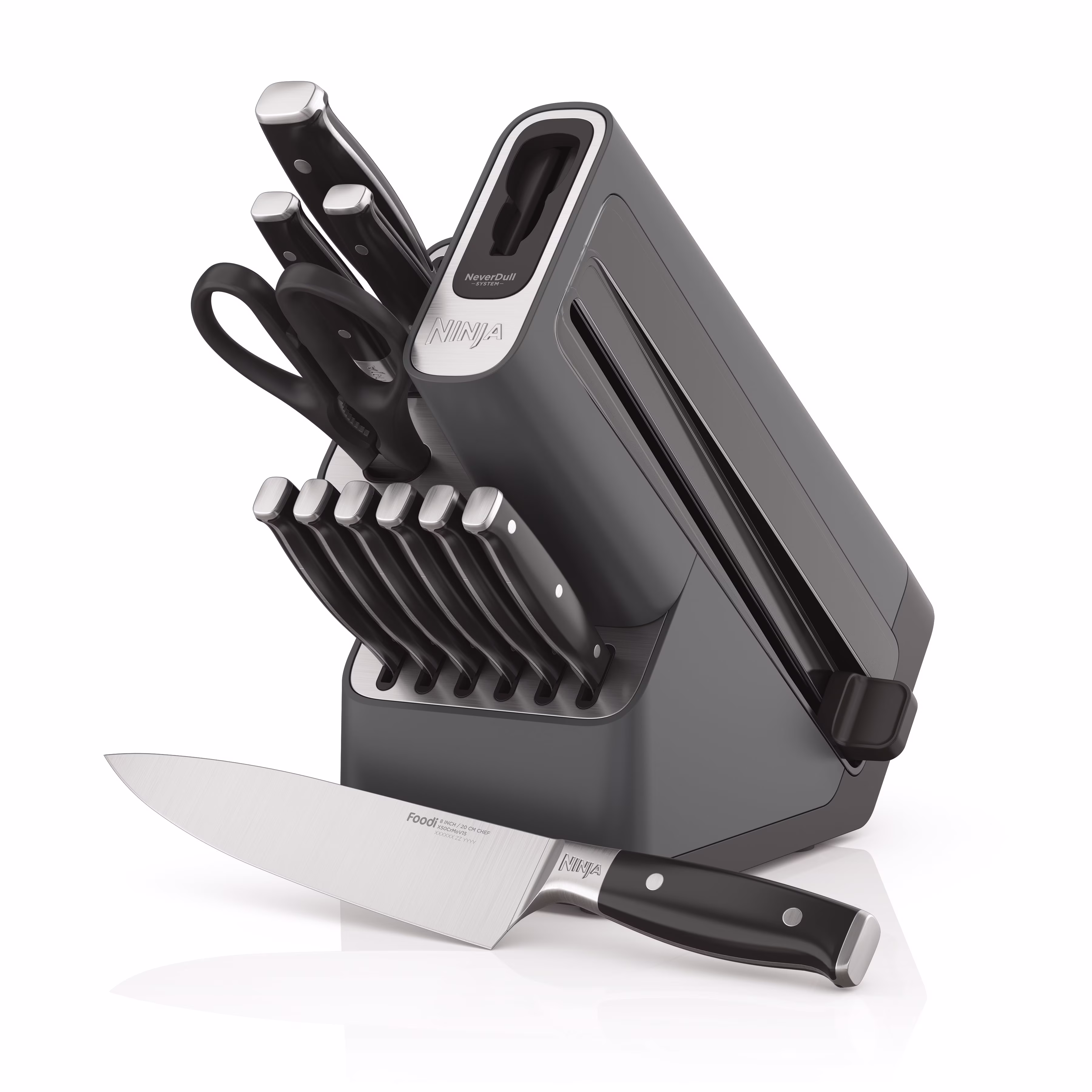 - NeverDull Technology is conveniently built into the storage block for professional sharpening results that will maintain a razor-sharp edge for over 10 years!