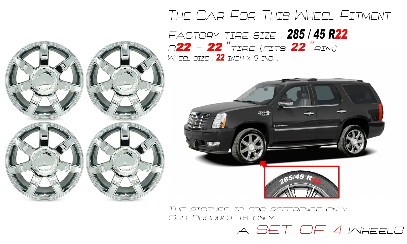 - ? This Fits: ? ESCALADE ESV EXT 2007-2014 22x9, 7 spoke .. ? OEM Tire Size: 285/45R22 ? Color/Finish: Chrome