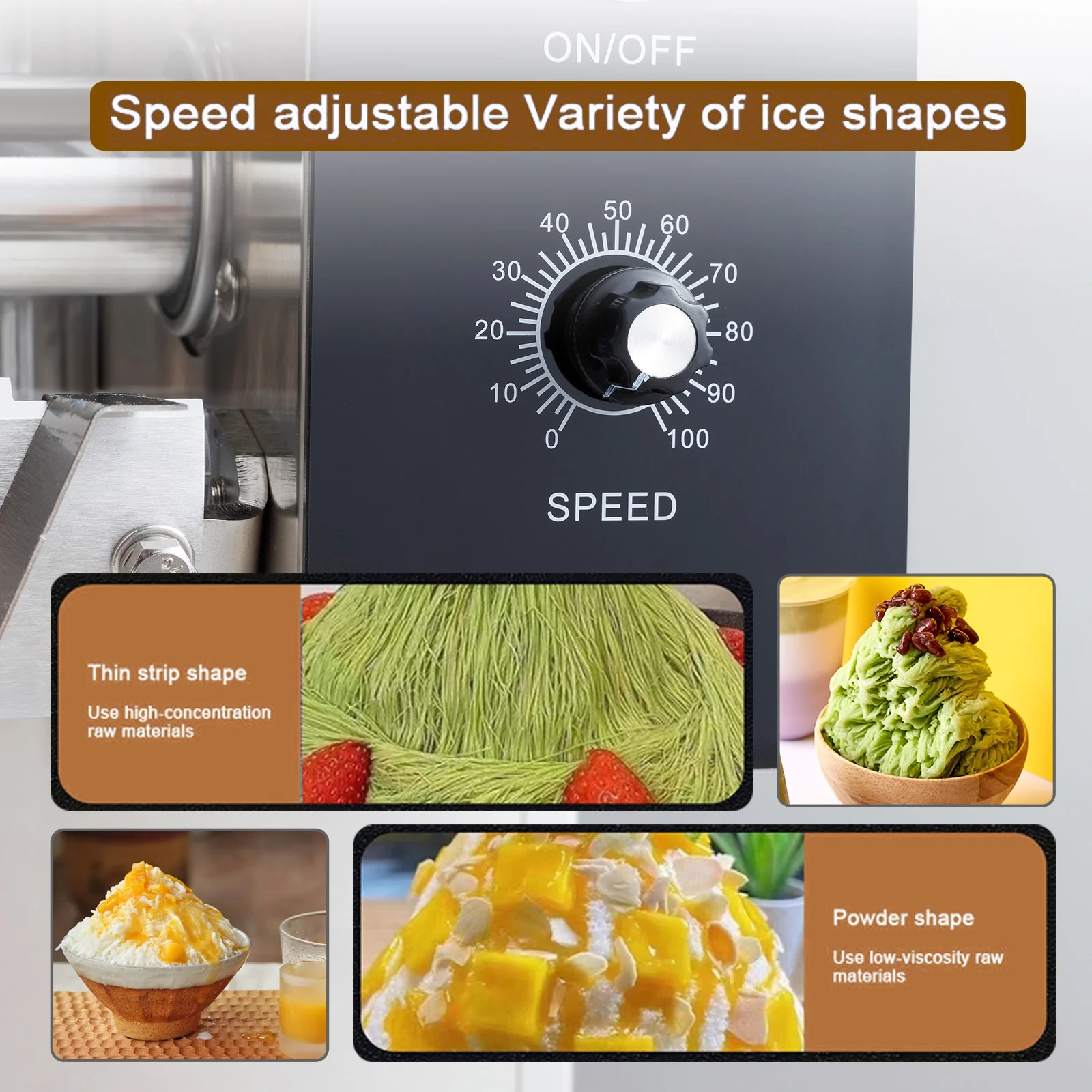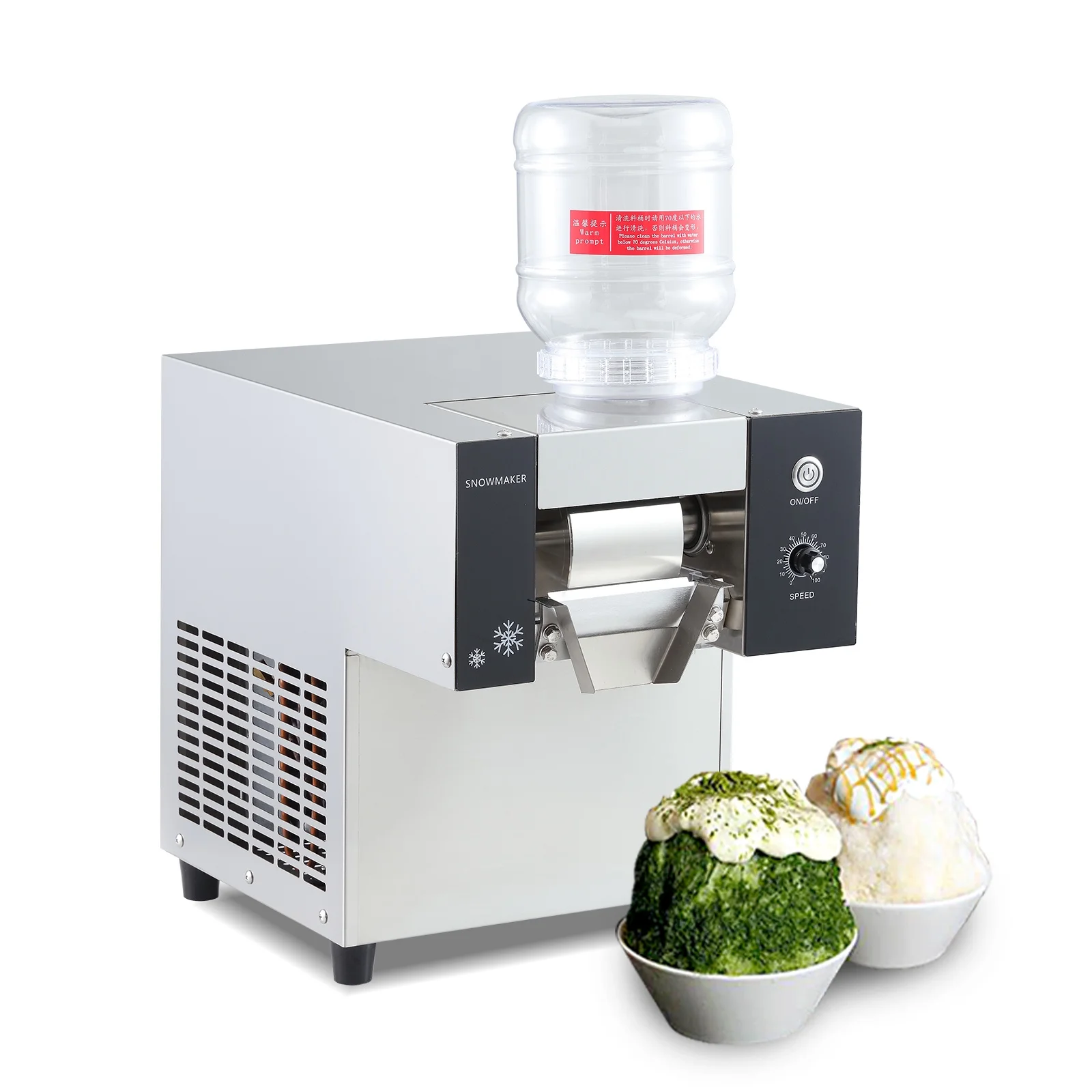 Kolice snowflake ice machine. Snow Cone Maker,110V 60HZ, 780W, US plug. Air Cooling. Stainless steel blade, druable and sharp. Machine comes with 2 buckets. 3L/bucket.Quality compressor, already filled with full refrigerant before delivery. Equipped with high-speed, efficient motor,a large ice drawer,capacity: 170kg(374lbs)/day, providing a large amount of ice for your daily and business use.Speed 1-100 can be adjusted to meet different needs. Microcomputer system control. Food grade 304 stainless steel freezing roller, stronger freezing. Perfect for making slushies,snow cones, milkshakes, yogurt freezes and other delicious frozen drinks.milk, fruit juice, coffee, beer, wine or other flavored juice to make the base. Please make sure the juice contains more sugar, DOT NOT USE THICK YOGURT. Then you can DIY with sweet toppings like chopped fruits, fruit syrup, chocolate, ice cream, condensed milk, red beans, nuts, boba, sago,etc.