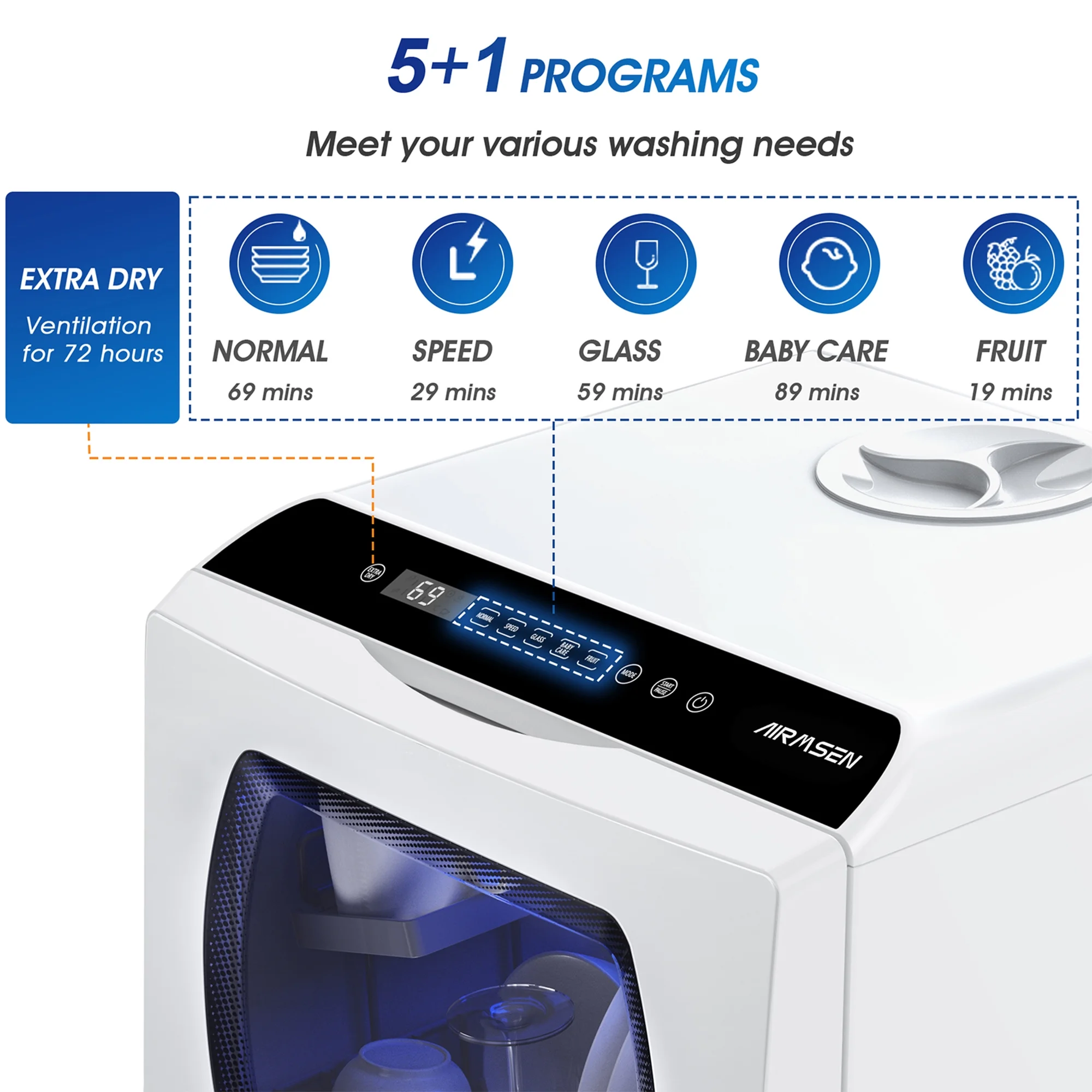 ��5+1 Wash Programs��Choose from 5 wash cycles: Normal, Speed (29 mins), Glass, Baby Care (with steam), and Fruit. Enhance your wash with extra drying functions: provides 60 minutes of hot air drying and 72 hours of fresh air circulation to prevent odors and keep dishes clean until use.