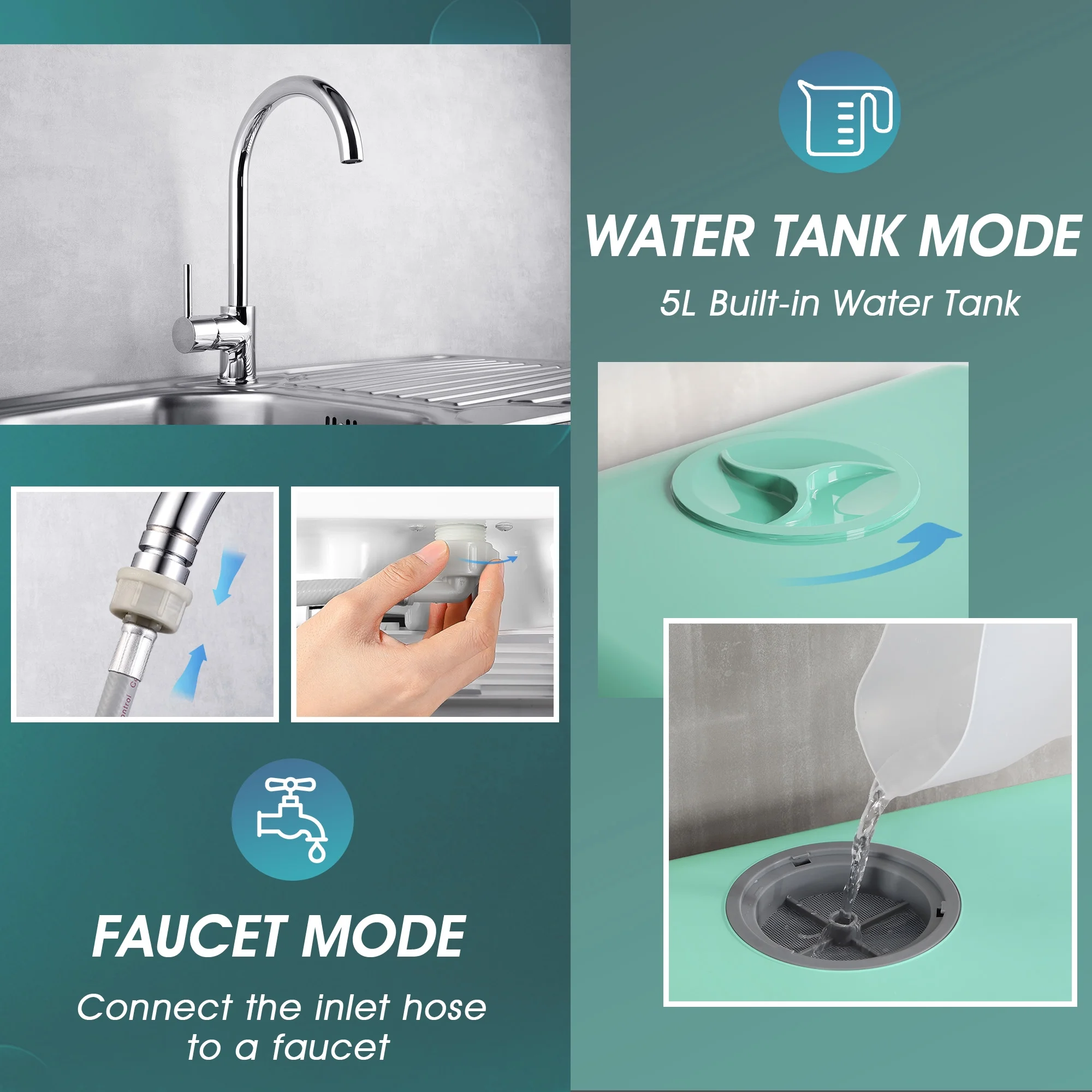 ��Dual Water Supply Options��Use it anywhere with the built-in 5L water tank��no need for plumbing or permanent installation, and automatic water level indicator lets you know when the correct water level has been reached. Or, connect it directly to your kitchen faucet with the included hose. Perfect flexibility for modern living.