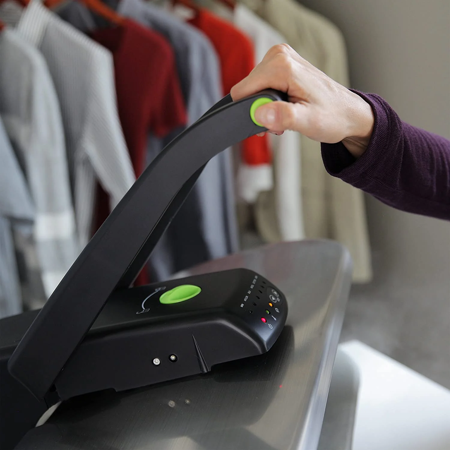 - MULTIPLE FABRIC SETTINGS �� Digital controls with 5 fabric settings (nylon, silk, wool, cotton, linen), two steam burst buttons located on the handle produce a powerful burst of steam