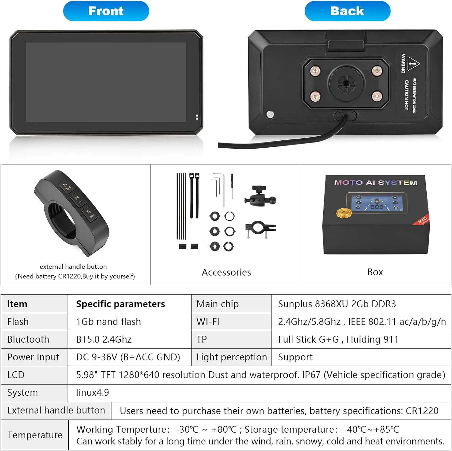 5.98 inch waterproof, IP67 anti-glare LCD screen, 1280*640 resolution, Sunplus 8368XU 2Gb DDR3 main chip, Linux 4.9 System, 2.4Ghz/5.8Ghz Wifi, 2.4Ghz BT5.0 Bluetooth, it can work stably for a long time under the wind, rain, cold and heat environment.