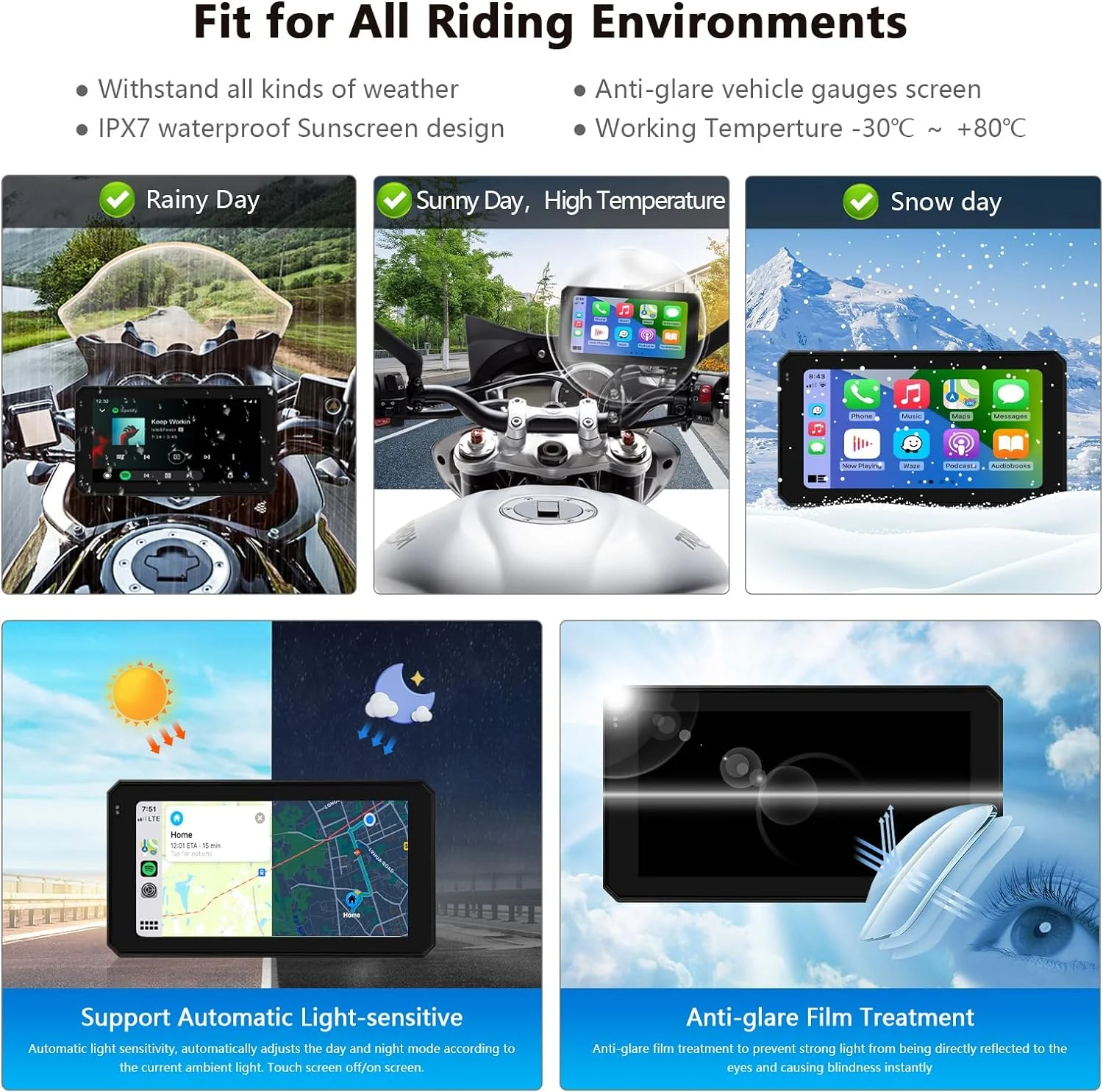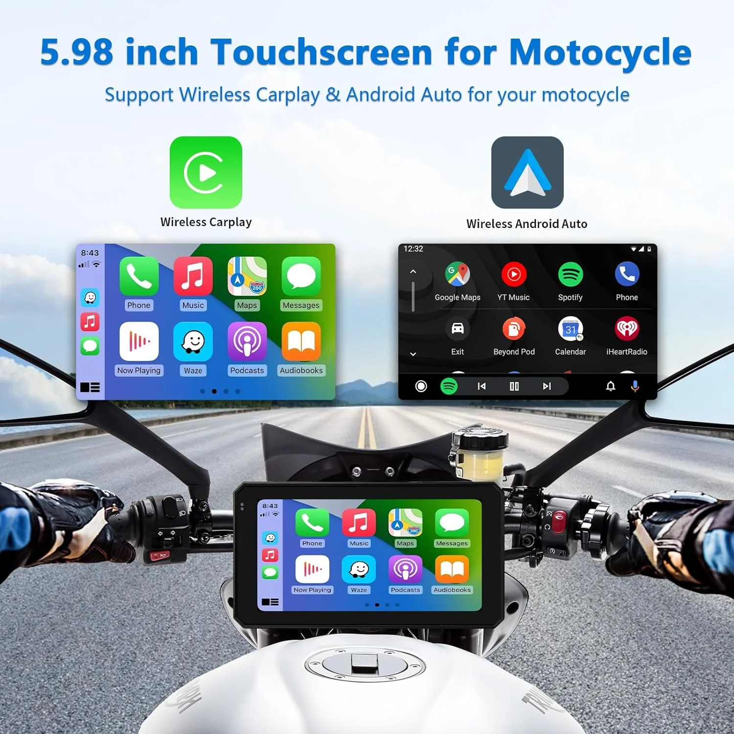 Wireless Carplay Wireless Android Auto Touchscreen for Motorcycle, Road Top Waterproof 5.98 in Touch Screen Device GPS Navigation for Motorbike, Stereo Receiver Bluetooth Monitor
