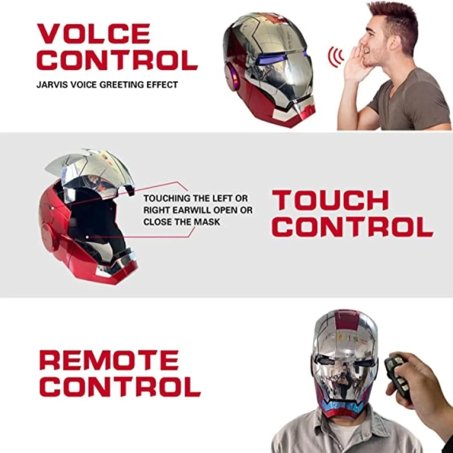 - Smart Features for the Modern Hero: Equipped with intelligent voice control, this Iron Superhero helmet responds to your commands, making it a perfect blend of technology and style. Easily switch between modes and watch as the helmet opens and lights up with a single phrase!