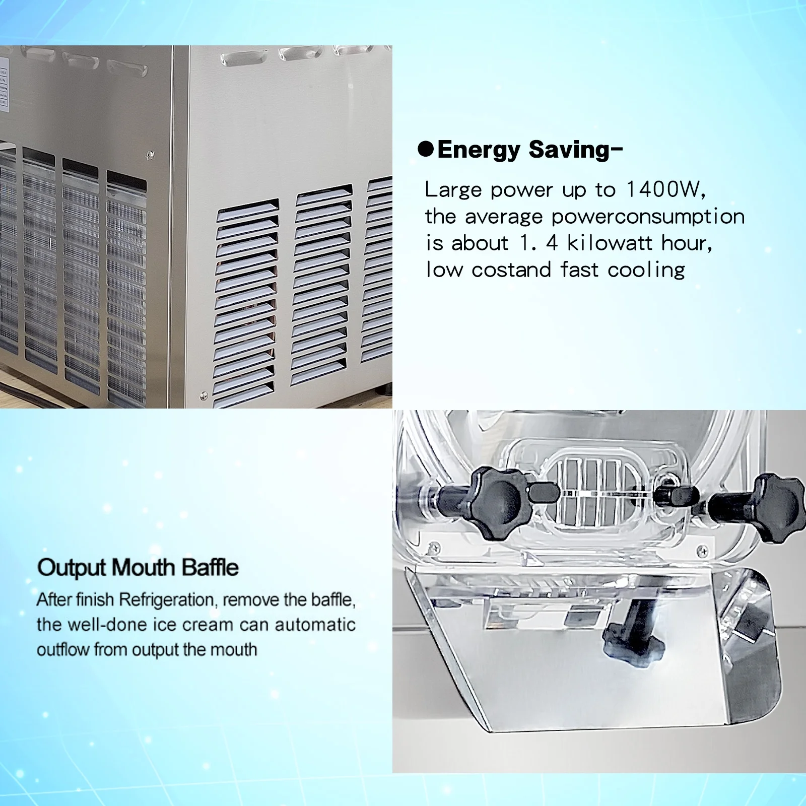 Kolice Countertop design hard ice cream machine,italian water ice maker, 110V 60HZ, 1400W, US plug. Dimensions: 435*490*650mm(17.13''x19.29''x25.6''), N.W.: 110 lbs (50kg), plywood case packing. Freezing cylinder: 4.5L(1.19 gal), Production capacity: 4 gal/hour(15L/hour). Intelligent control panel, easy to opearate. Timer control, one-key automatically running, one key auto washing, current overload protection. Fast mixing beater. Food grade material. Quality compressor, already filled in full refrigerant before delivery. Widely be used in ice cream store, bars, cafes, milk-tea stores, dessert shops, food carts, restaurants, hotels, food truack, trailer, office and so on. It is also suitable for small business.Kolice Countertop design hard ice cream machine,italian water ice maker