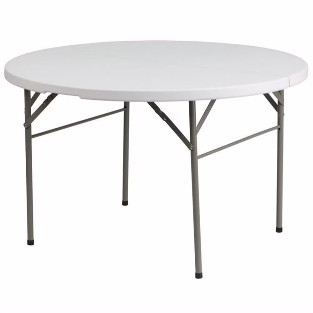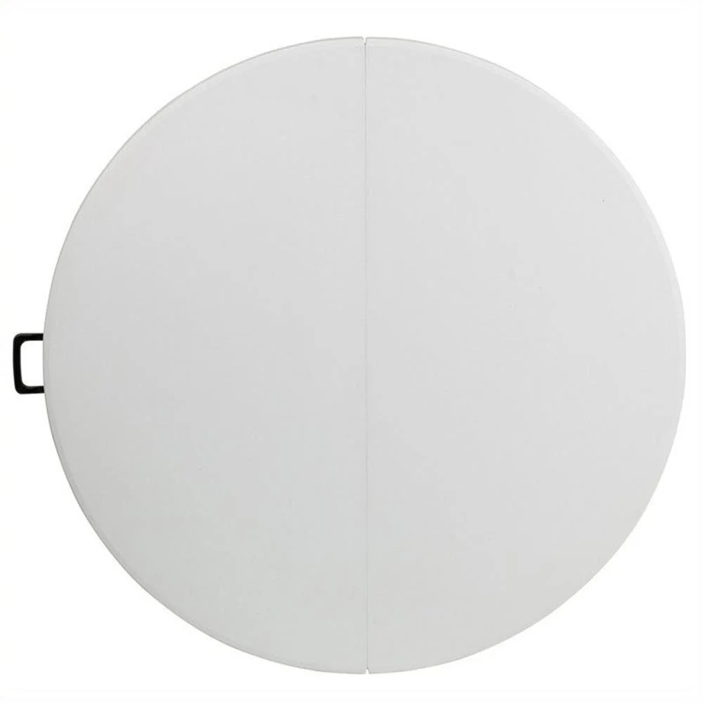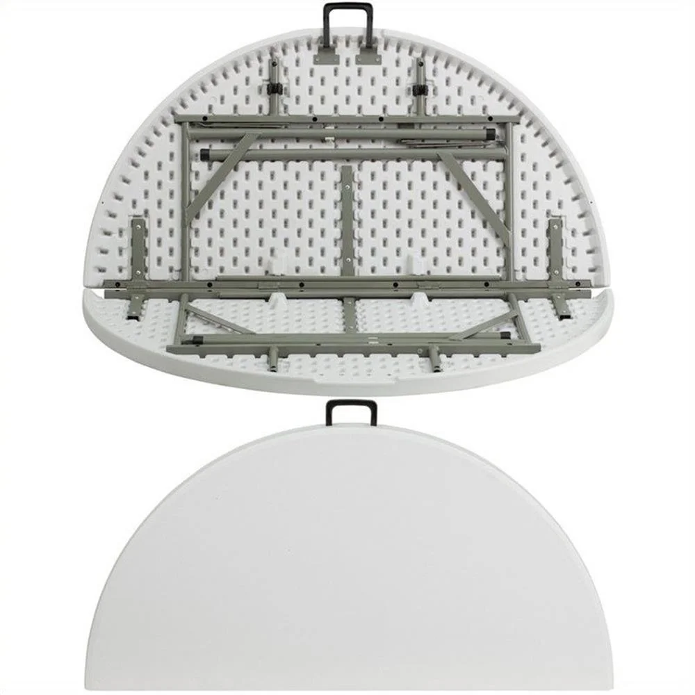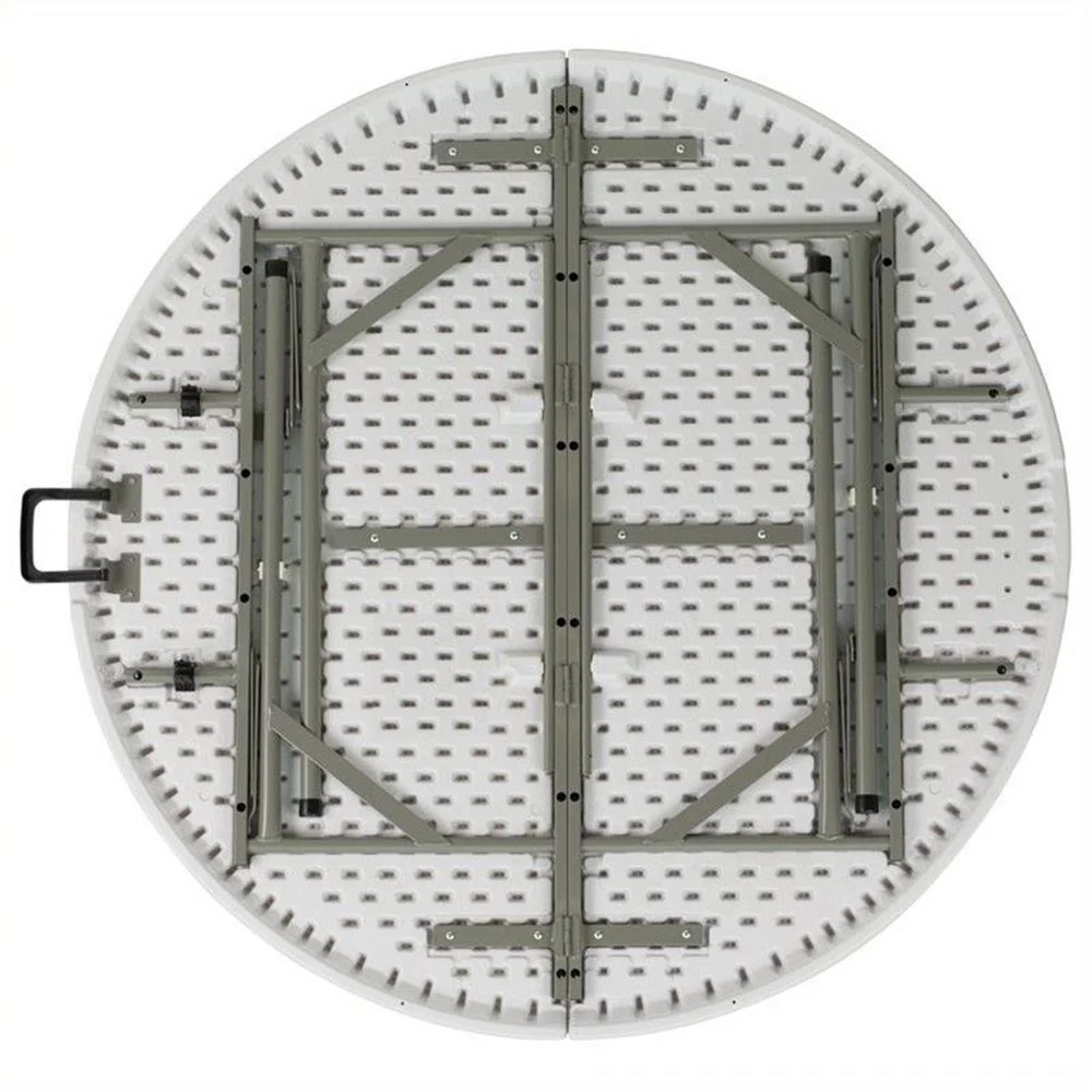 This round folding table is beneficial in a multitude of environments that include banquet halls, conference centers, cafeterias, schools and in the home. The table can be used as a temporary seating solution or be setup for everyday use. The bi-fold feature folds the table in half the size and includes a carrying handle for easy transport. The durable blow molded top requires low maintenance and cleans easily. The table legs fold under the table to make storage more convenient and for better portability. This table is commercial grade to withstand everyday use in the hospitality industry.