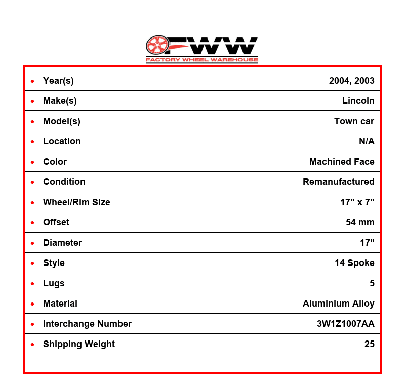 This Factory OEM LINCOLN Aluminium Alloy 14 SPOKE wheel comes stock on 2004, 2003 LINCOLN TOWN CAR. The OEM part number(s) for the rim are 3W1Z1007AA, 560. This is a 5 lug wheel with a 17 inch diameter, width of 7 inch and an offset of 54 mm. The finish on the wheel is MACHINED FACE.