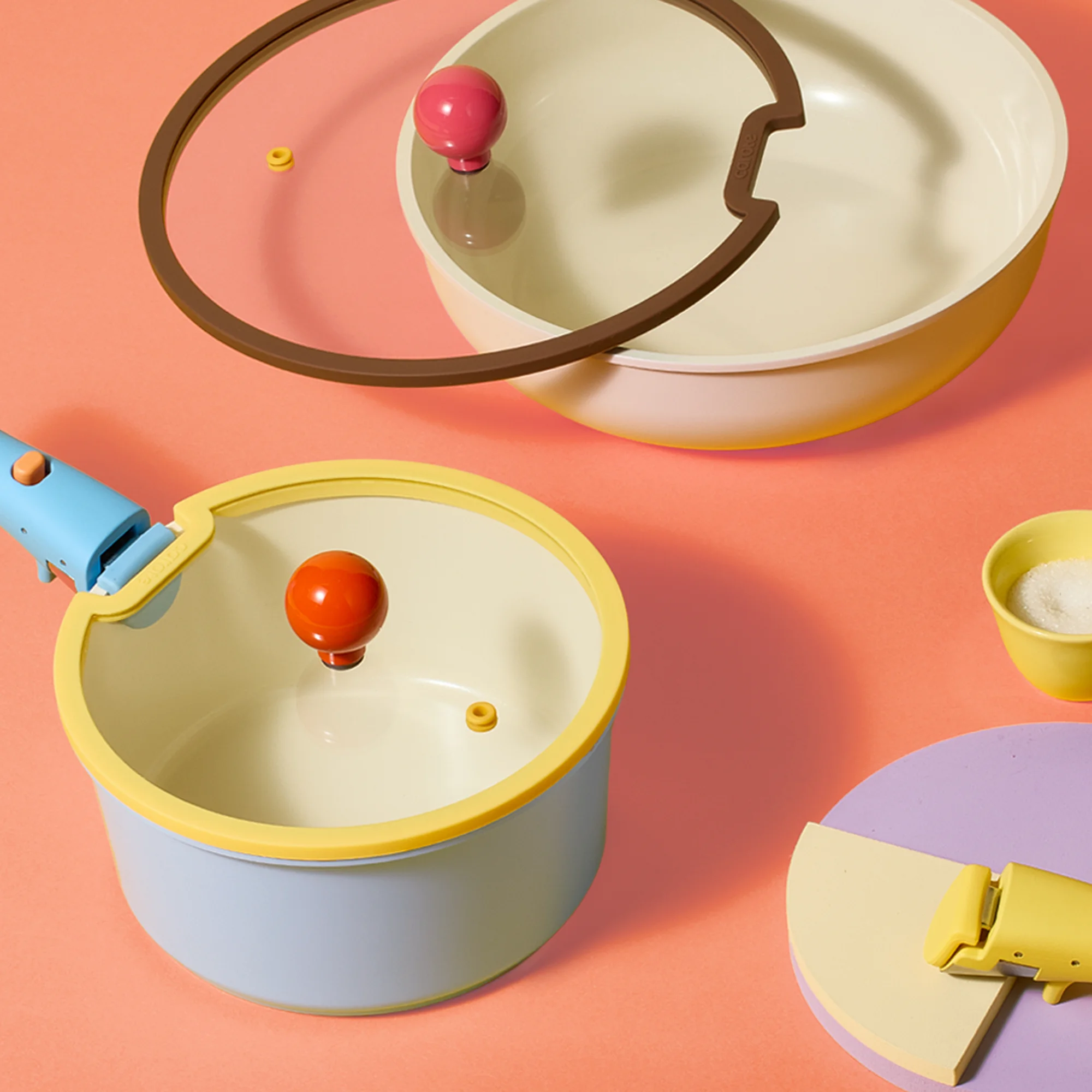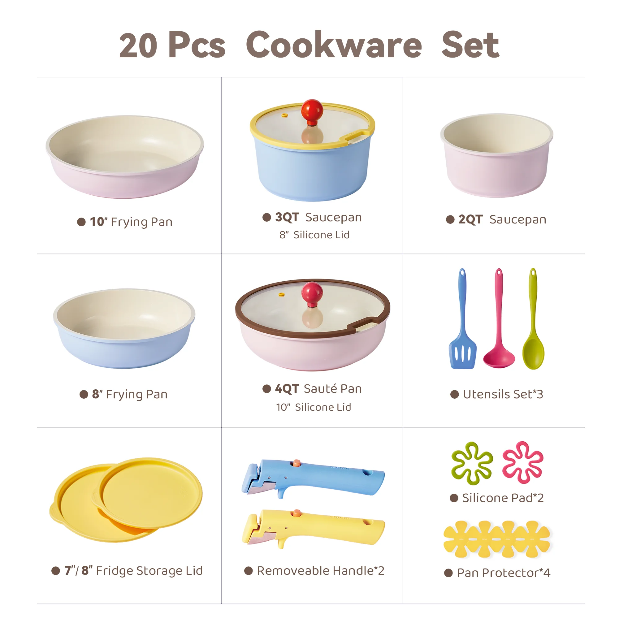 - Comprehensive Set: Includes 8" & 10" frying pans, 2QT saucepan & 3QT saucepan with 8" silicone lid, 4QT saut�� pan with 10" silicone lid, 2 removable handles, 7"/8" fridge storage lids, utensil*3, silicone pad*2, pan protector*4.
