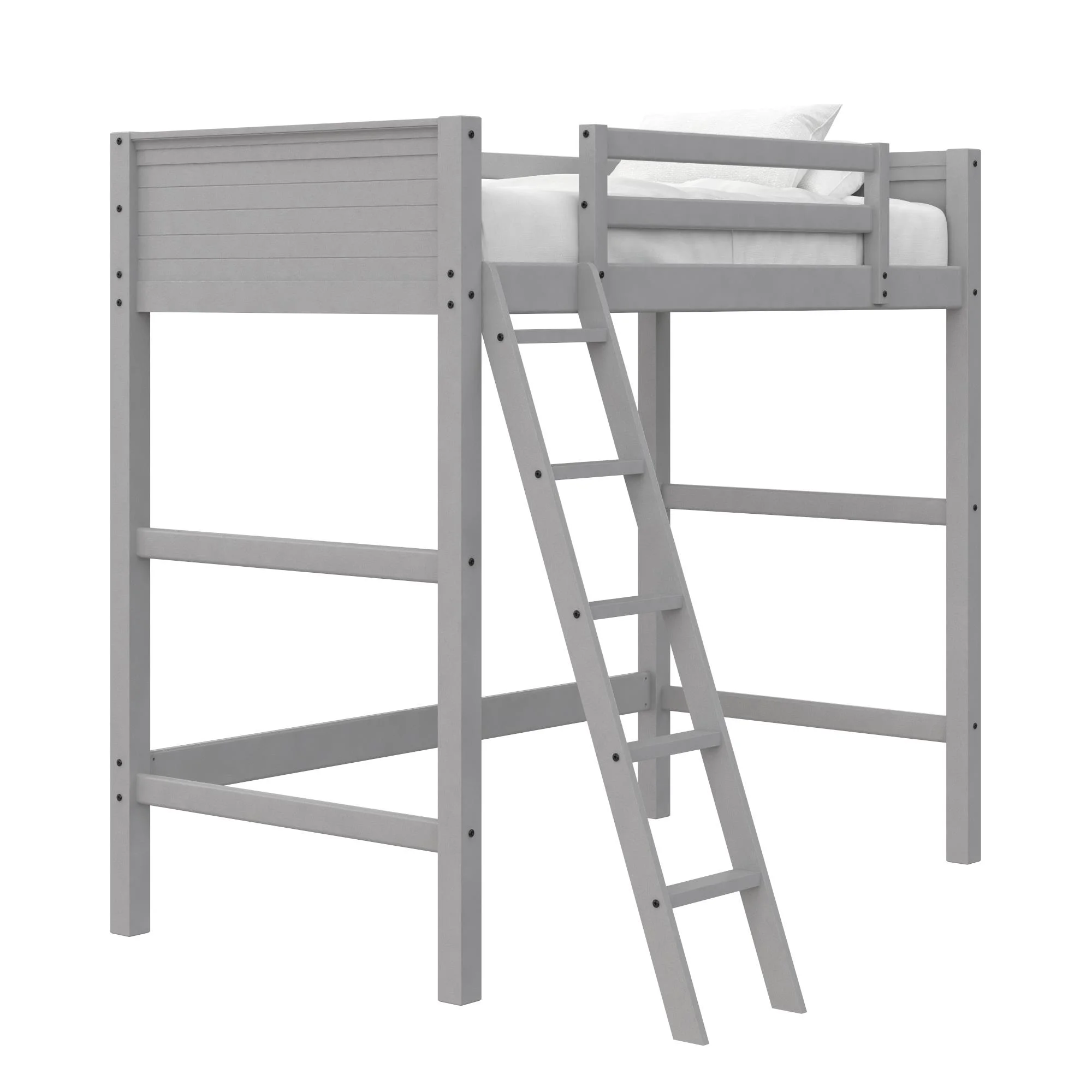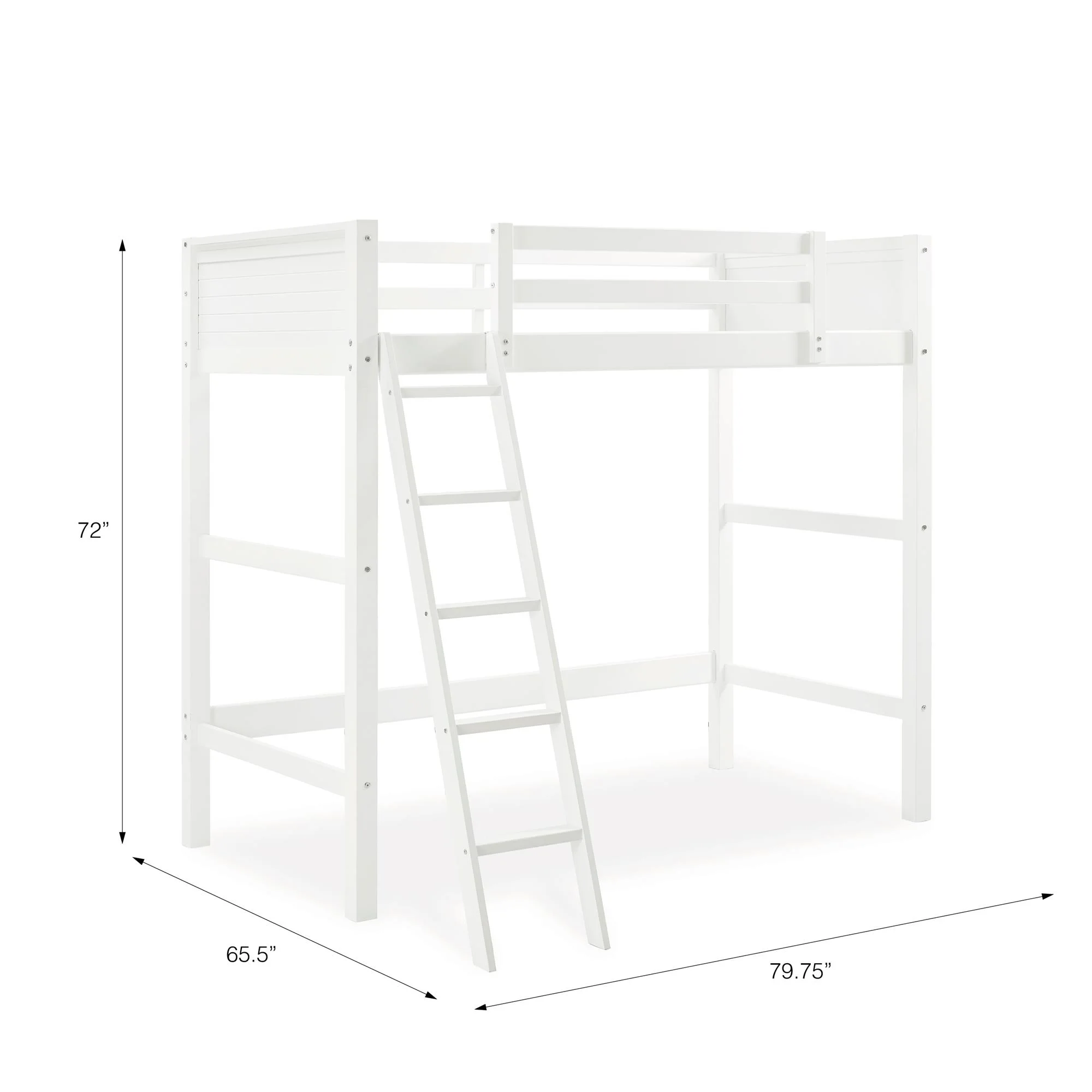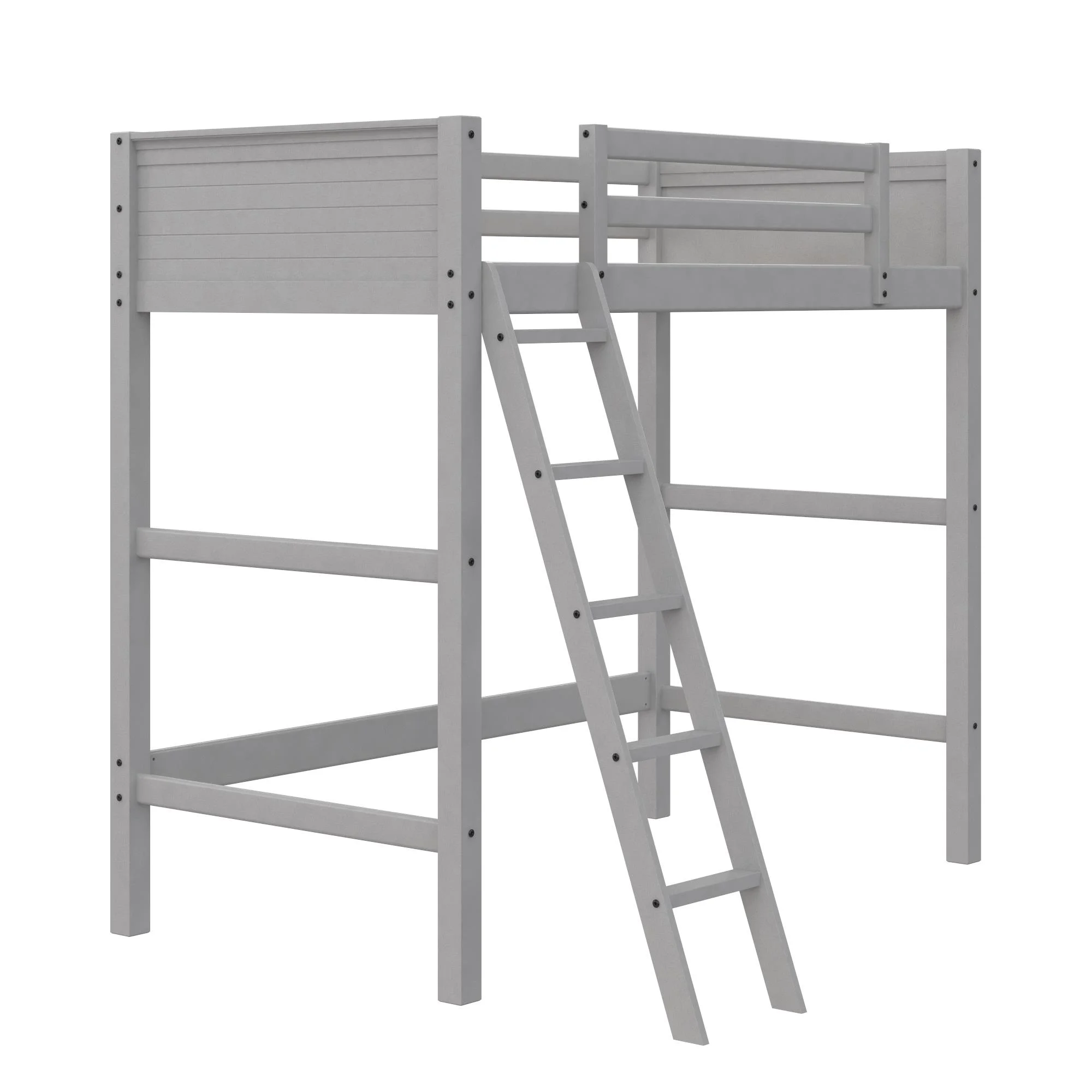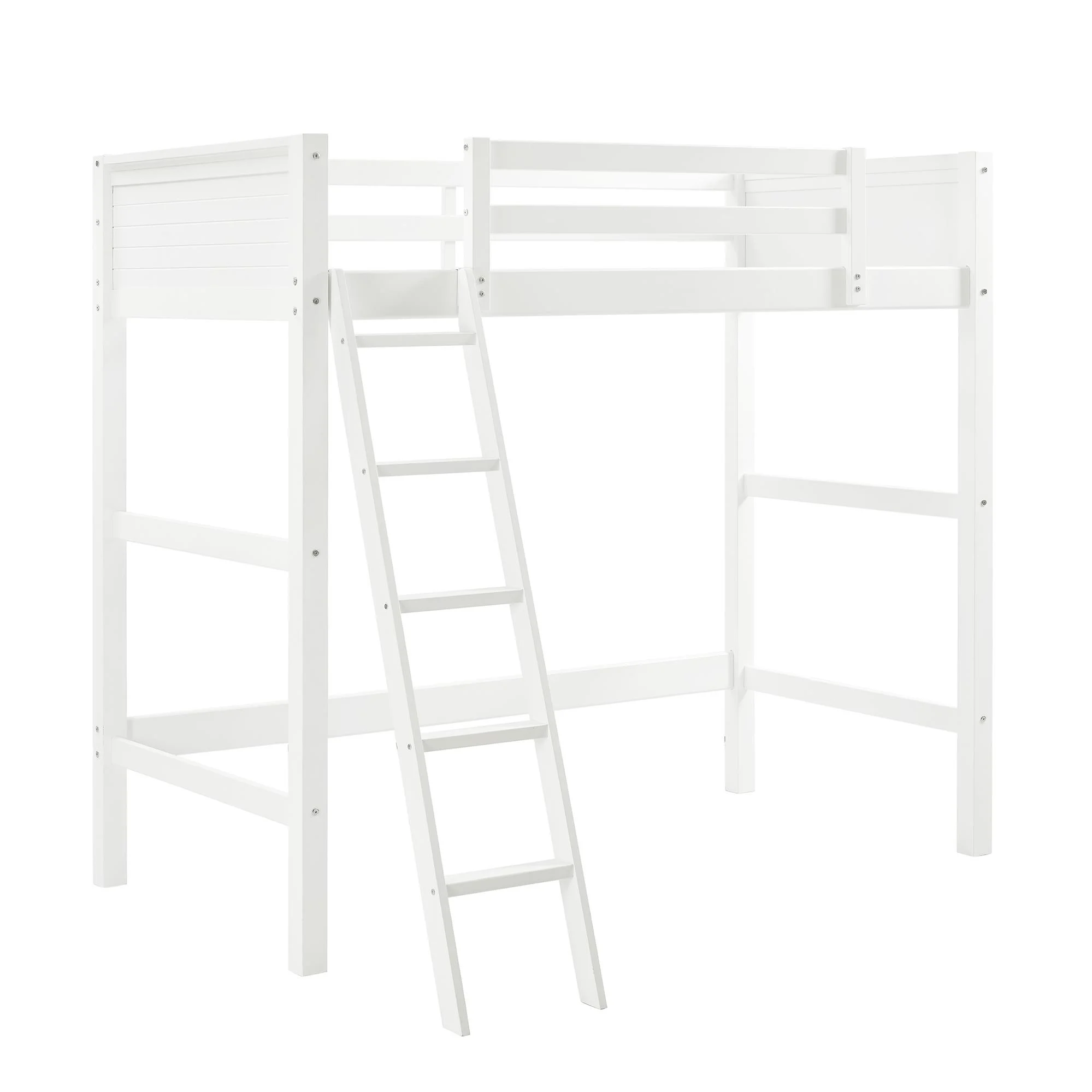 - Traditional loft bed frame for kids. Features a sturdy wood construction, a ladder, full-length guardrails and a panel design on both the headboard and footboard.