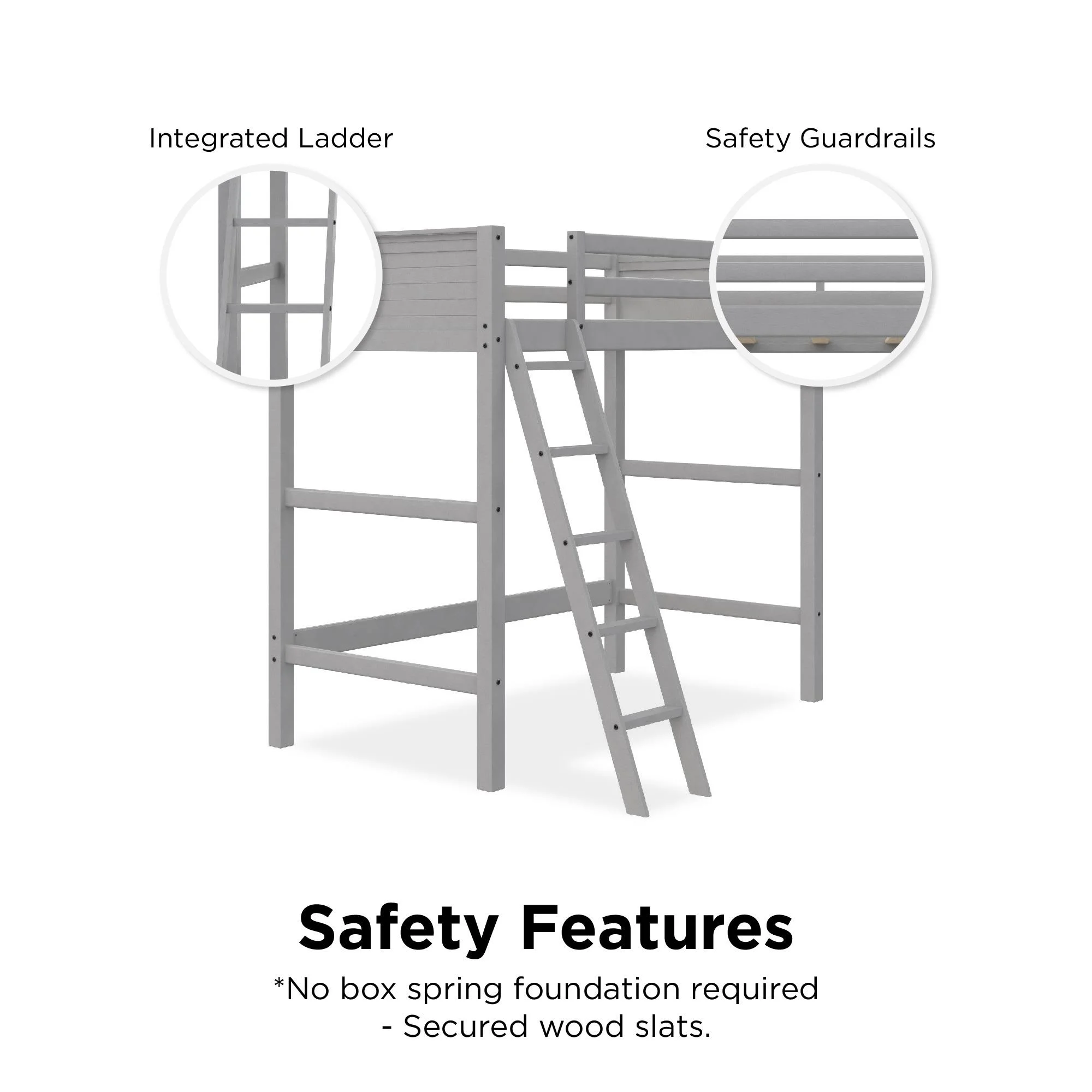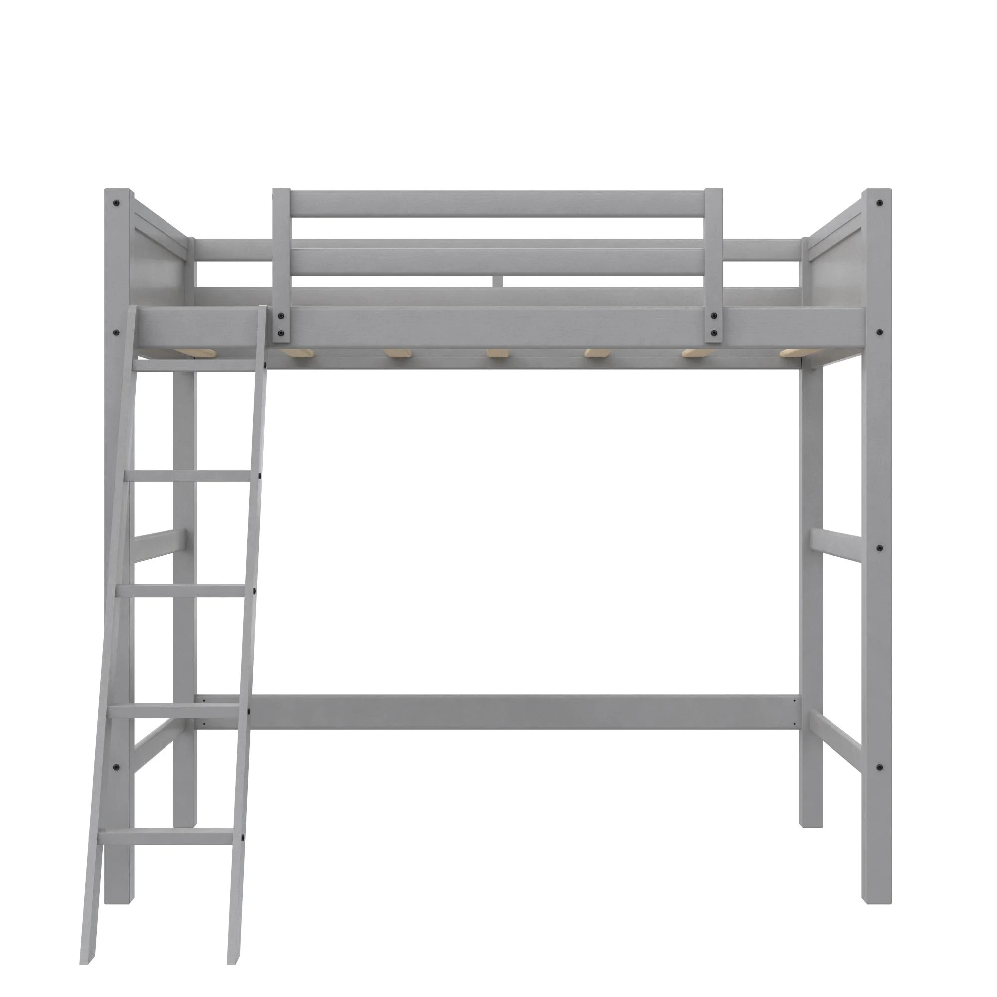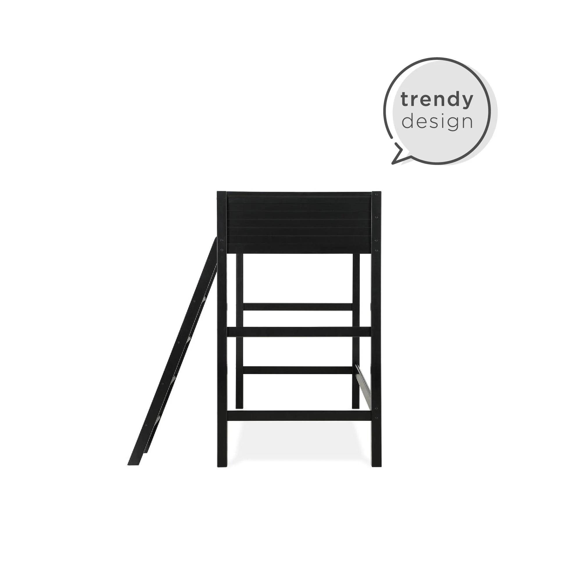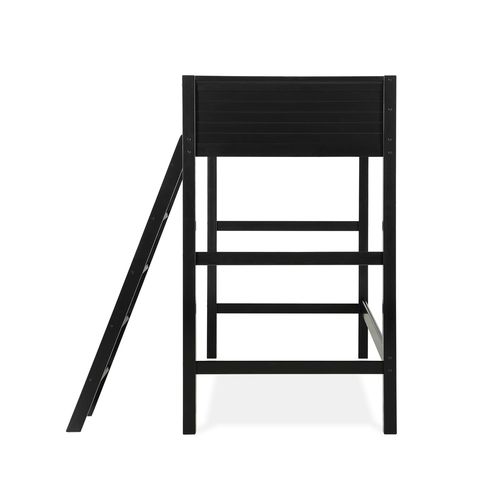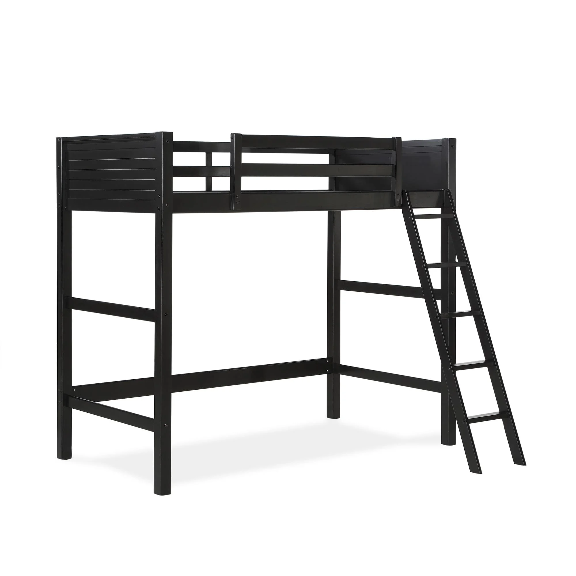 - Traditional loft bed frame for kids. Features a sturdy wood construction, a ladder, full-length guardrails and a panel design on both the headboard and footboard.