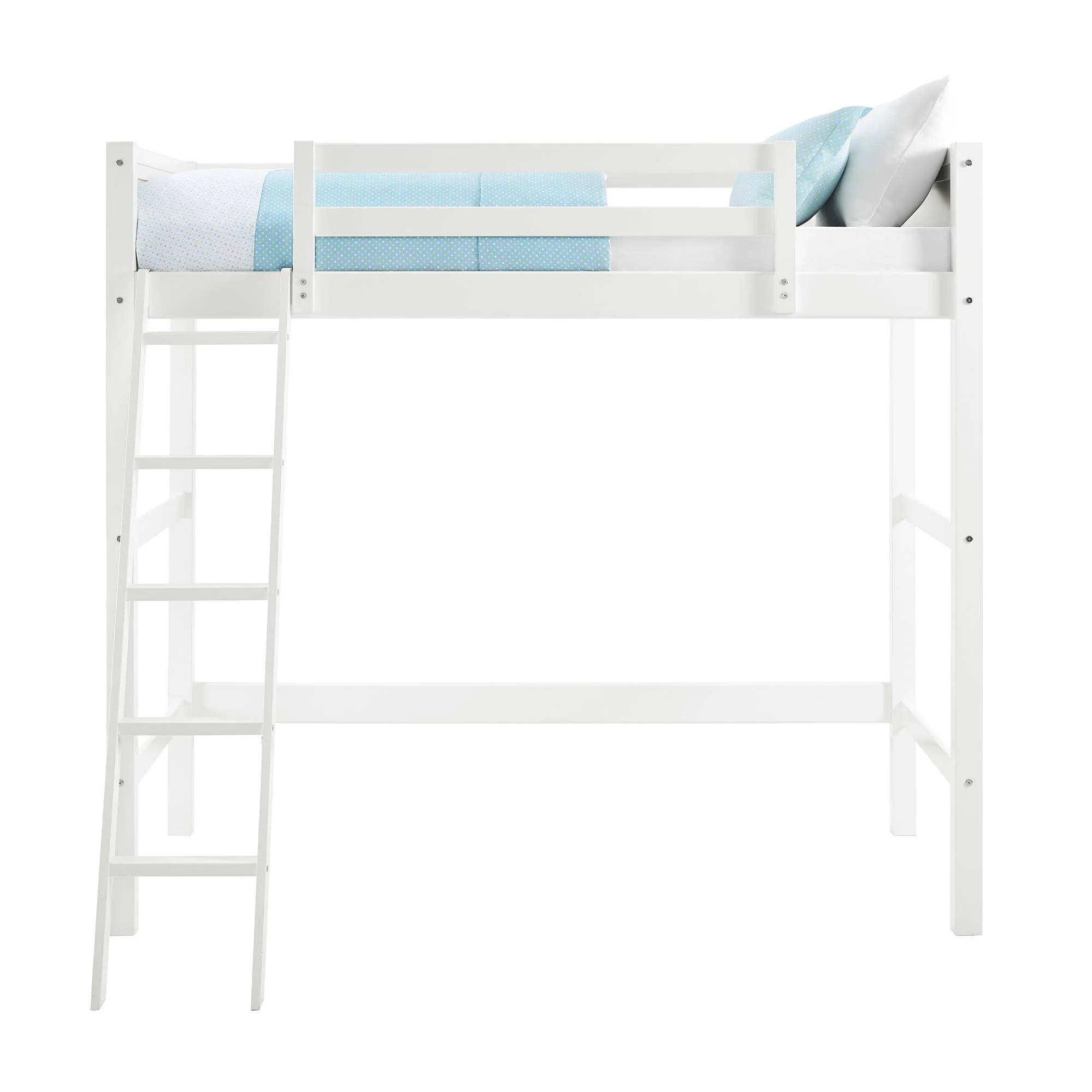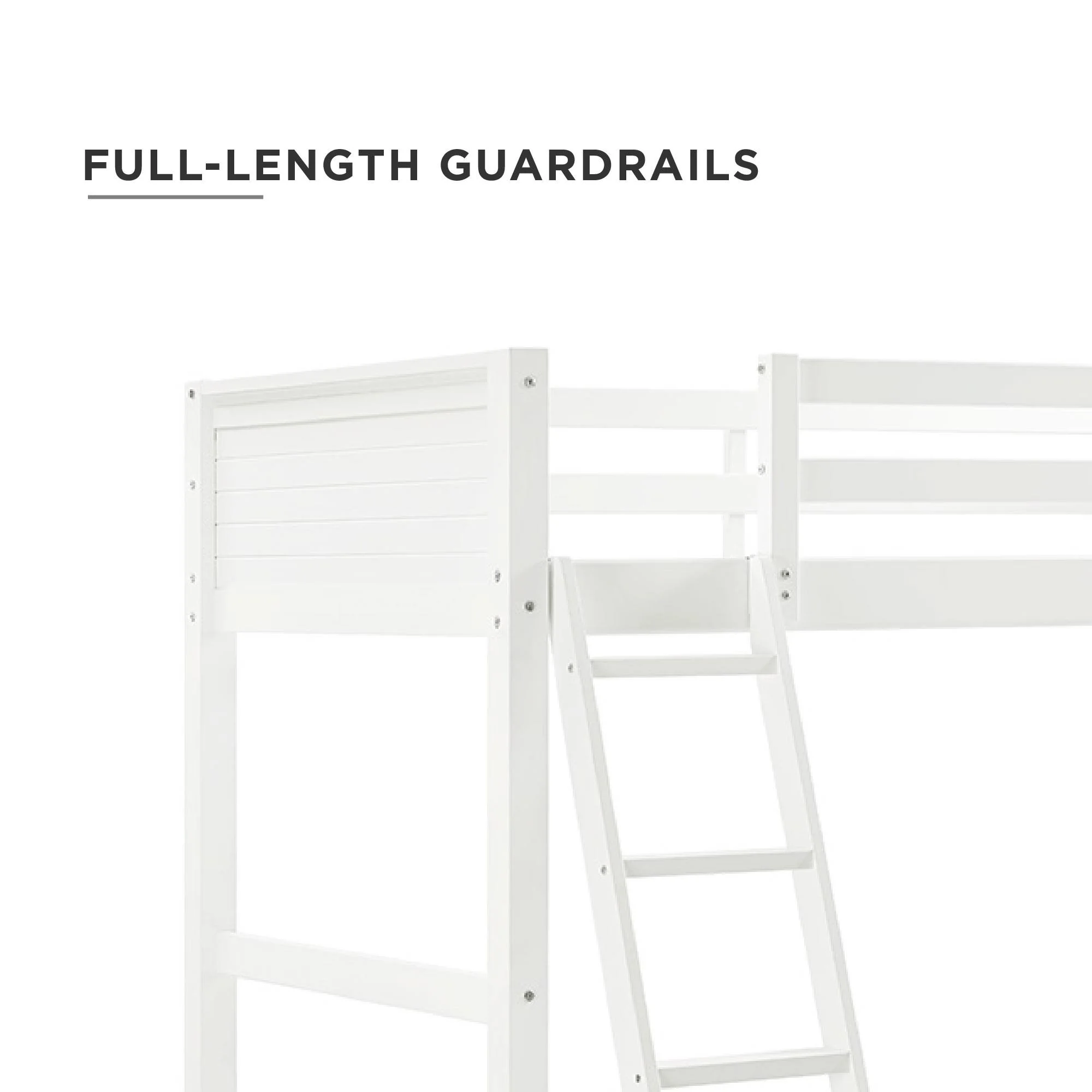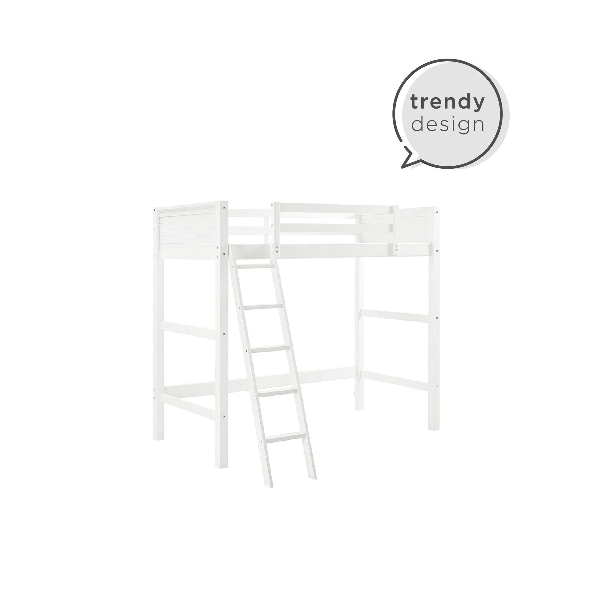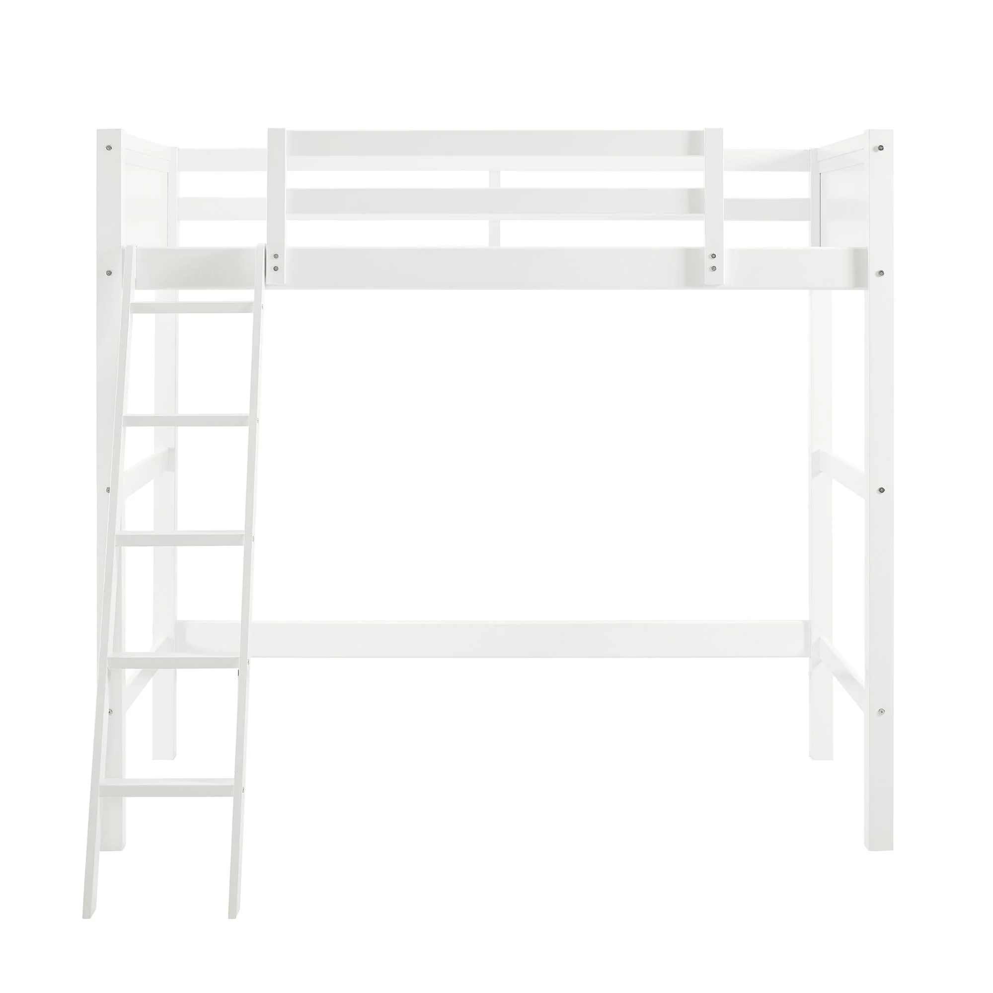 - Traditional loft bed frame for kids. Features a sturdy wood construction, a ladder, full-length guardrails and a panel design on both the headboard and footboard.