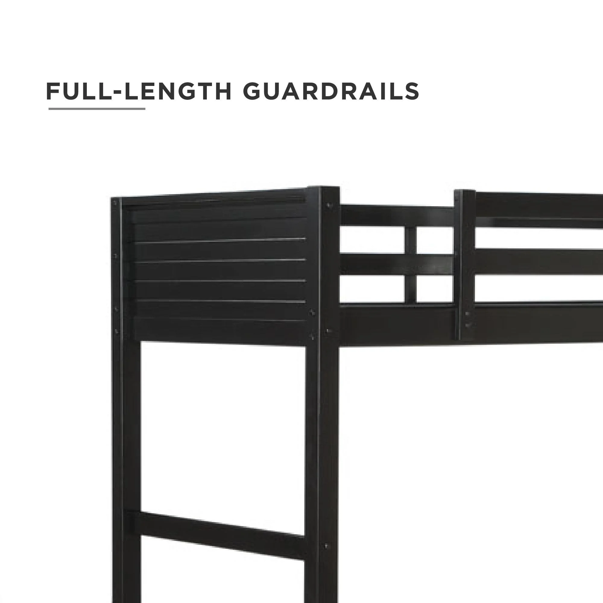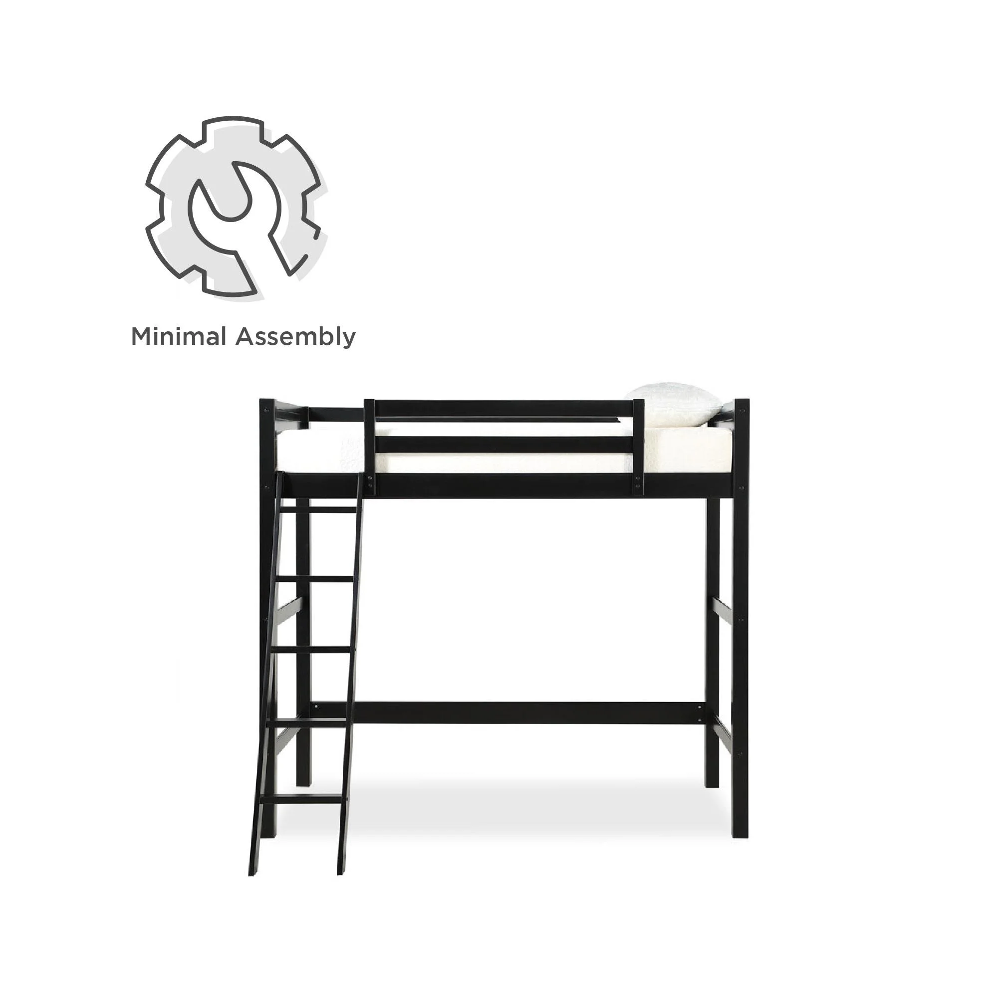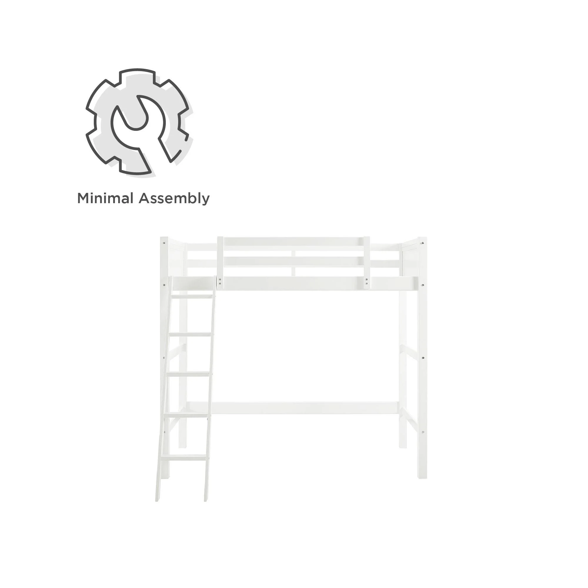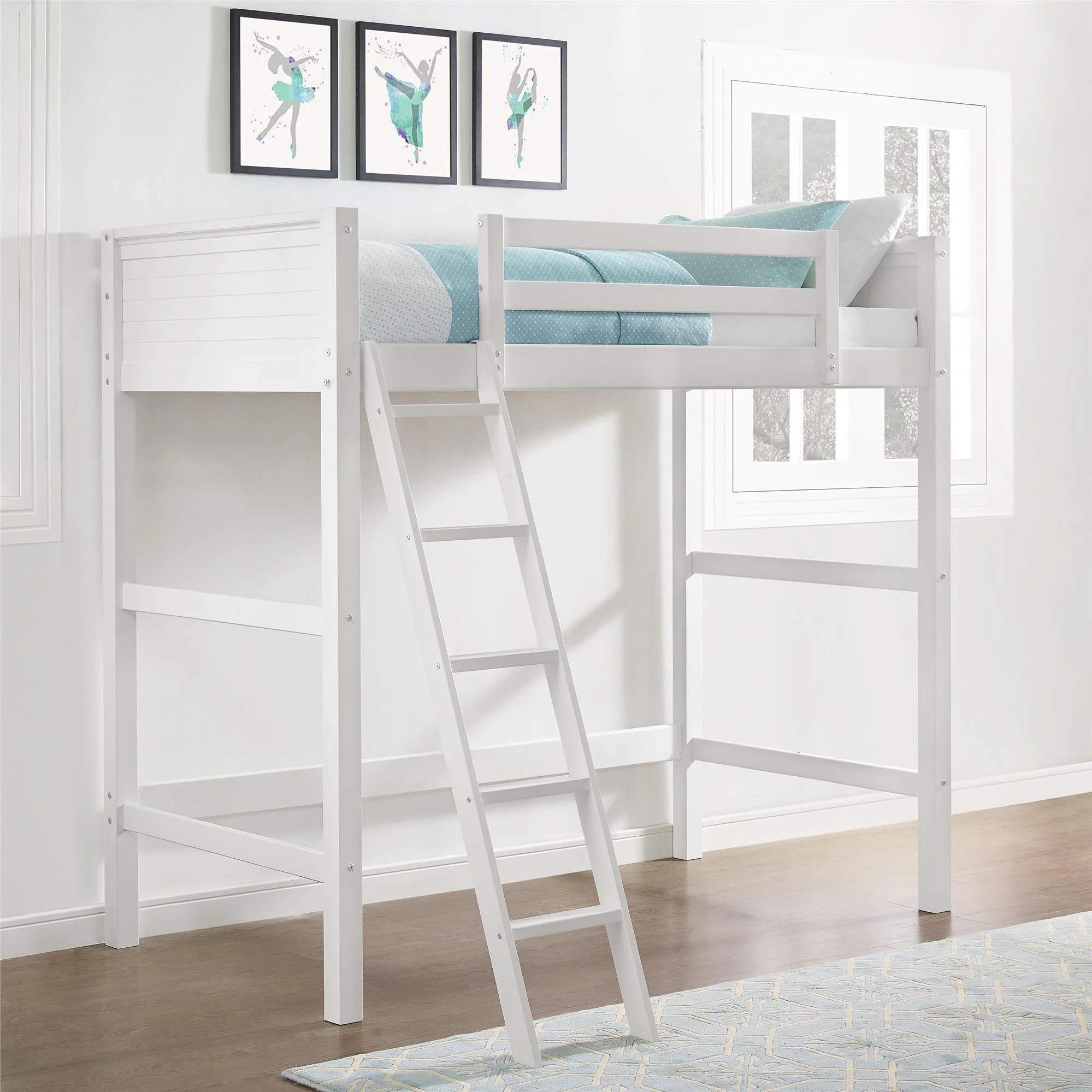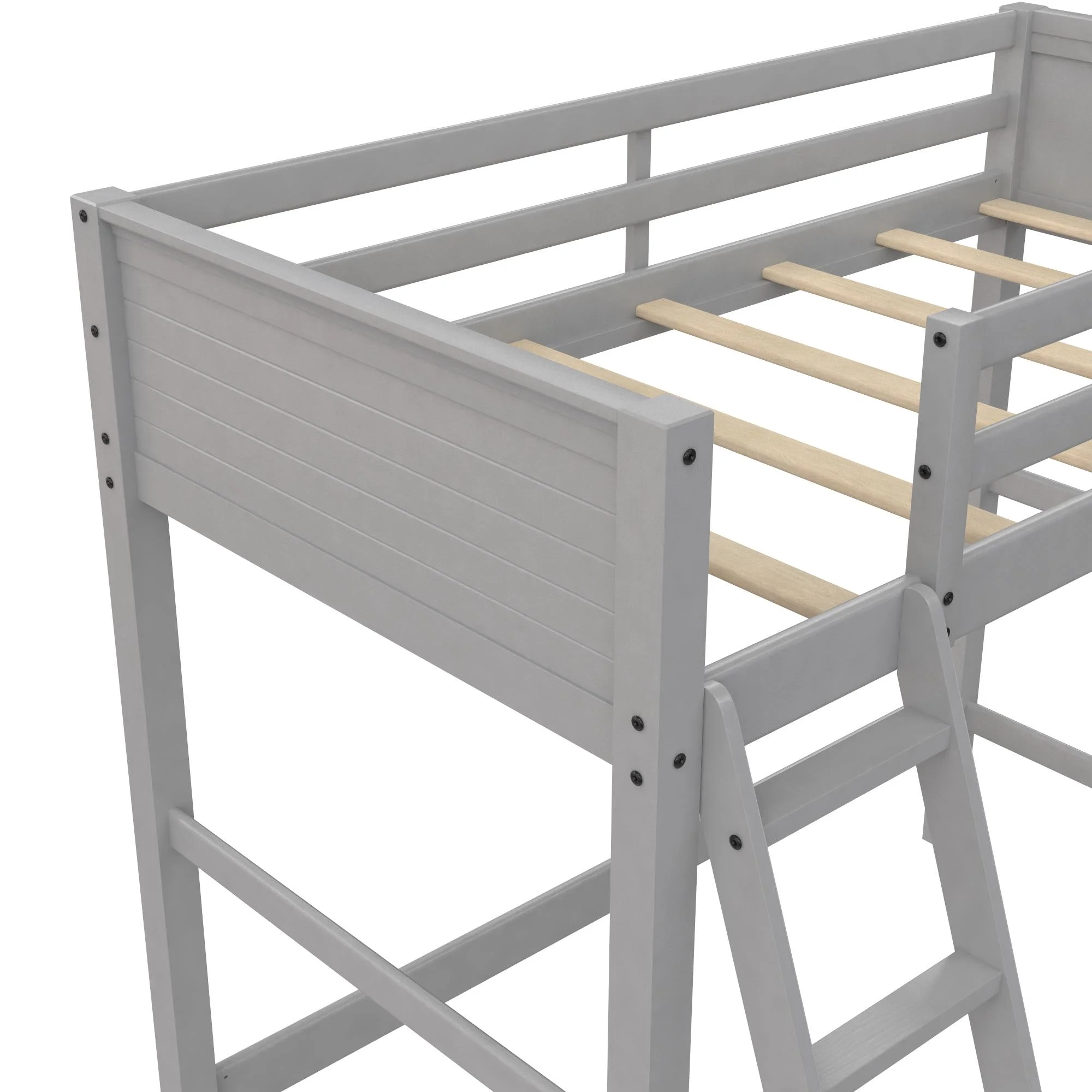 - Traditional loft bed frame for kids. Features a sturdy wood construction, a ladder, full-length guardrails and a panel design on both the headboard and footboard.