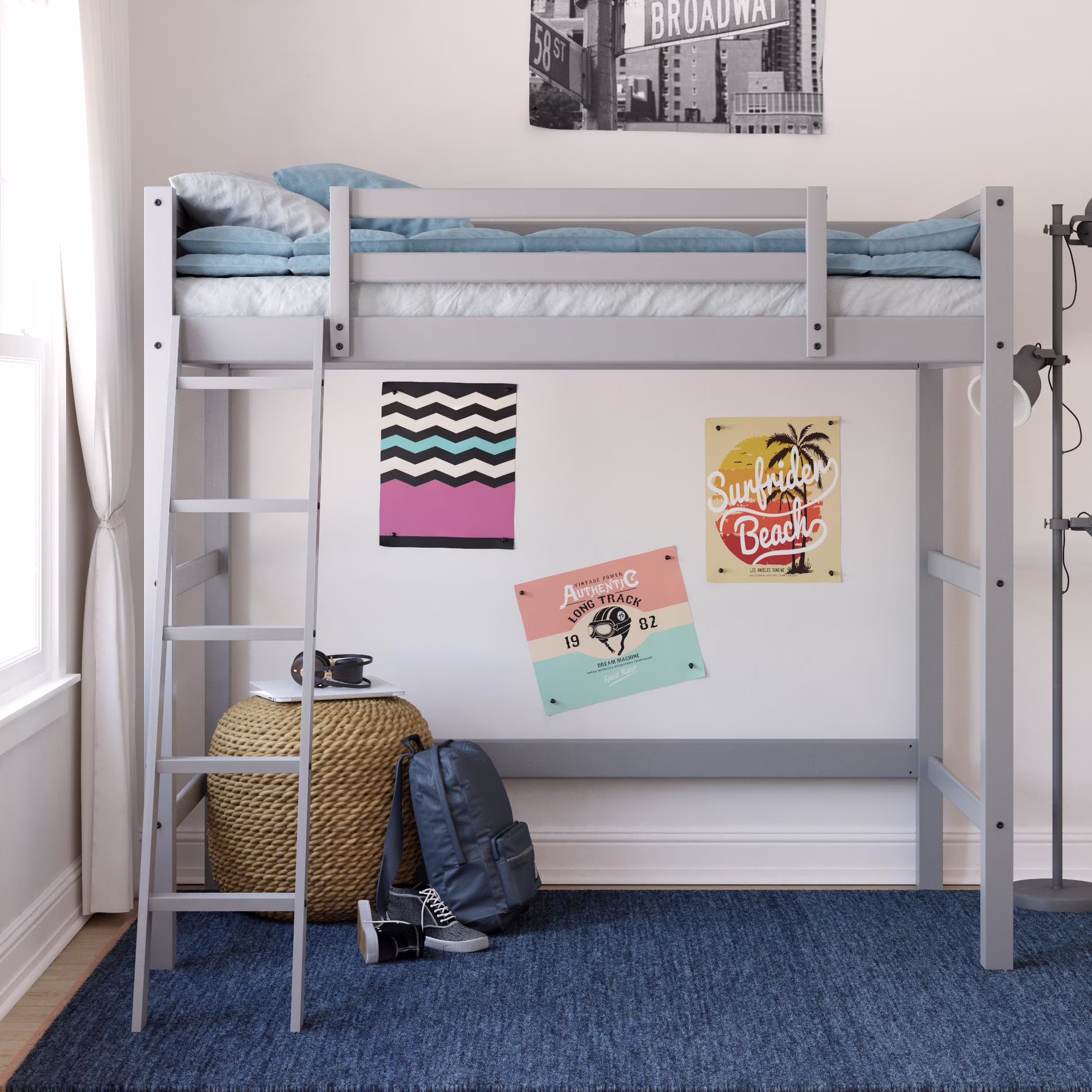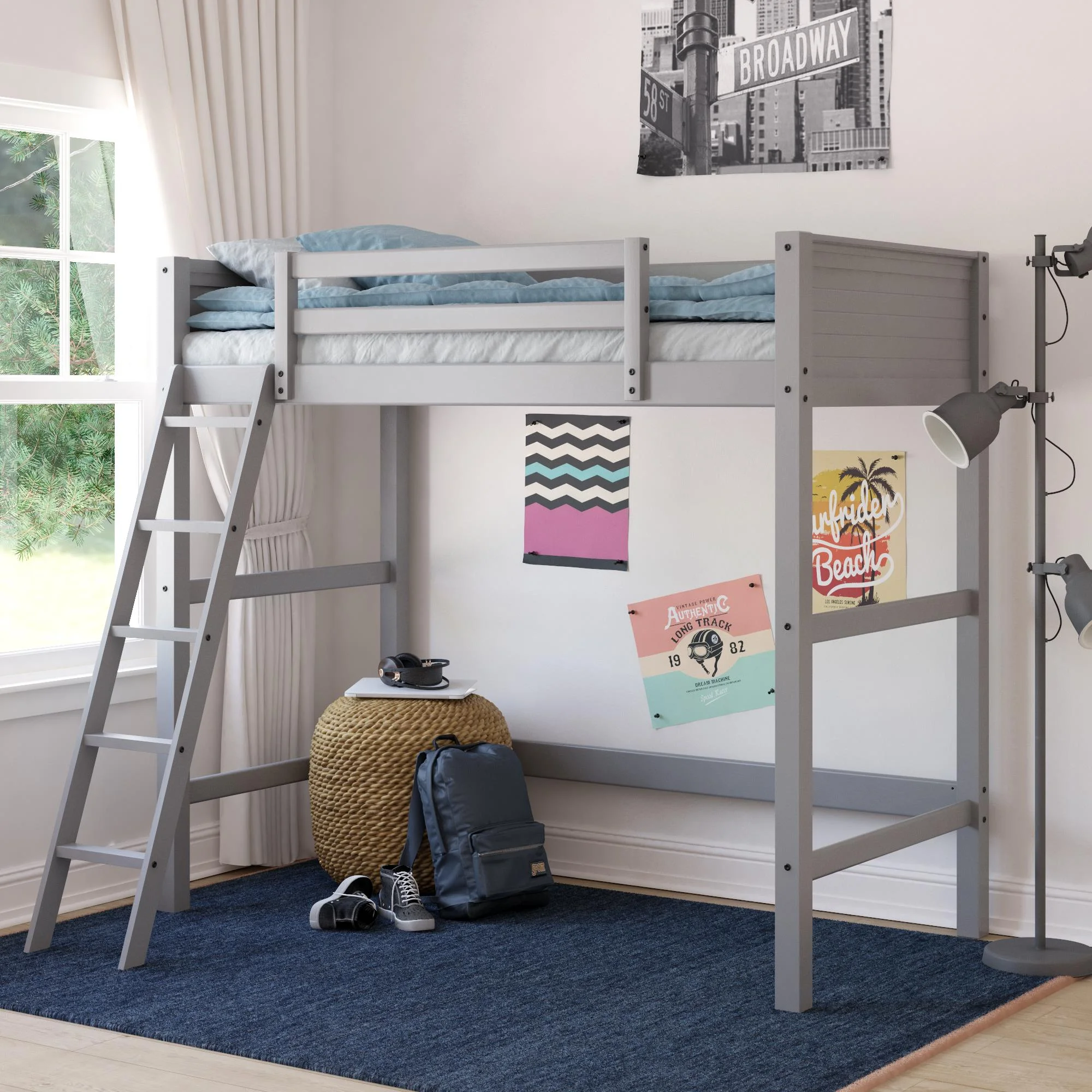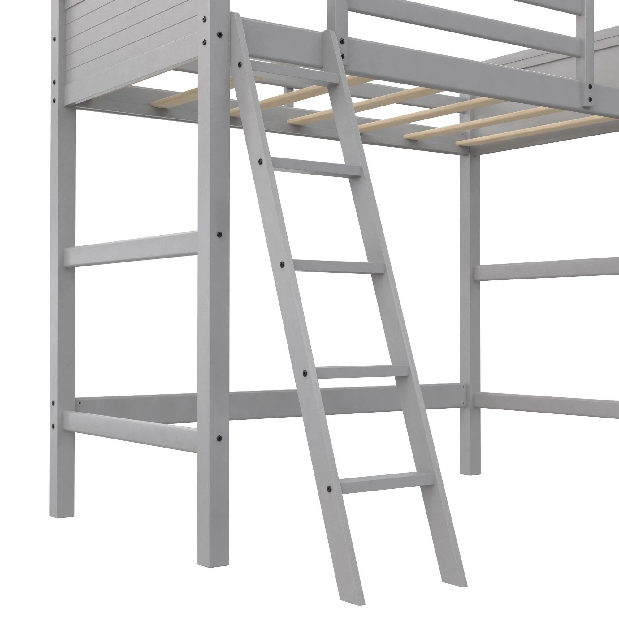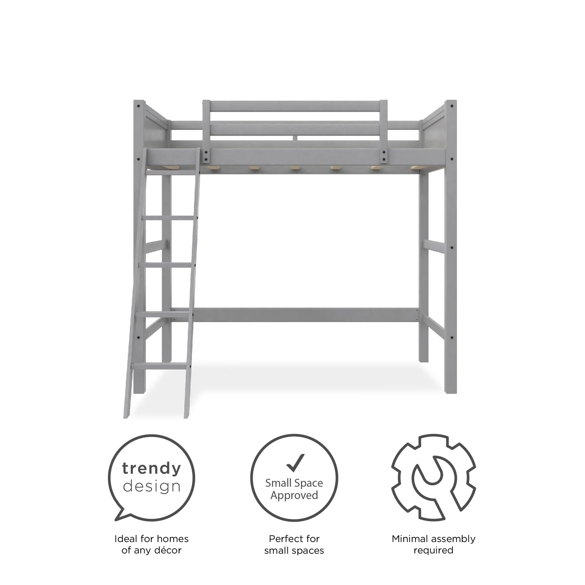- Traditional loft bed frame for kids. Features a sturdy wood construction, a ladder, full-length guardrails and a panel design on both the headboard and footboard.
