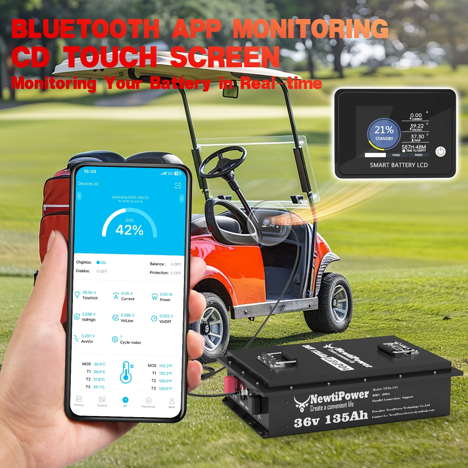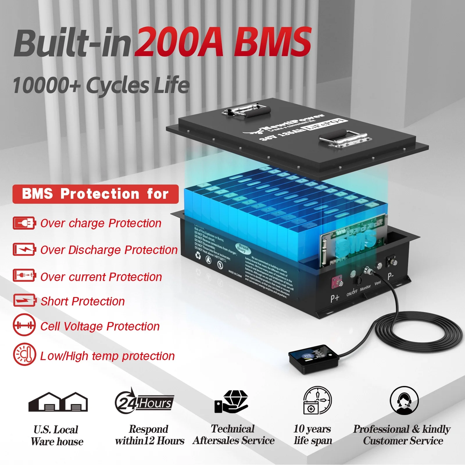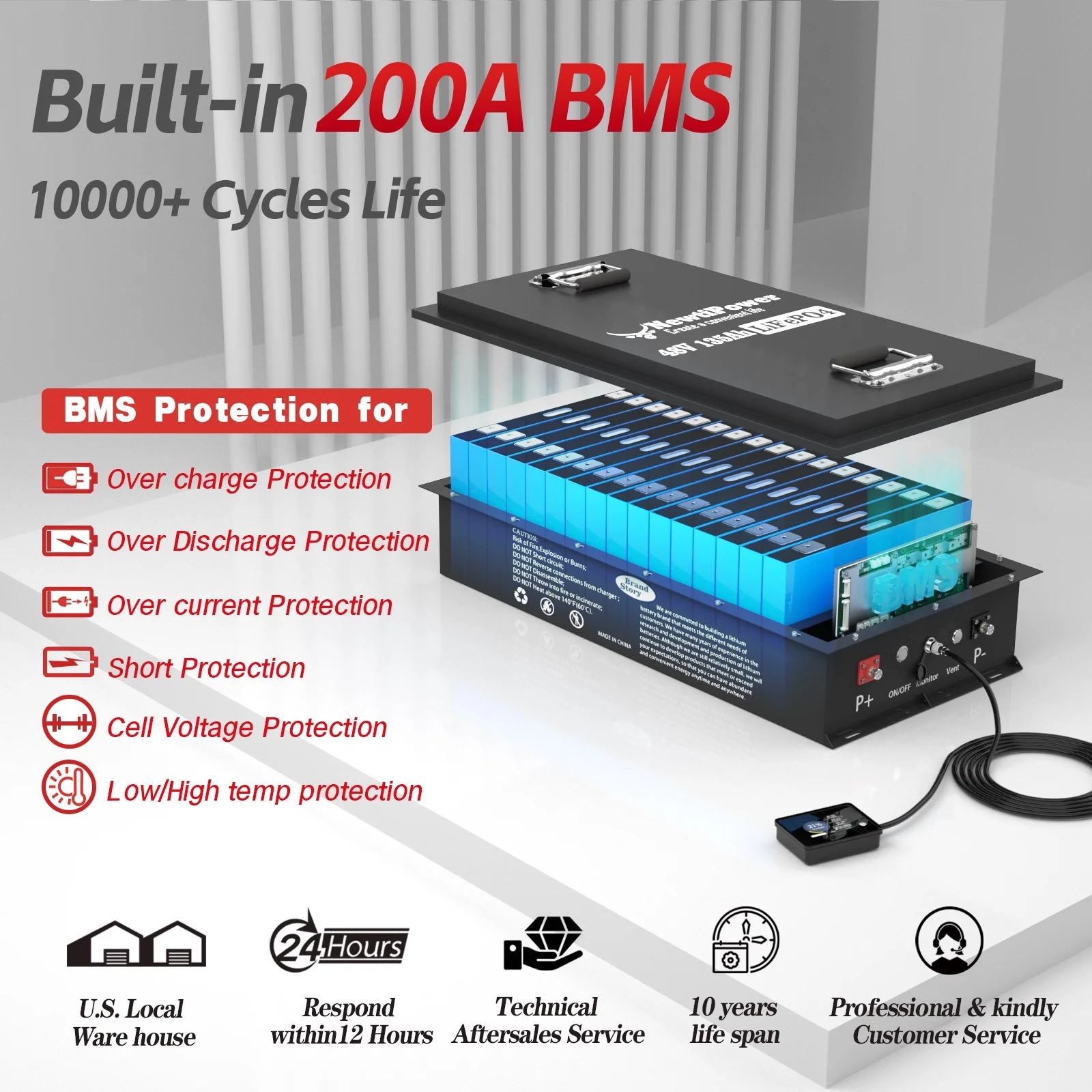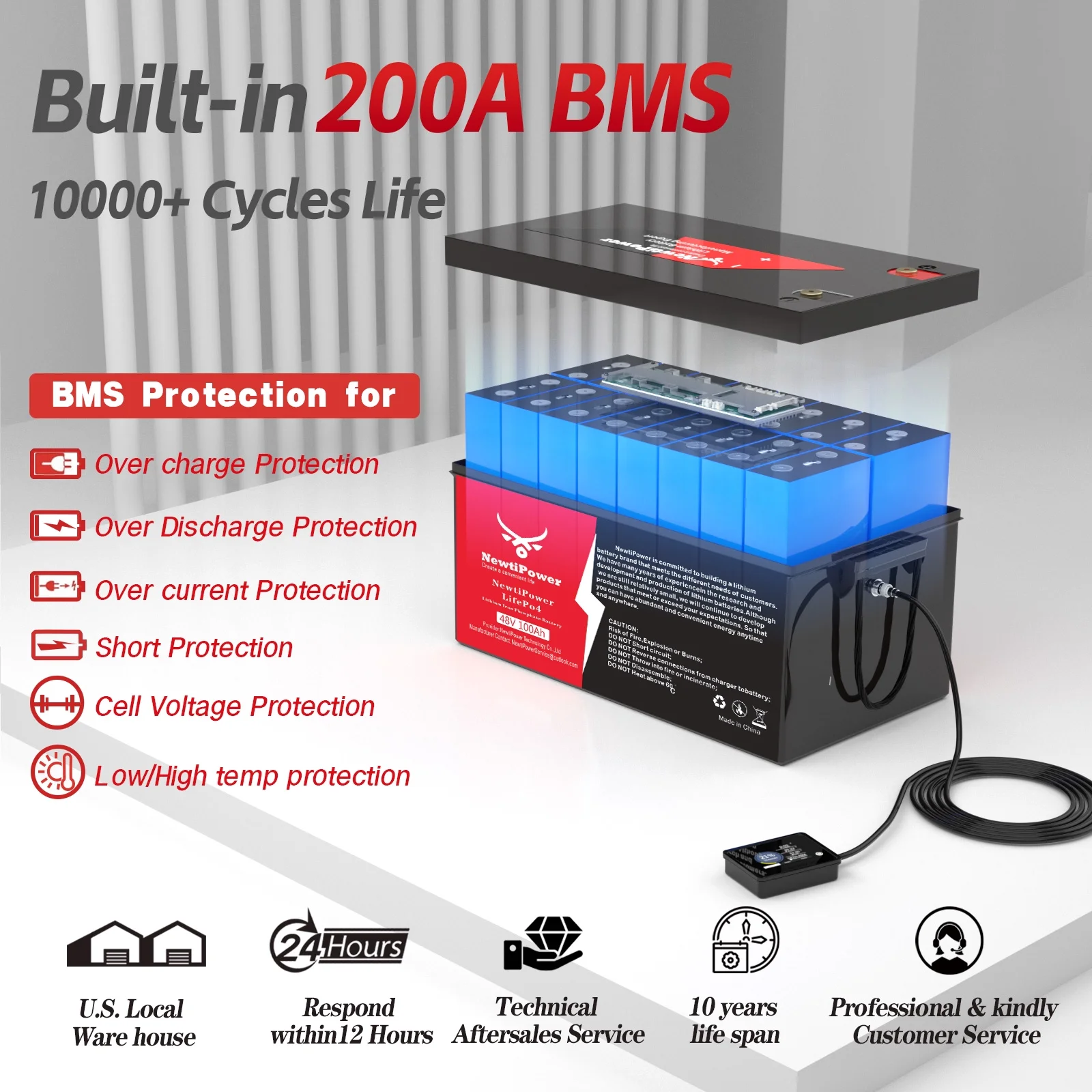 - ��Intelligent Charging Protection��NewtiPower LiFePO4 battery has built-in 200A BMS (500A instantaneous current) to protect the battery from overcharge, overdischarge, overcurrent and short circuit with excellent self discharge rate. Built in temperature protection function, BMS cuts off charging 32�H (0��). High temperature cut-off can prevent charging from exceeding 158 �H (70 ��).Our BMS supports parallel connections, but we recommend not exceeding 5 batteries.