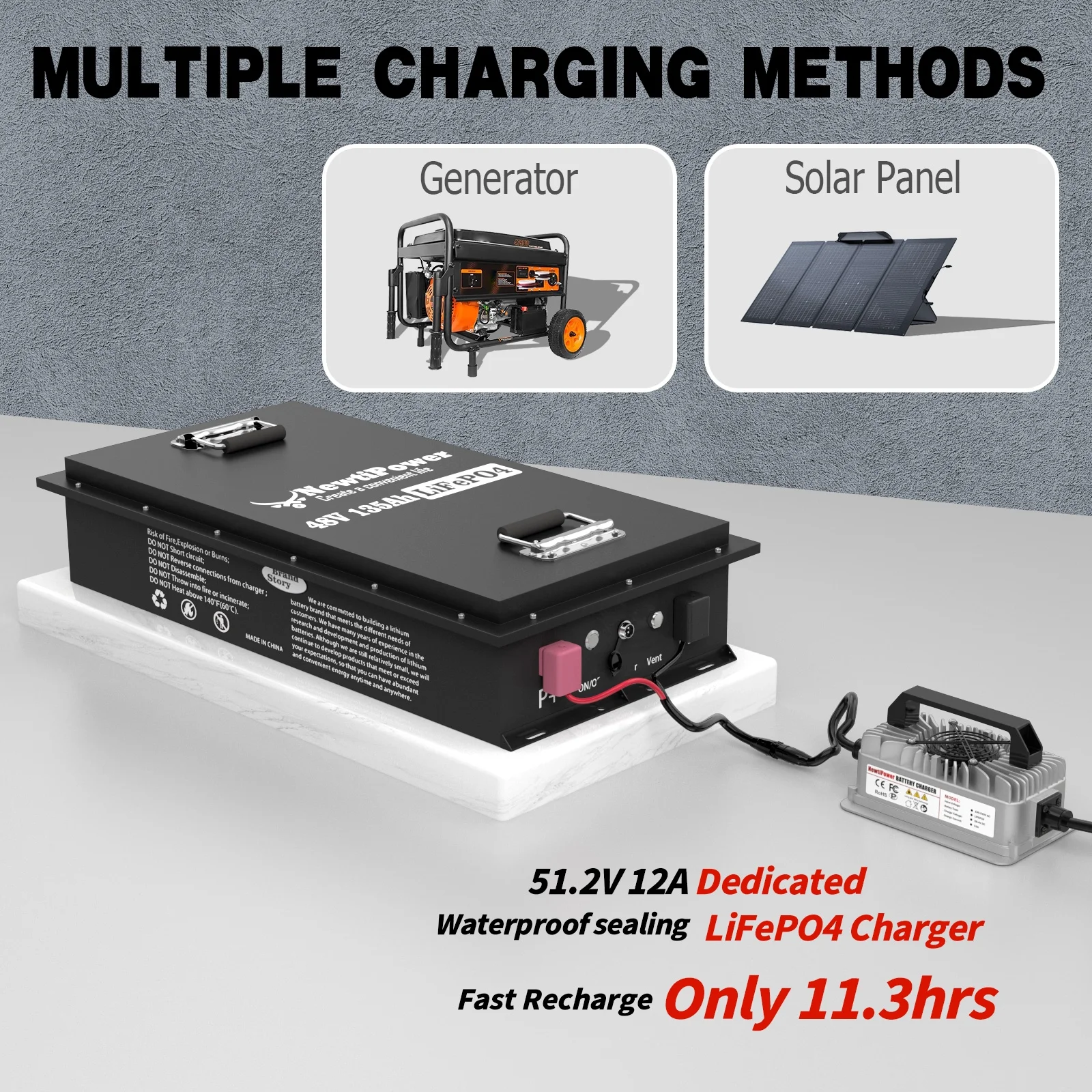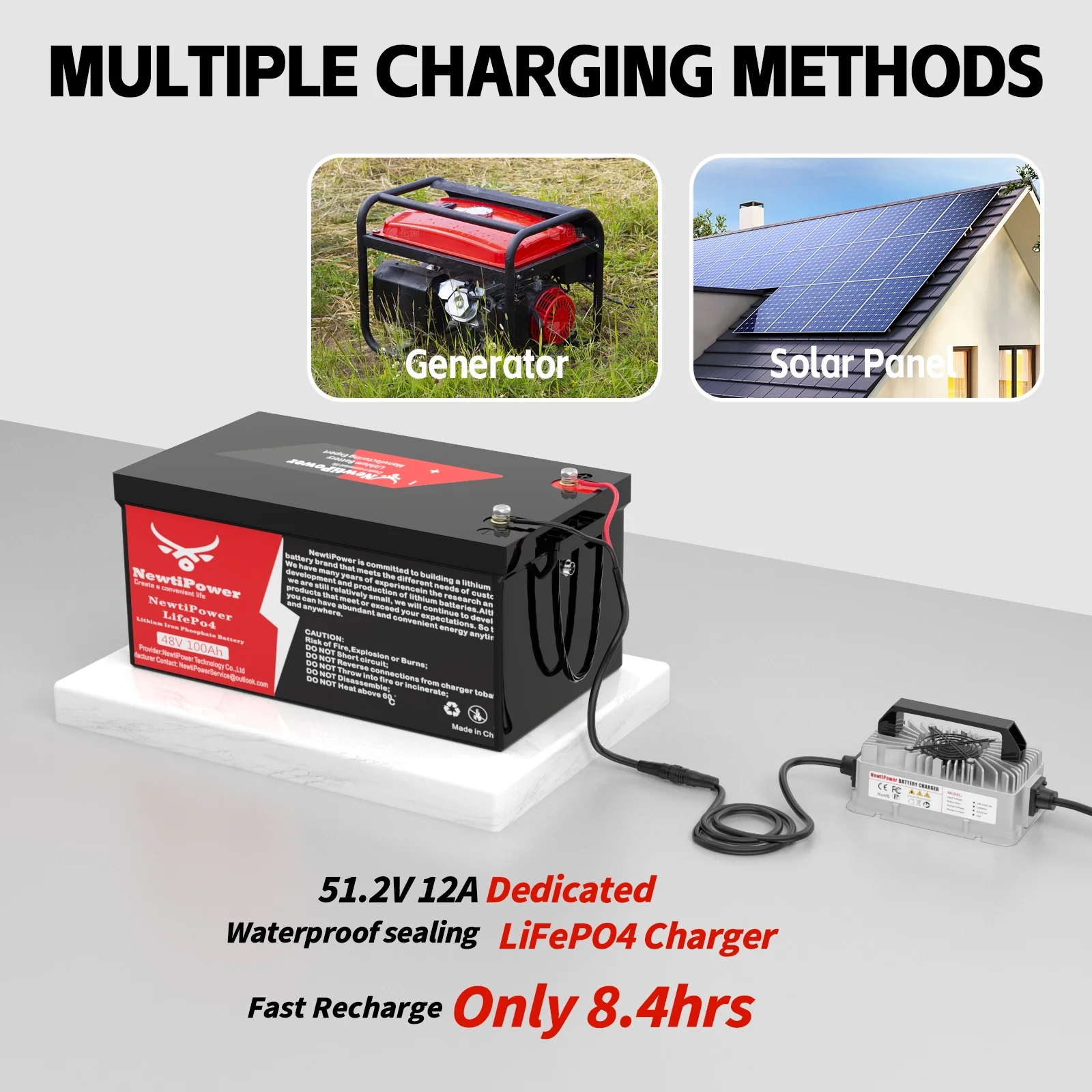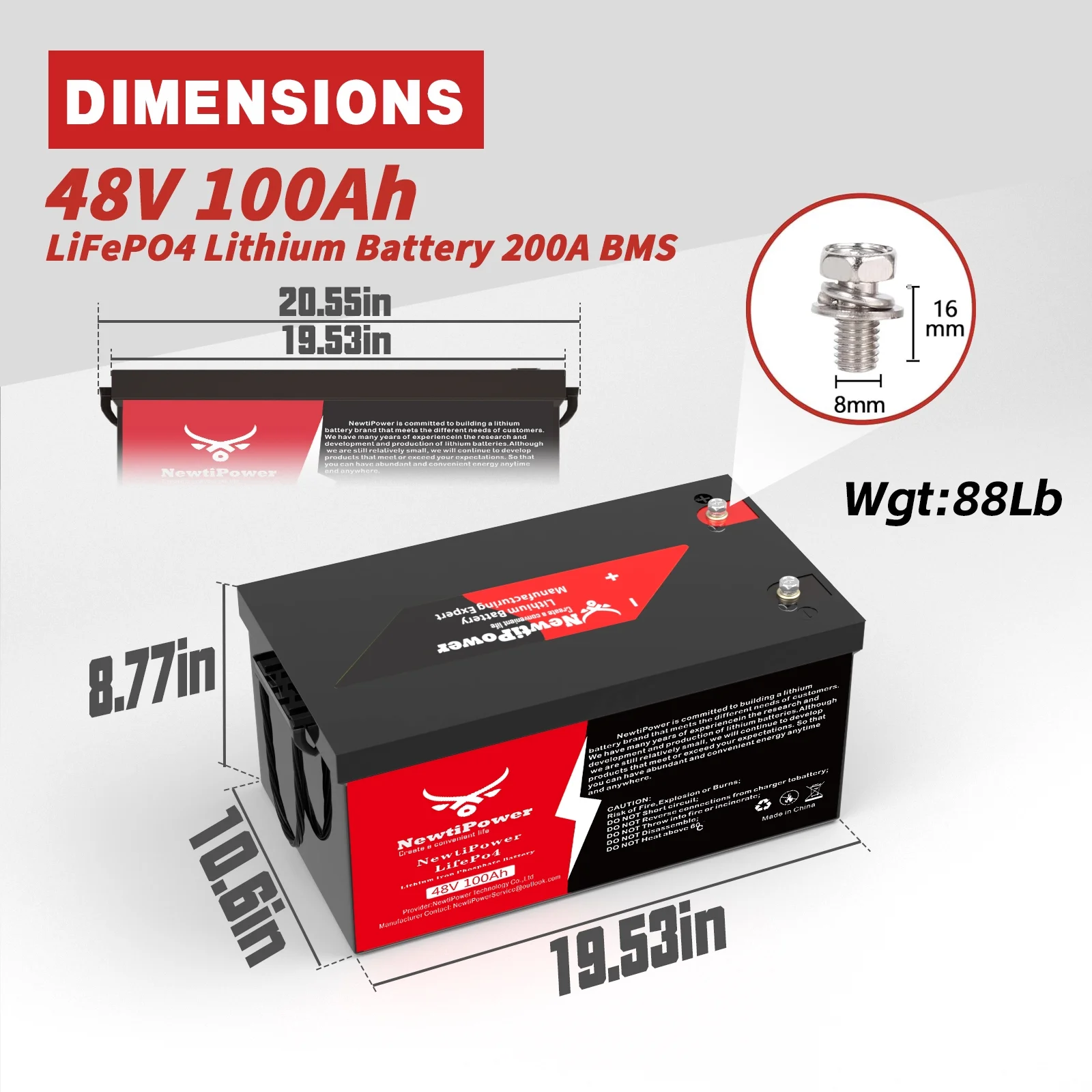 - ��Small Size & 100% Real Capacity��NewtiPower 48V 100Ah lithium iron phosphate battery weighs only 88 lb, half the weight of lead-acid battery and twice the capacity of lead-acid battery. It is easy to move and install. The available capacity of our LiFePO4 battery is 100%, compared with other brands of batteries, which only provide 60% ~ 80% of the capacity. We are not afraid that you test with a capacity test instrument after receiving the battery. We have great confidence in our products!