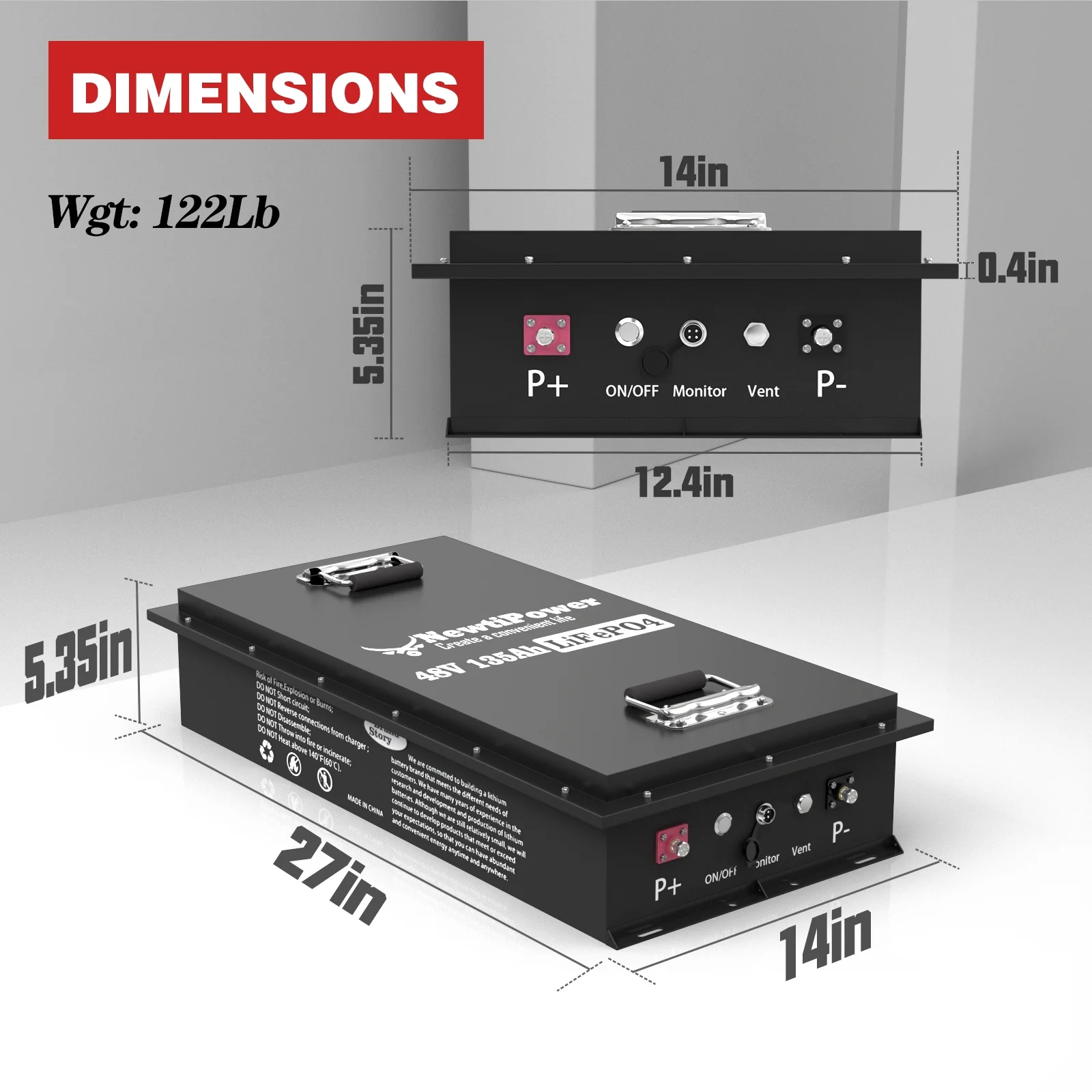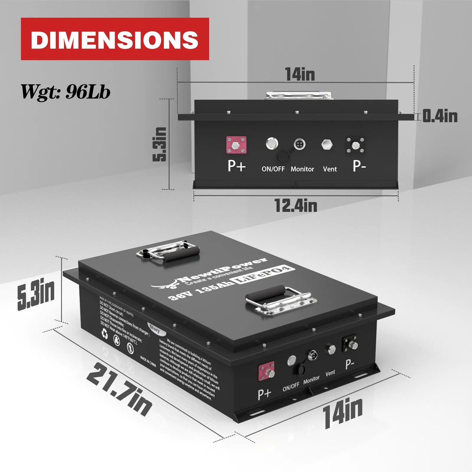 - ��Smaller With Charger&APP&Monitor ��NewtiPower spent one year on developing this Battery and adopting high-quality batteries with higher energy density, with smaller volume(L x W x H):( 18.98 x 10.51 x8.66 Inch) and more battery capacity. We're sure you can't find any battery with the same power and smaller volume as this one.We believe that NewtiPower Lithium Iron Phosphate Battery must be the battery BUT a battery that meets ALL your expectations!Yes!the most Cost-Effective one!