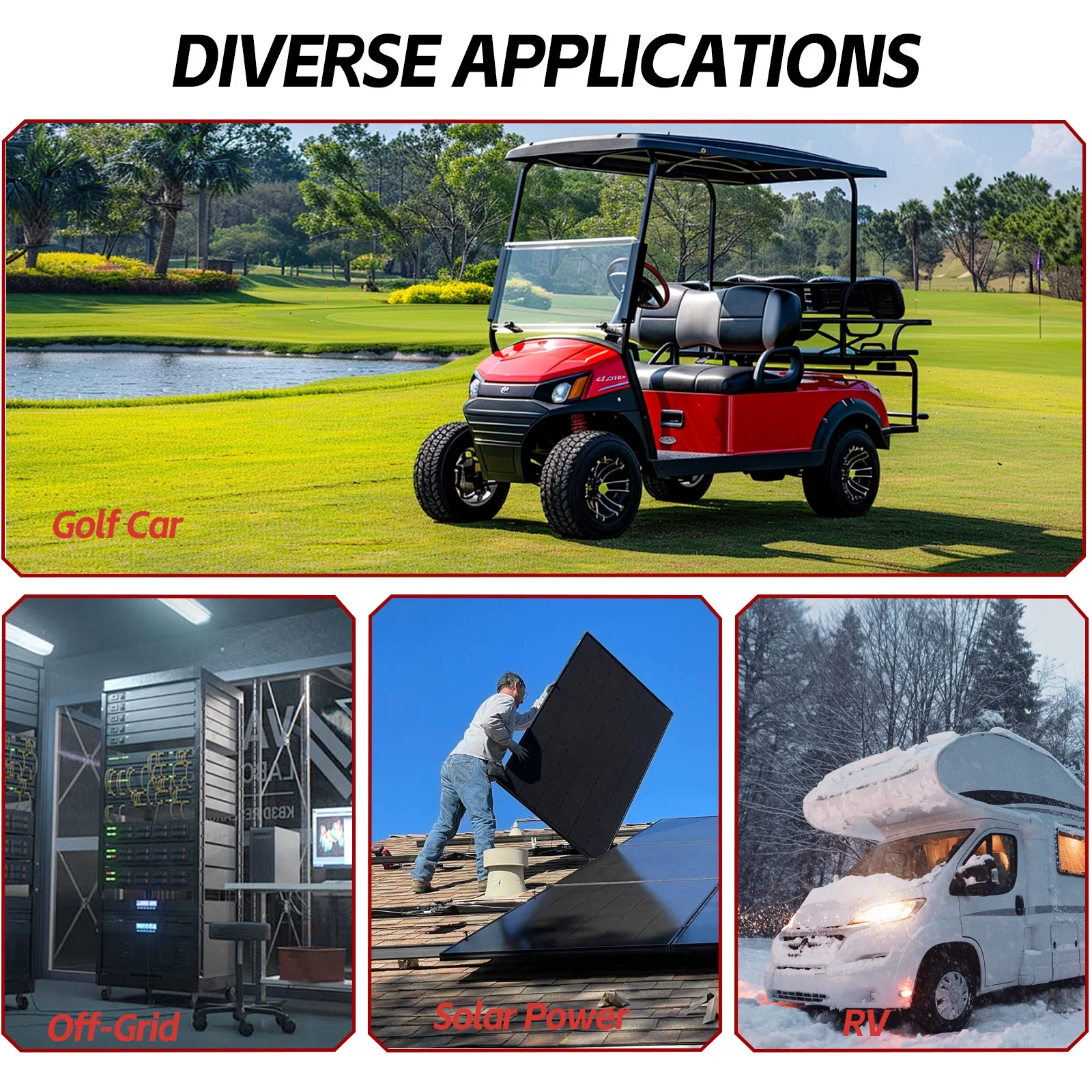 - ��Multiple applications & As Long As You Can Imagine��NewtiPower lithium iron phosphate battery can be used in the following areas: Home energy storage system, UPS backup, lighting, digital/CCTV cameras, portable TV, e-Robot, electric vehicles, DIY loud speaker, 12V router, air pump, fish finder, golf car, trolling motor, motorhome/RV & camper, Houseboat, Travel Trailer, Dump Trailer and more. In a word, where you need electricity, you can use it! (Please note the output DC voltage is 12V)