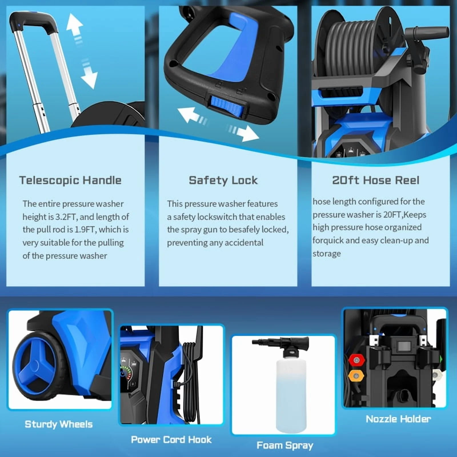 - TELESCOPIC ALUMINUM HANDLE: We have also upgraded the handle to make it be more humane. The new handle adopts a retractable aluminum handle, which can be adjusted according to the height of the user and is suitable for all kinds of people. In addition, two large wheels will also help you carry and transport easily. The 16.3-foot-long cable and 20-foot-long hose can reach anywhere, such as courtyards, streets, balconies, garages, etc.