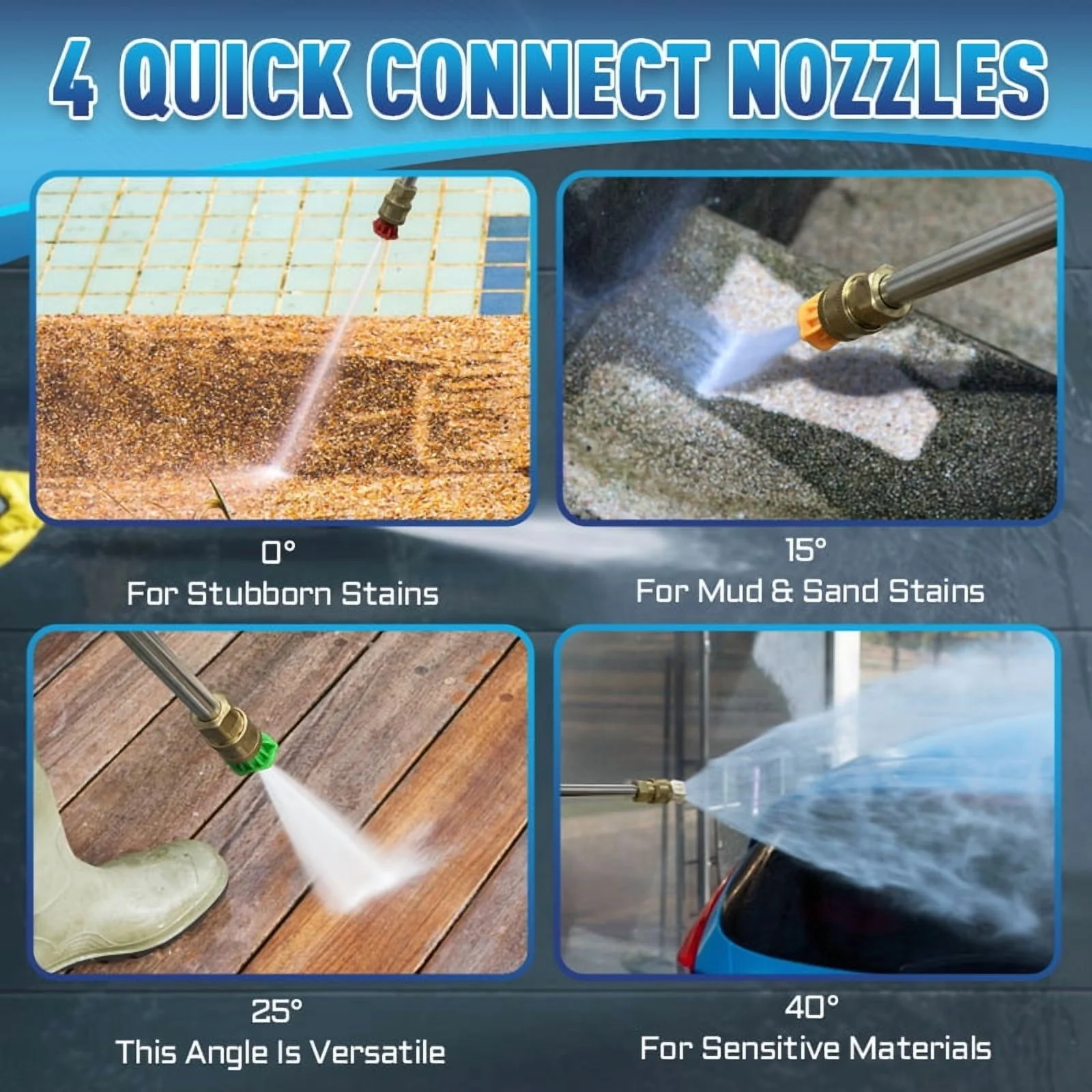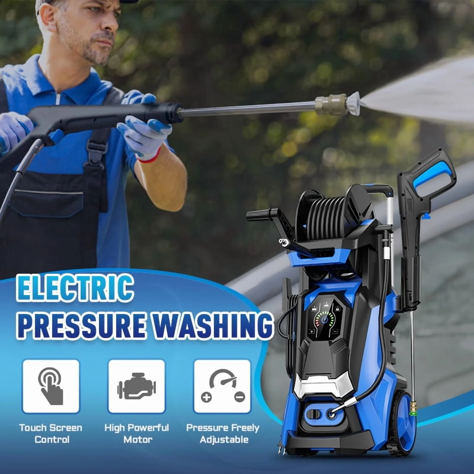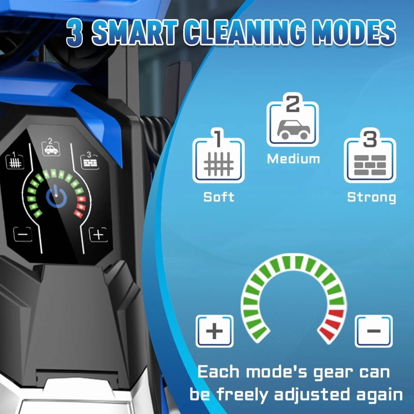- TOUCHSCREEN PRESSURE CLEANER: Considering into more intelligence, our R&D team has upgraded the washing machine uses a touch screen. It provides three gears(Soft, Medium and Strong), Easily uses +/- buttons to control different levels of pressure, we also provide a soap bottle and 4 different nozzles (0 ��, 15��, 25��, and 40��), you can adjust to the pressure you want according to your needs to complete any cleaning work.