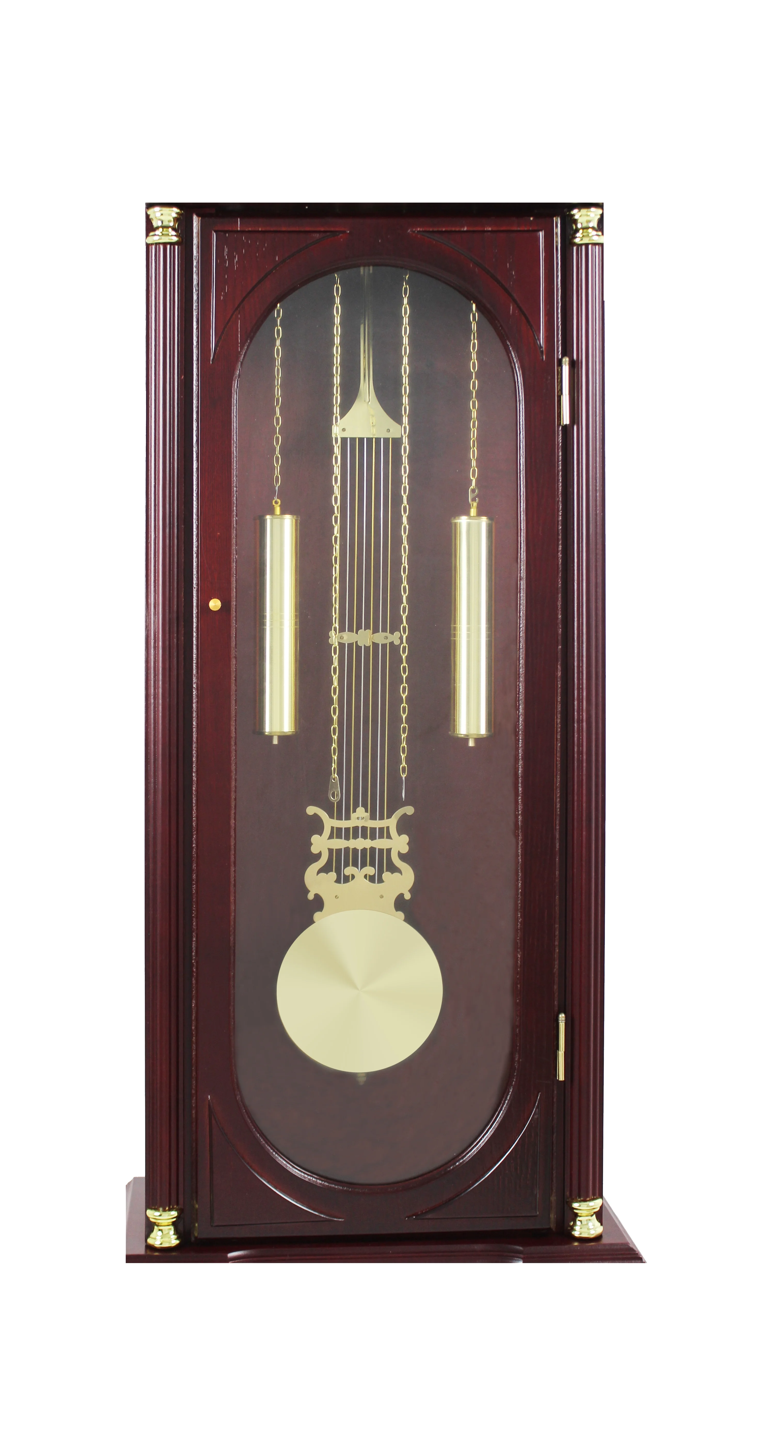 - Oval Glass Door Encases a Polished Elegant Metal Lyre Pendulum