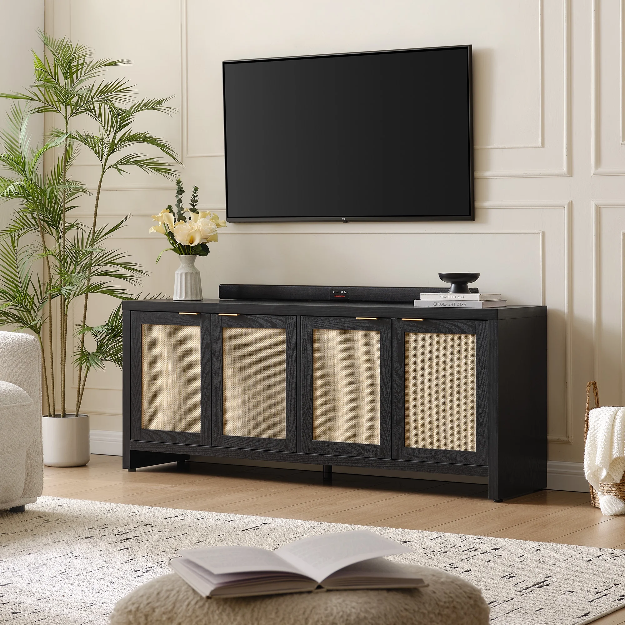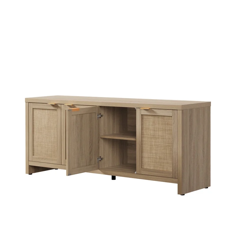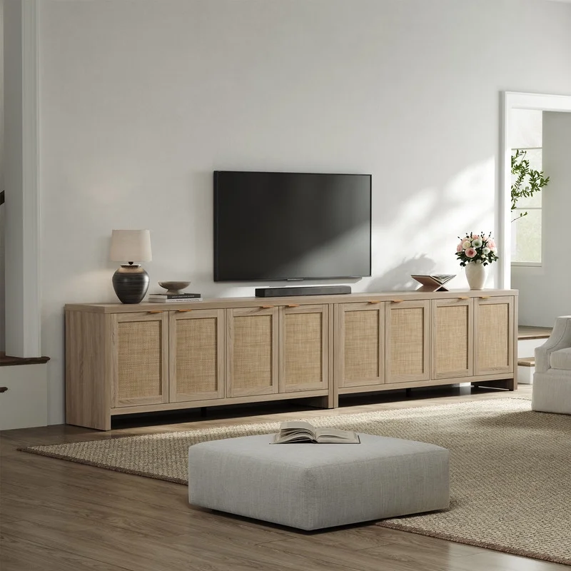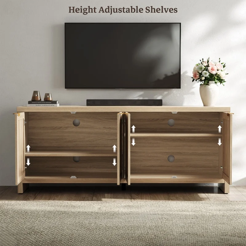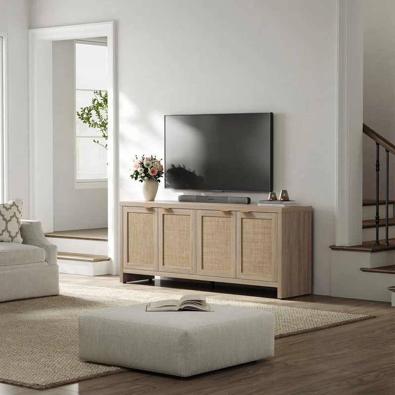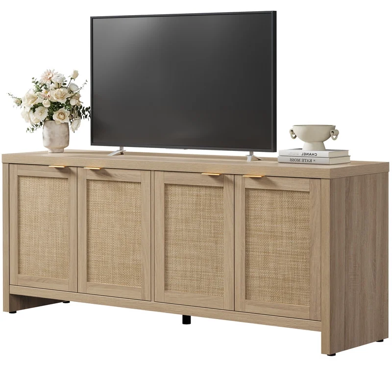 Rattan TV stand, farmhouse media console, boho TV cabinet, 65-inch TV stand with storage, adjustable shelves TV stand, rustic living room furniture, cable management TV stand, sturdy entertainment center.