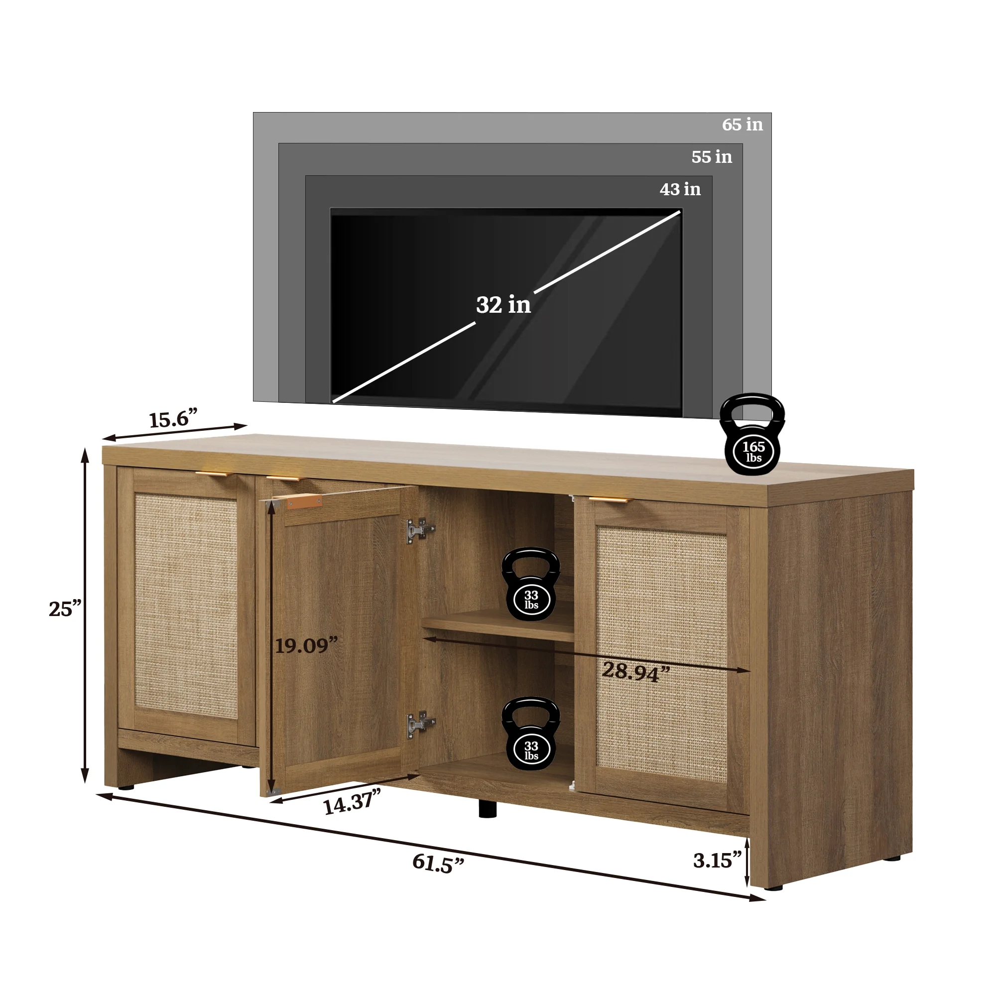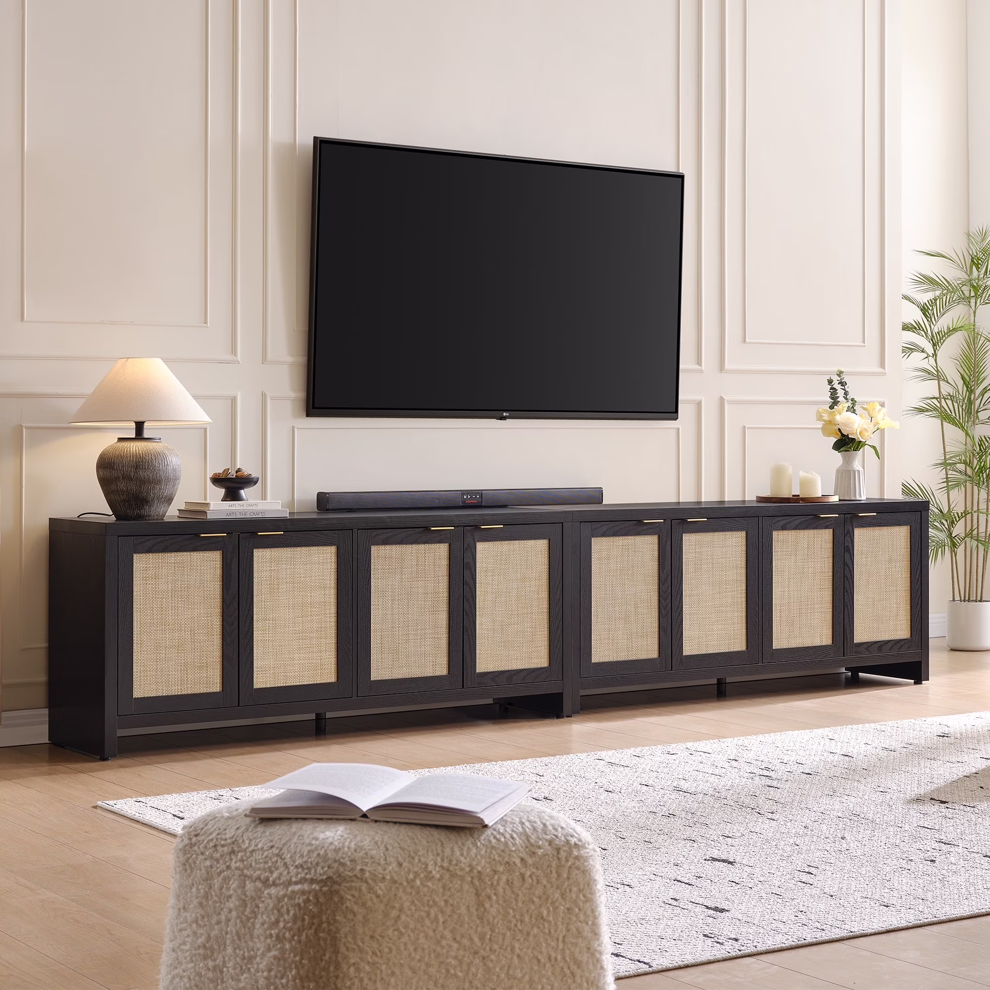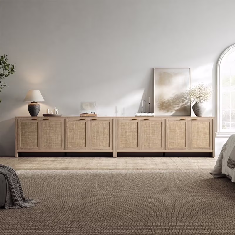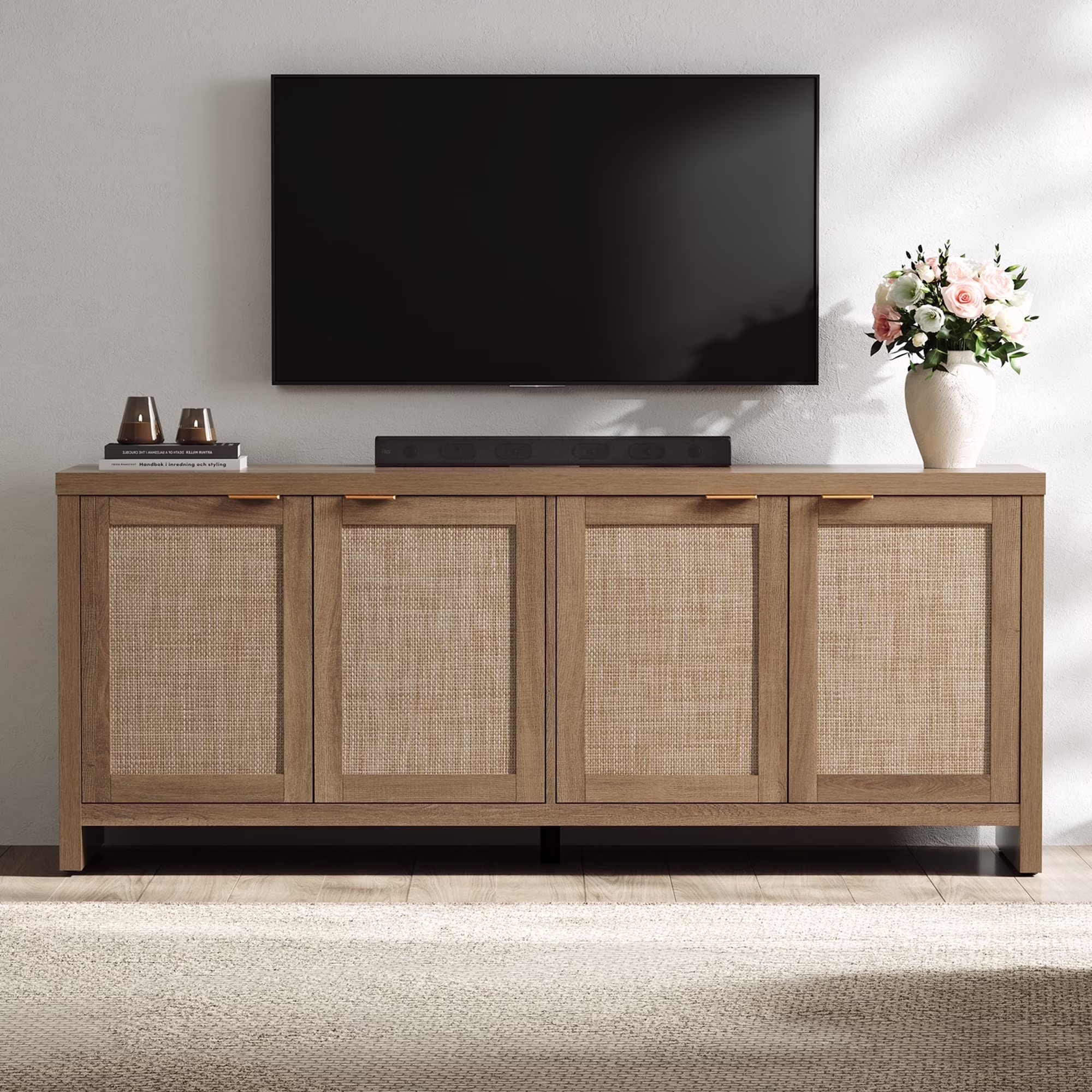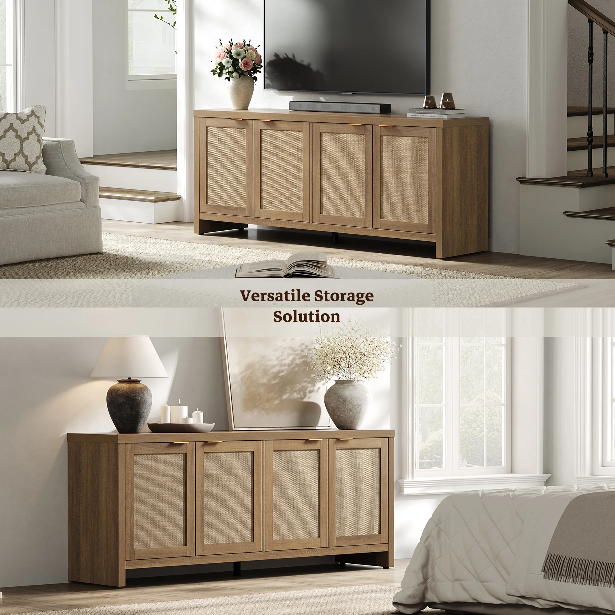 Rattan TV stand, farmhouse media console, boho TV cabinet, 65-inch TV stand with storage, adjustable shelves TV stand, rustic living room furniture, cable management TV stand, sturdy entertainment center.